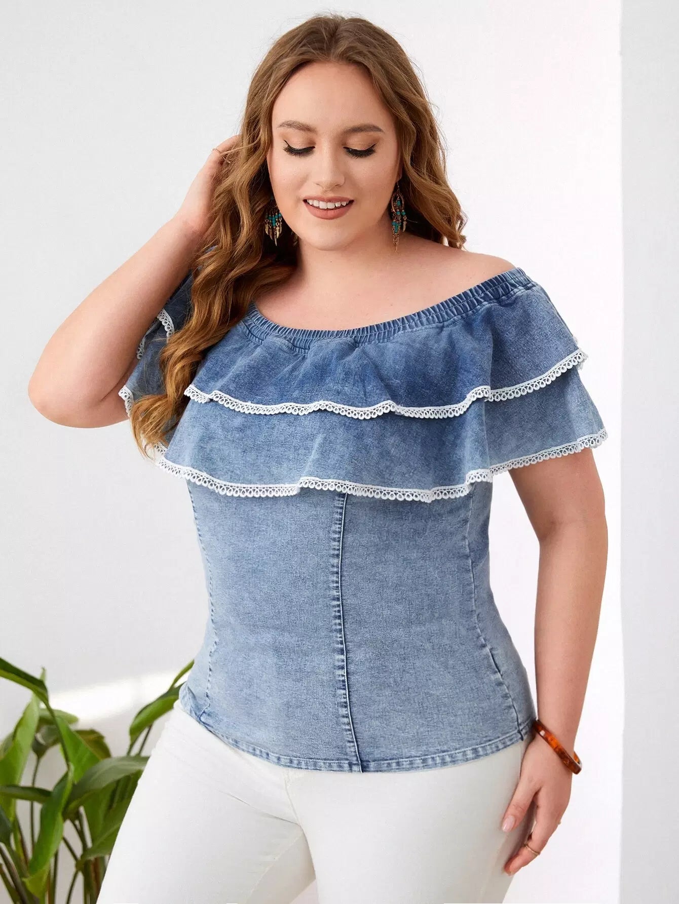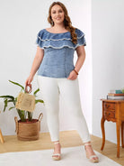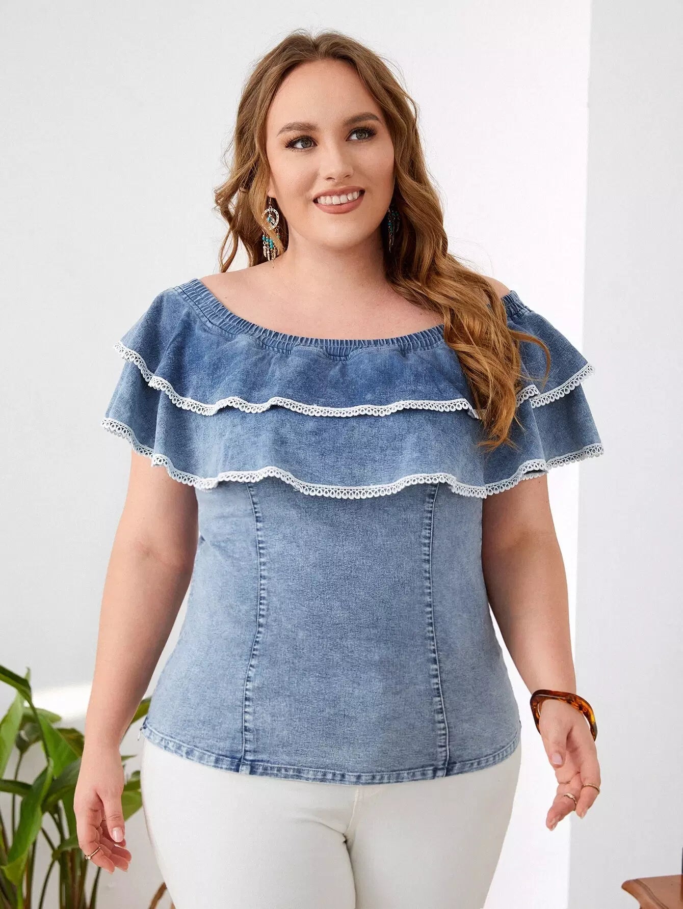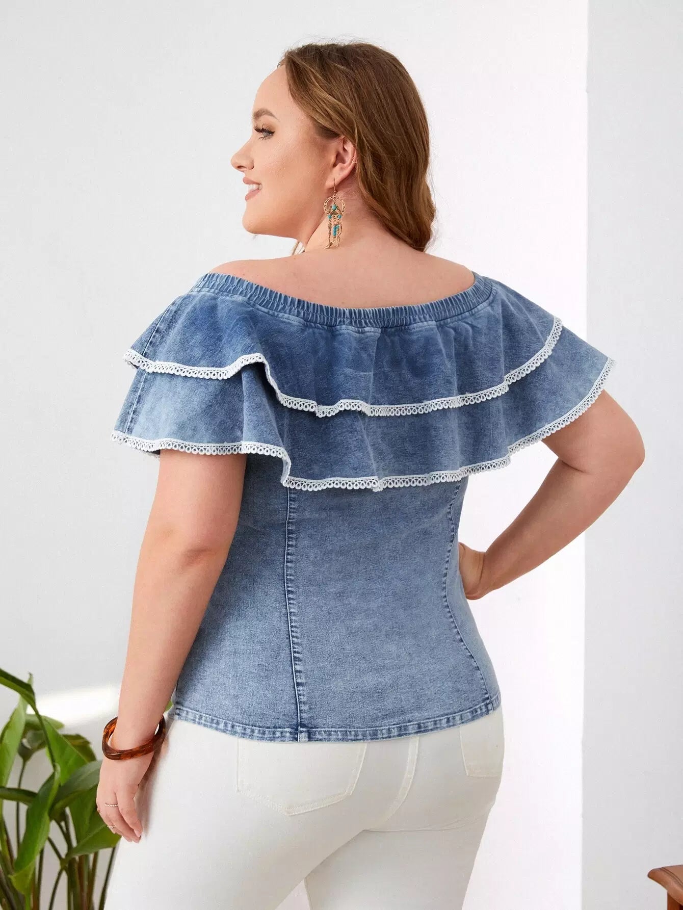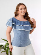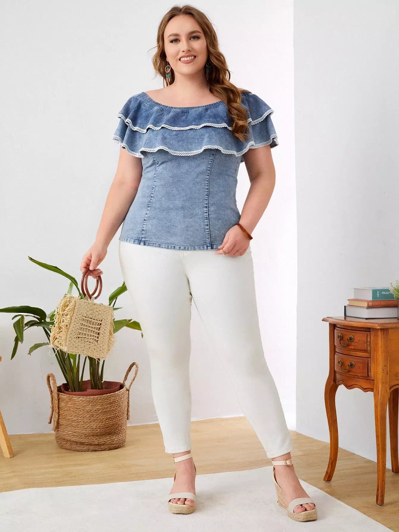 بلوزة دنيم مكشكشة بطبقات متعددة من الكشكش على الأكتاف