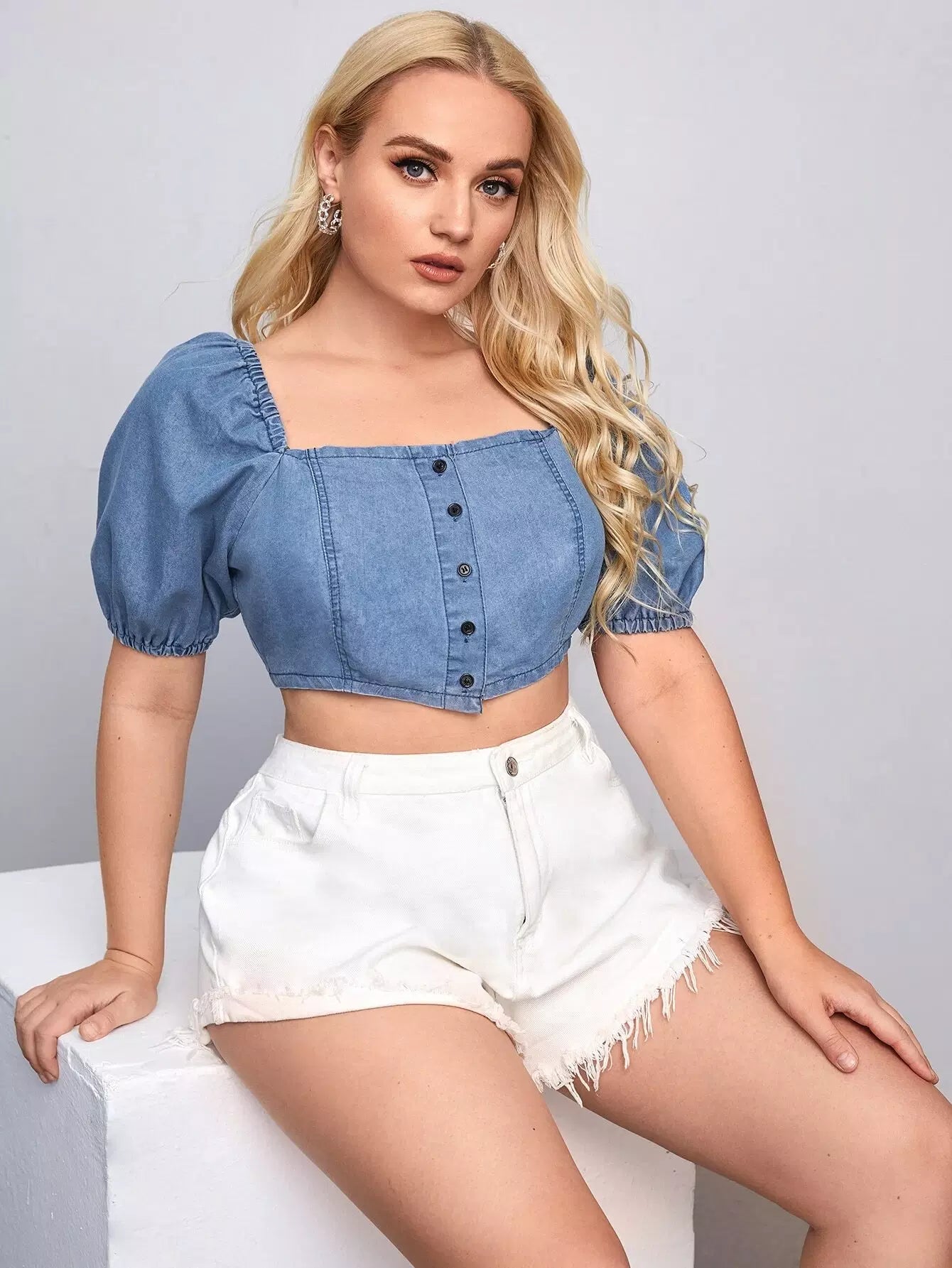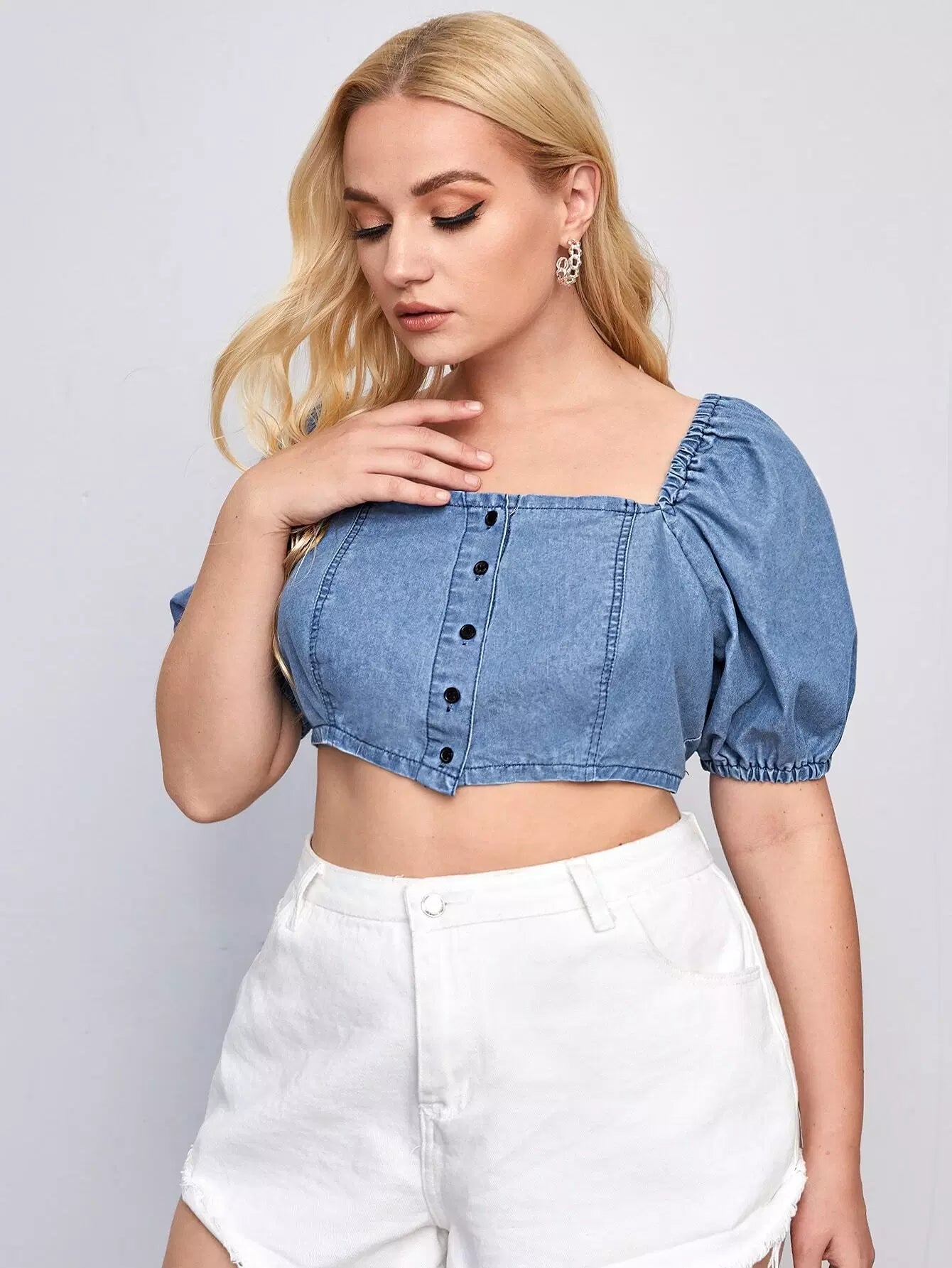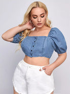 نحيف - مقاس كبير بلوزة من الدينيم بأكمام منتفخة وأزرار أمامية