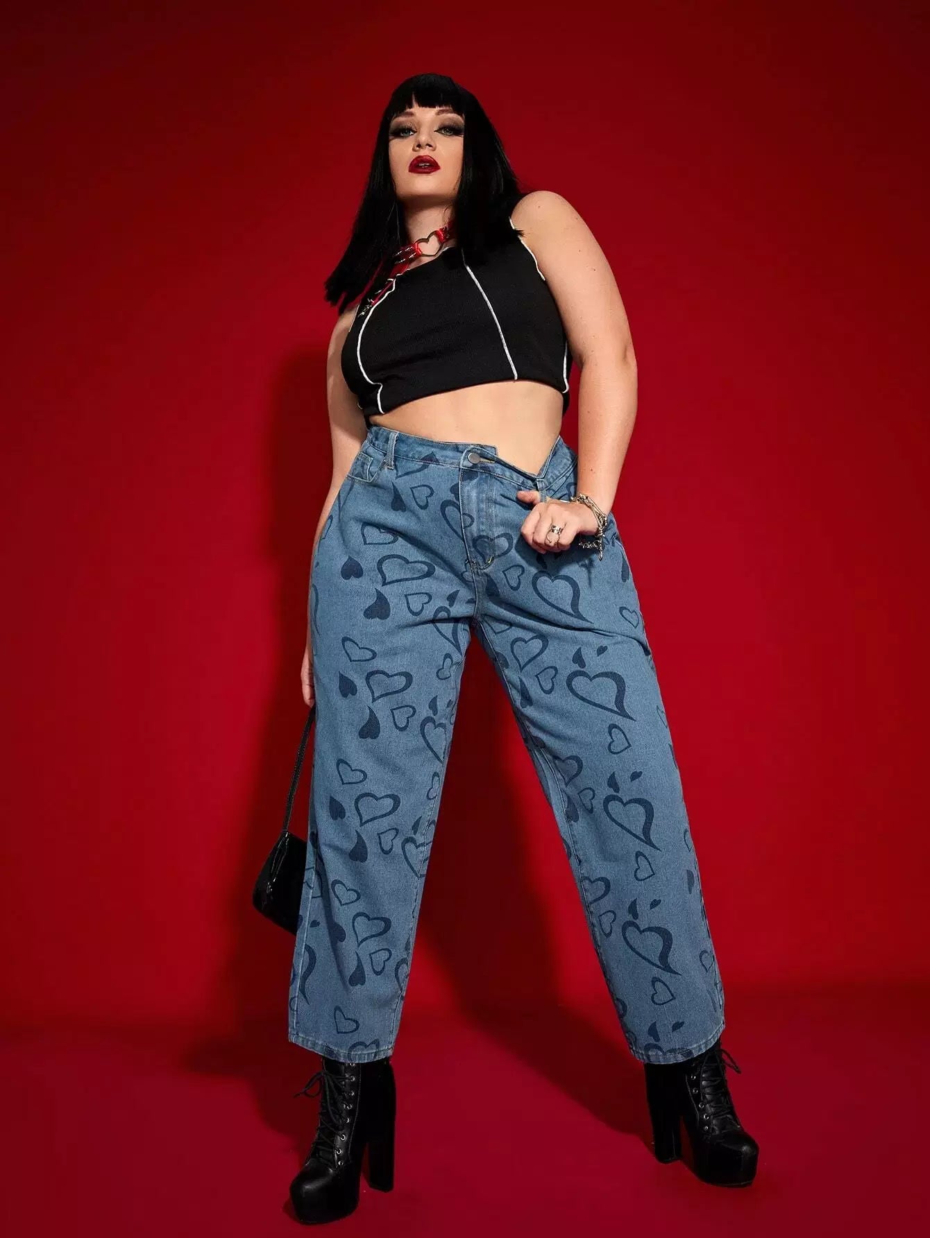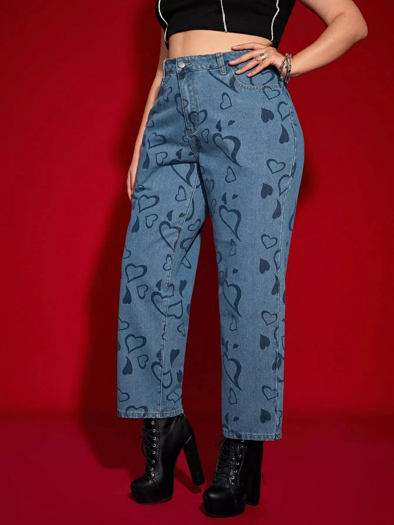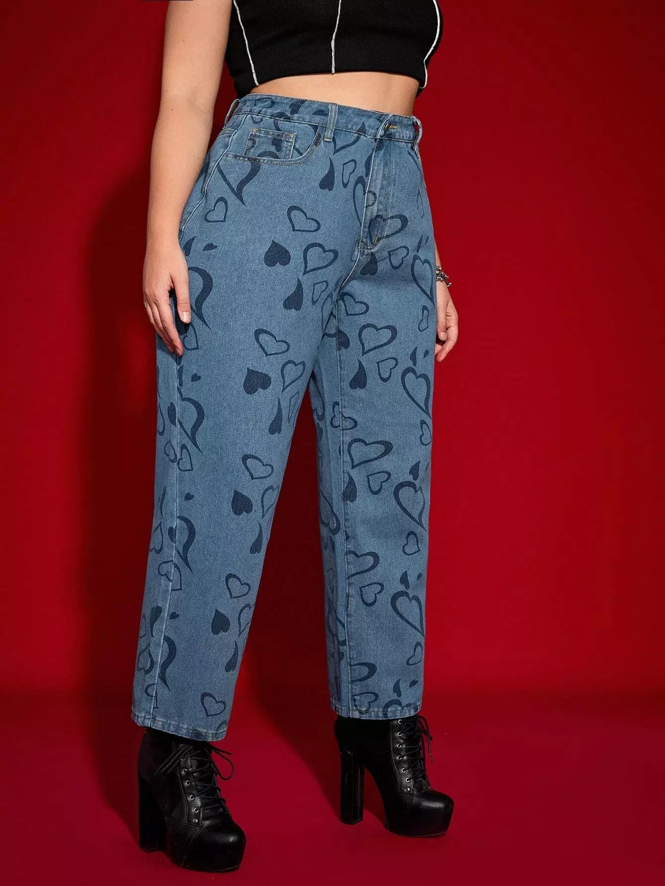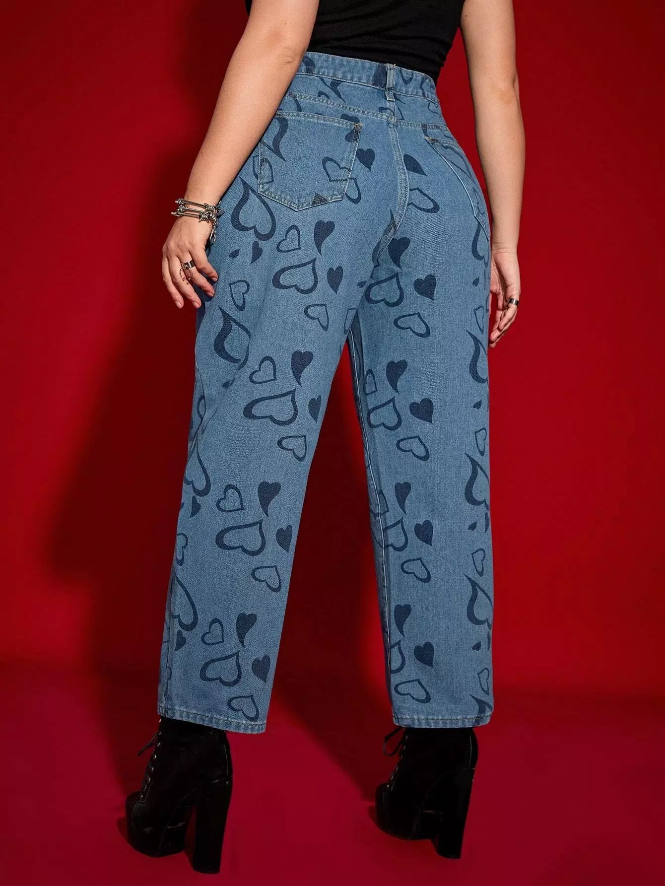 بنطال جينز بطبعة قلب بخصر عالٍ زائد
