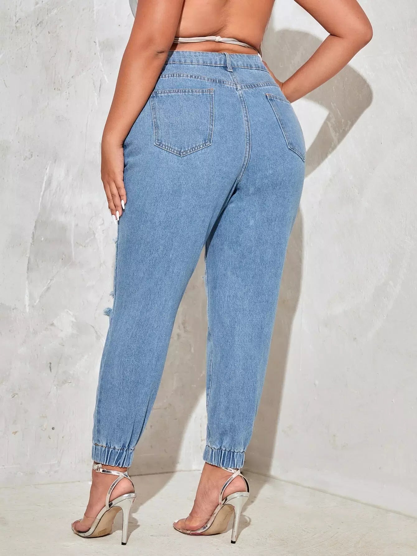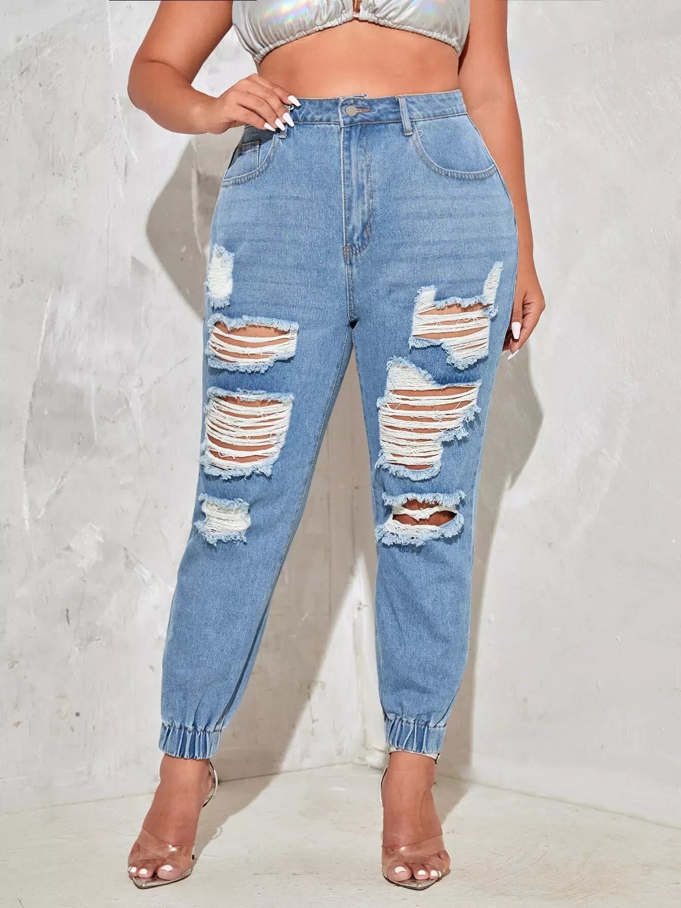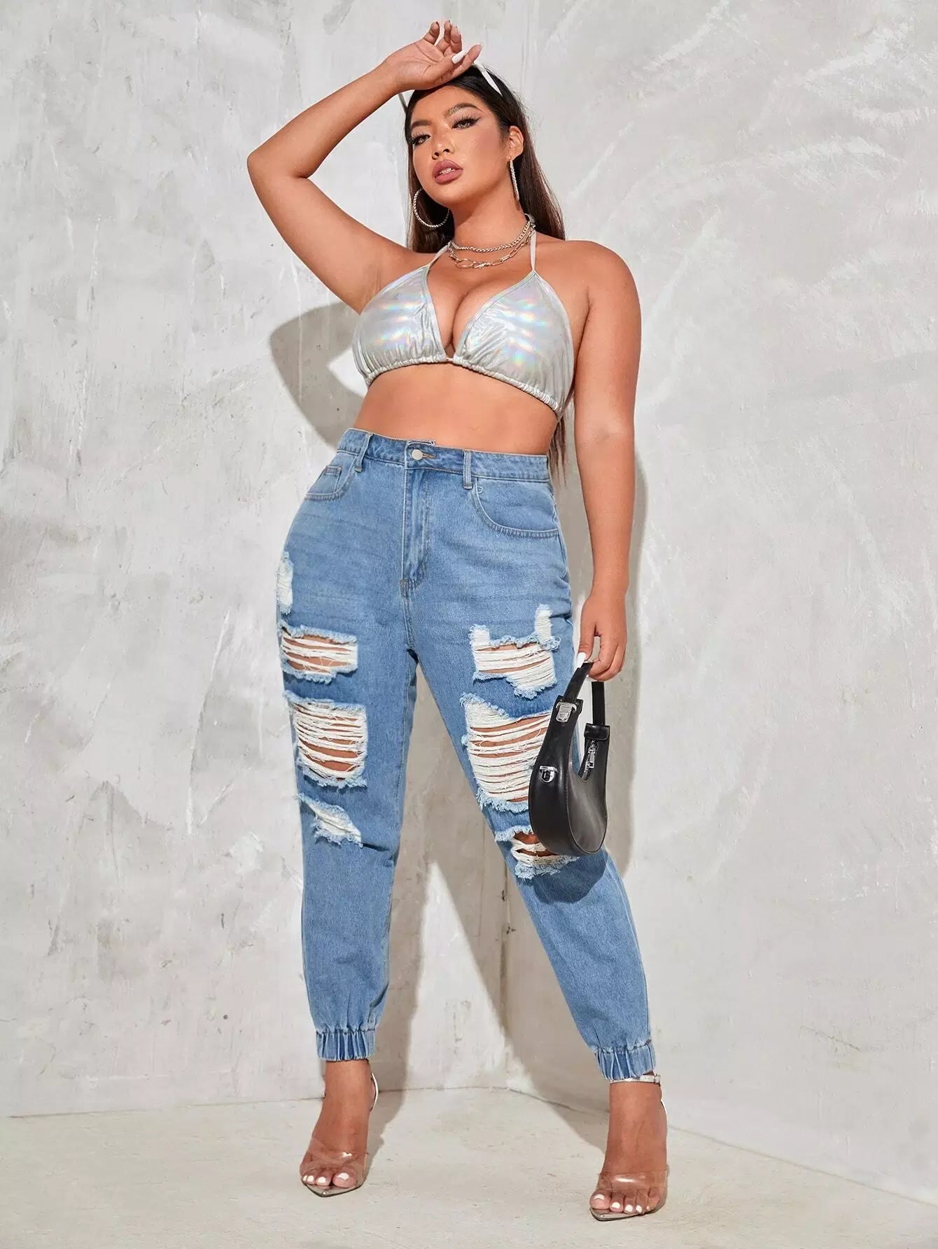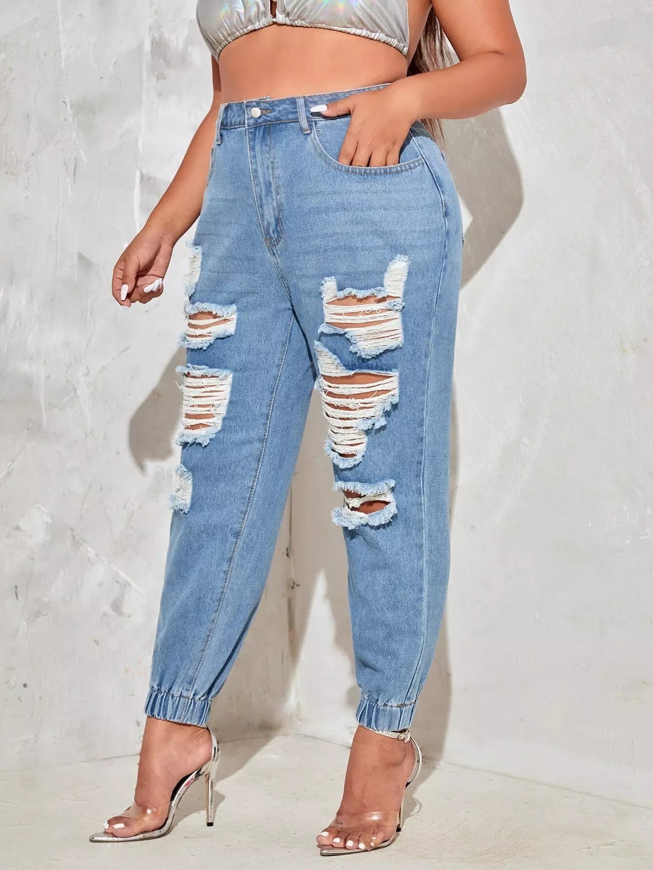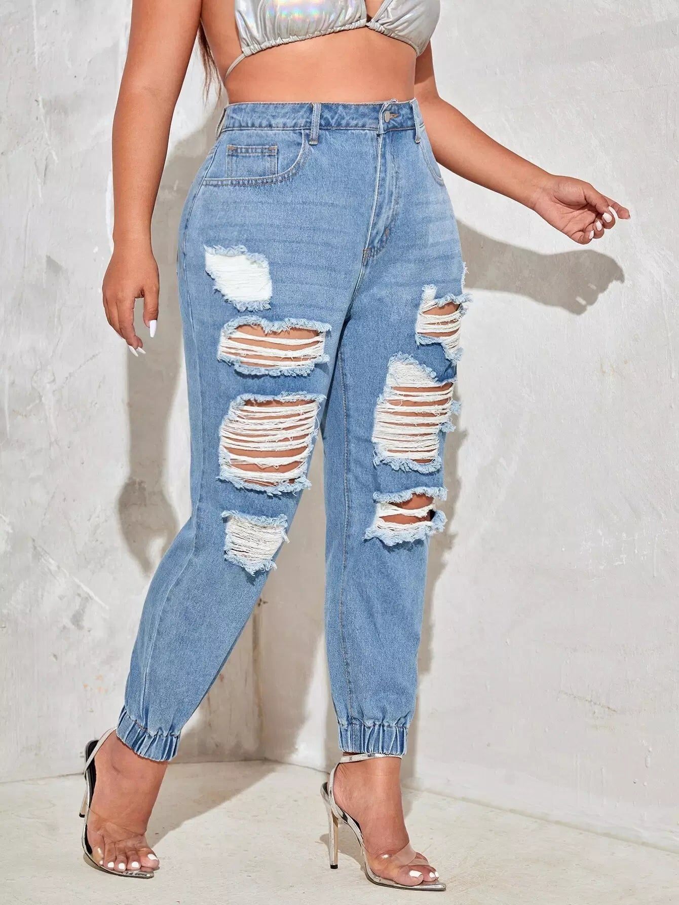 بنطلون جينز ممزق بخصر عالٍ ممزق ممزق