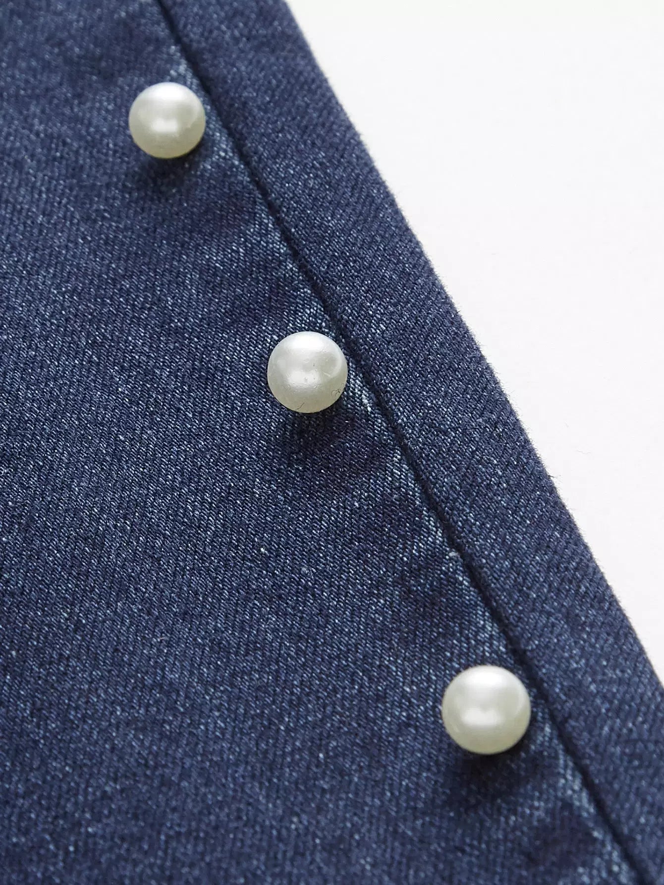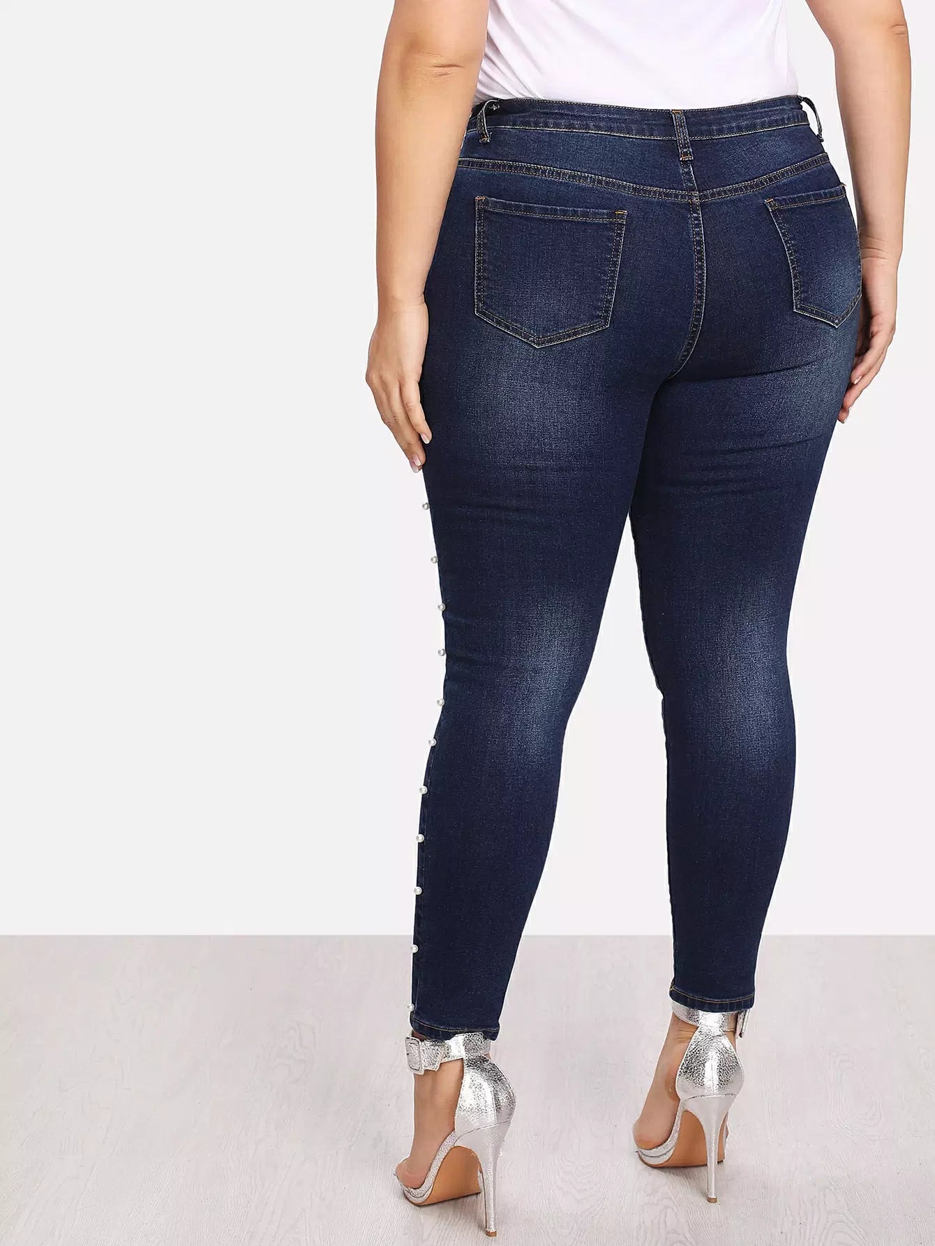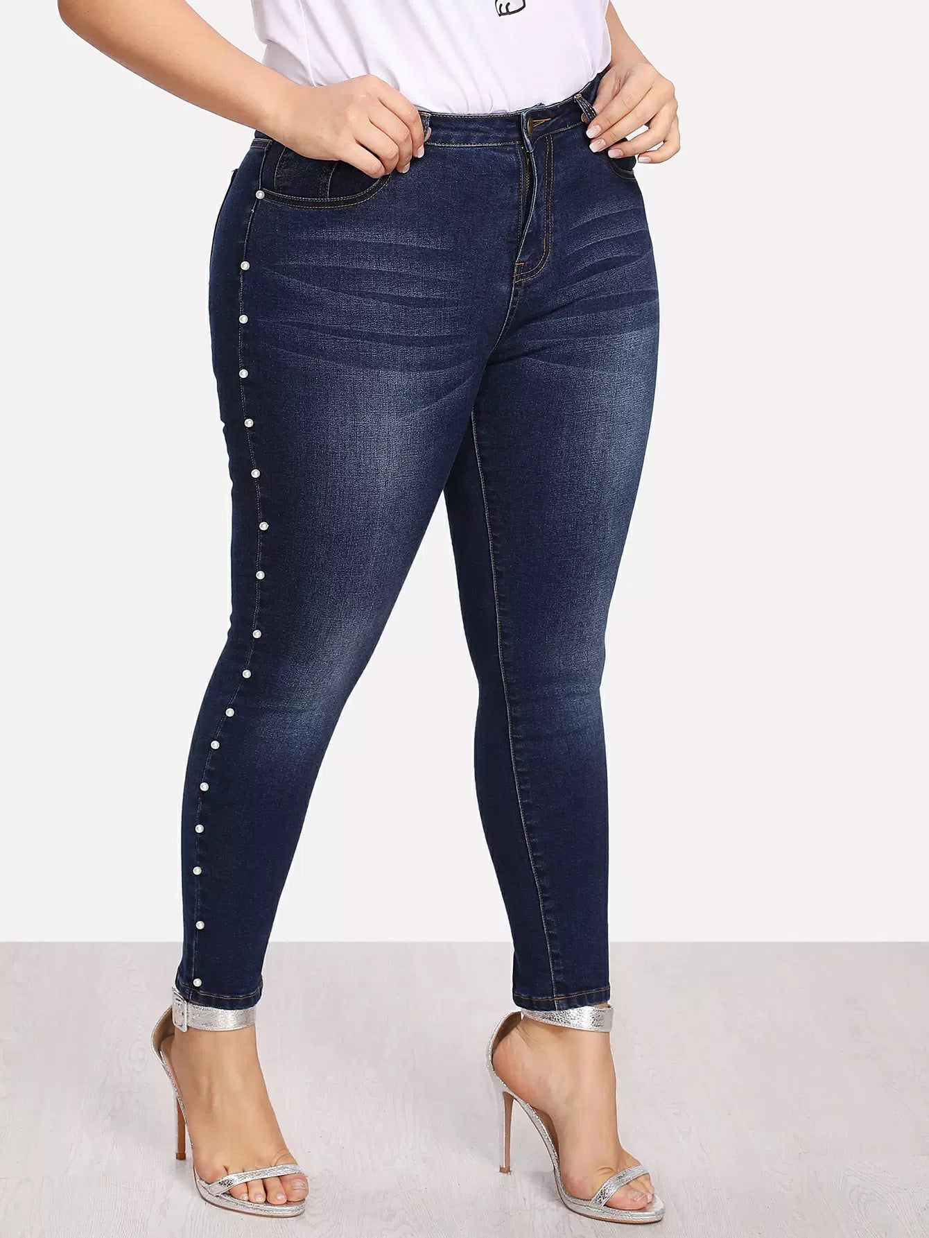 بنطلون جينز بتفاصيل لؤلؤة زائد مغسول باللون الأبيض