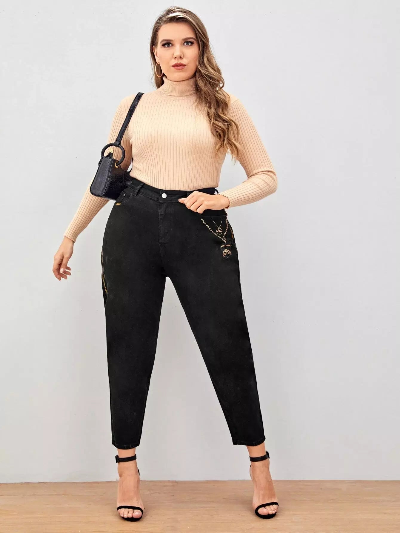 بنطلون جينز قصير مزين بأحجار الراين بلس مزيّن بأحجار الراين