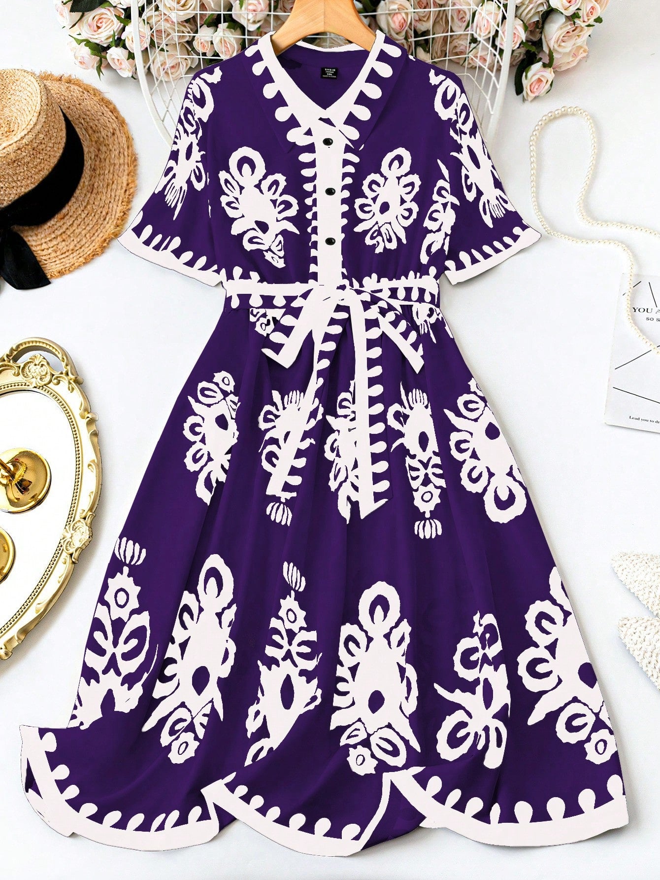 Breezaya Women Plus Size Printed Half-Open Collar Tie Waist Elastic Waist Shift Dress