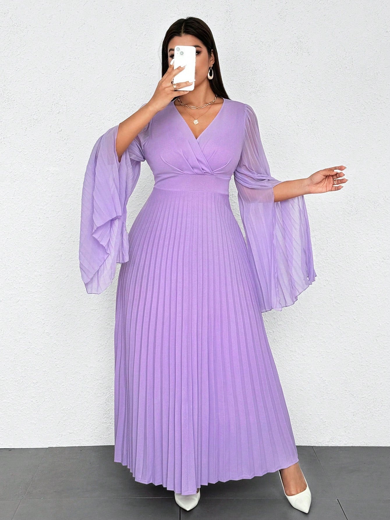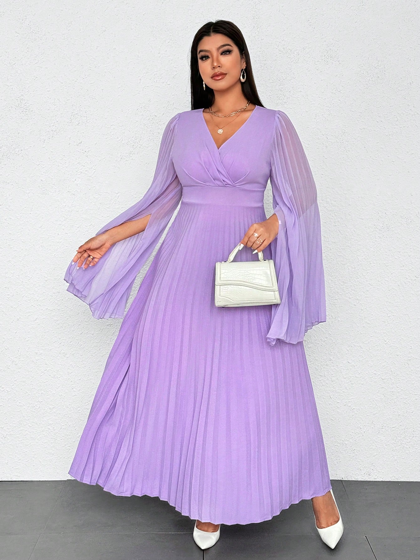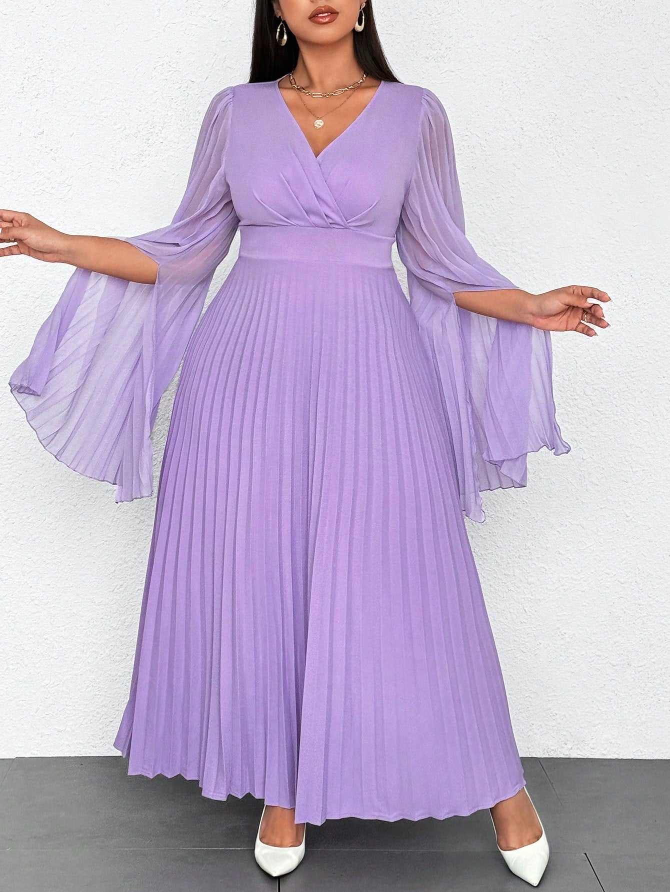 Celure Plus Size Women Elegant Romantic V-Neck Pleated Open Slit Long Sleeve Dress Maxi Women Outfit