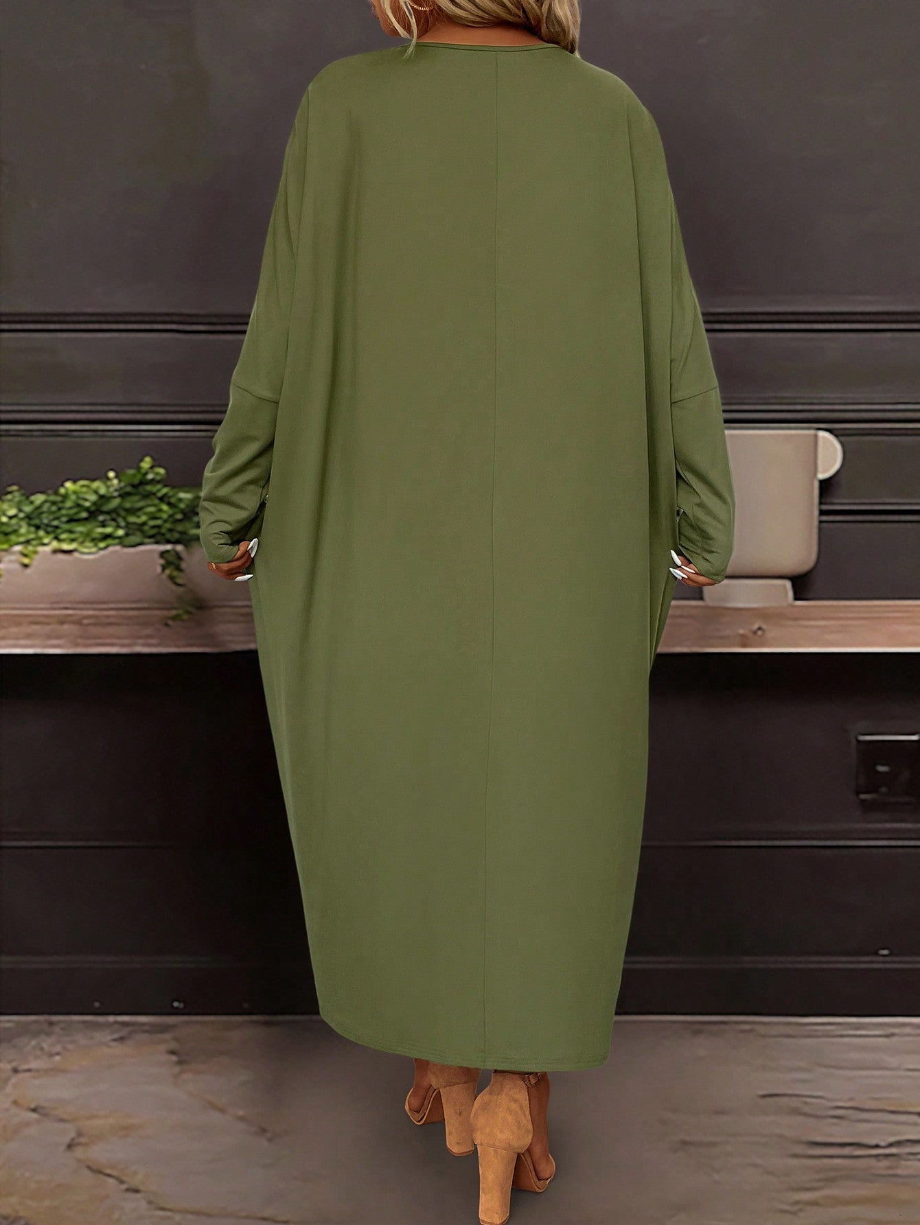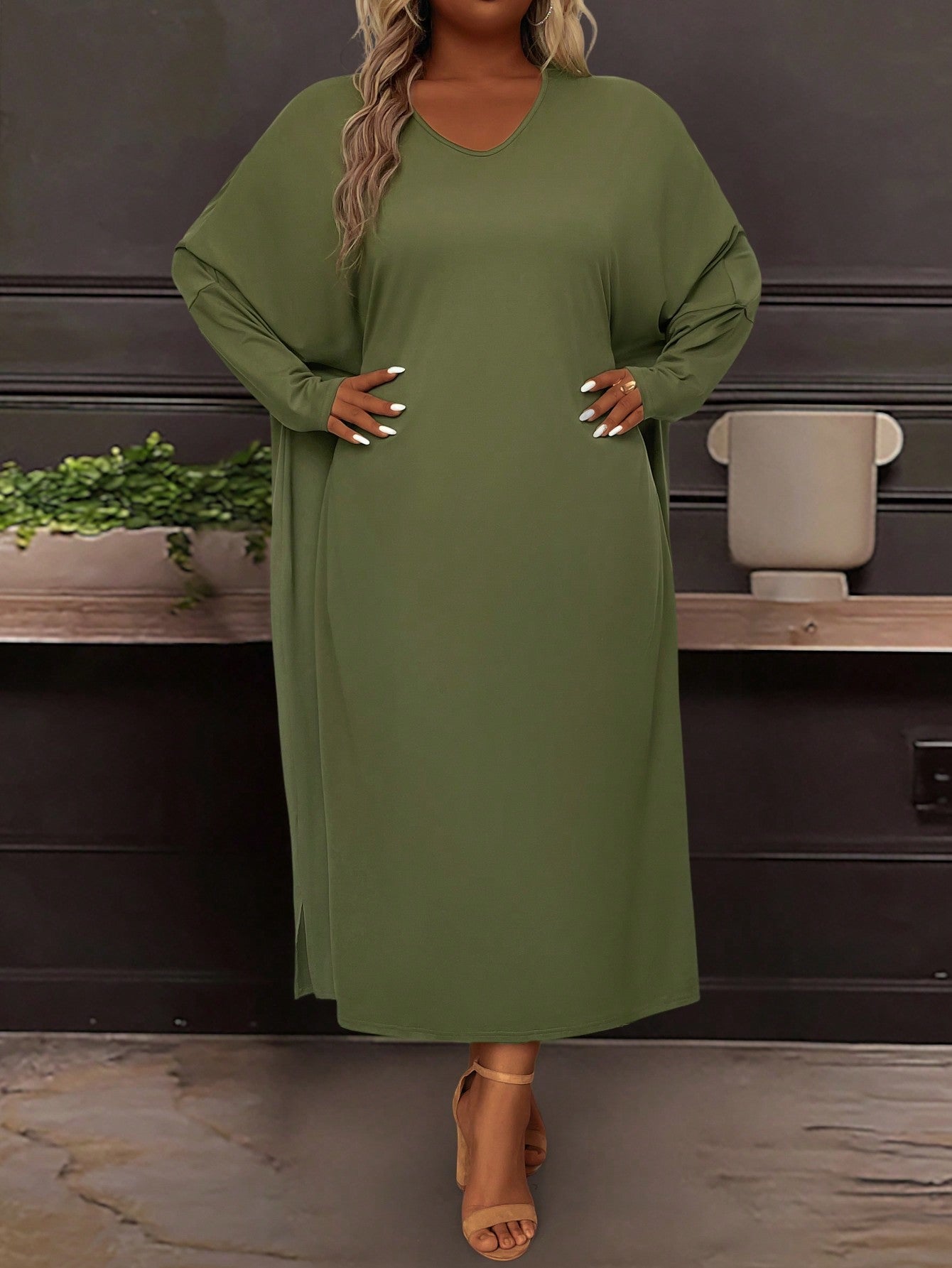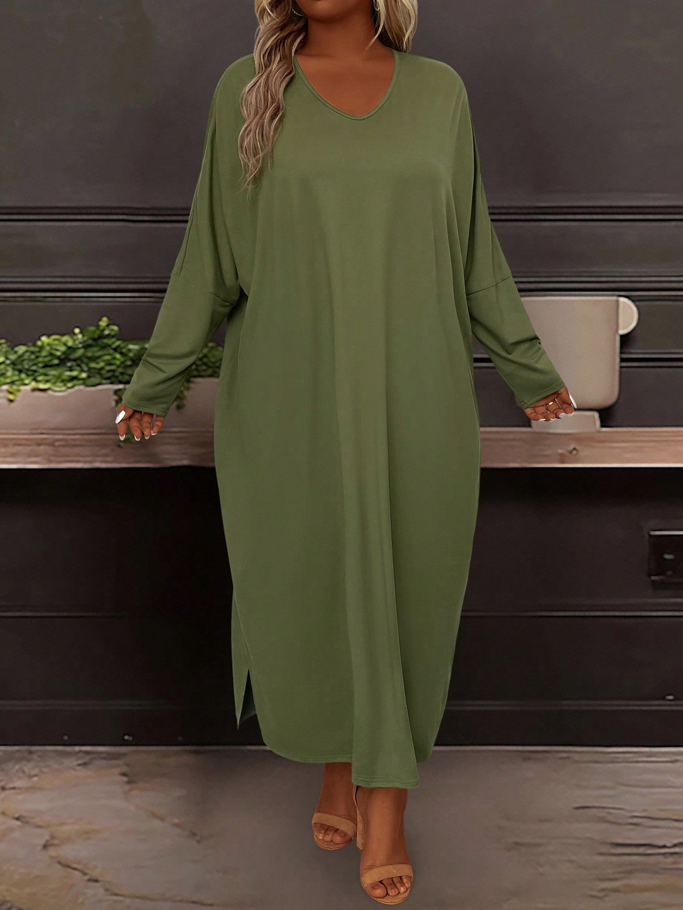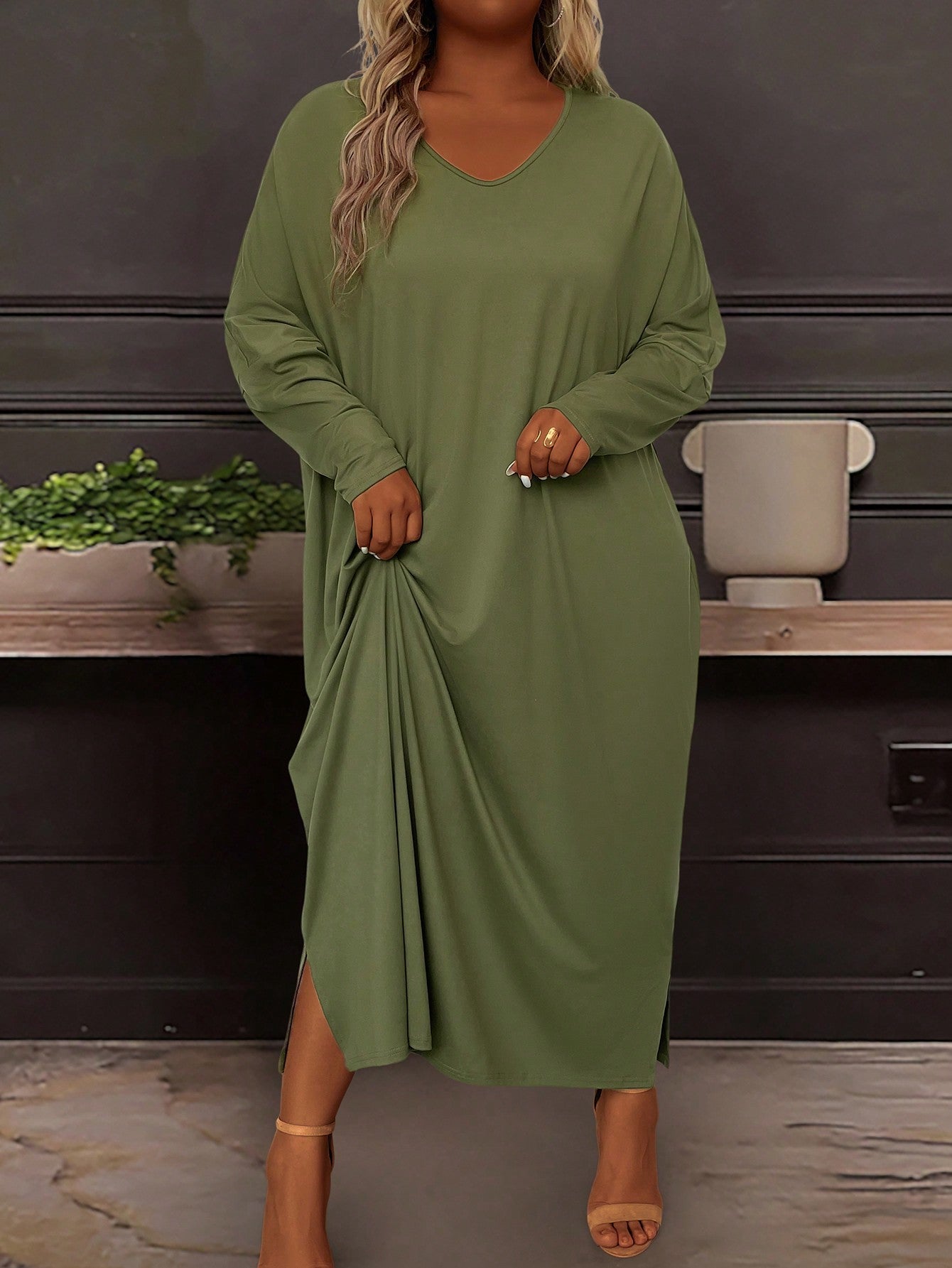women EMERY ROSE Plus Size Women's Solid V-Neck Long Sleeve Casual Loose Dress