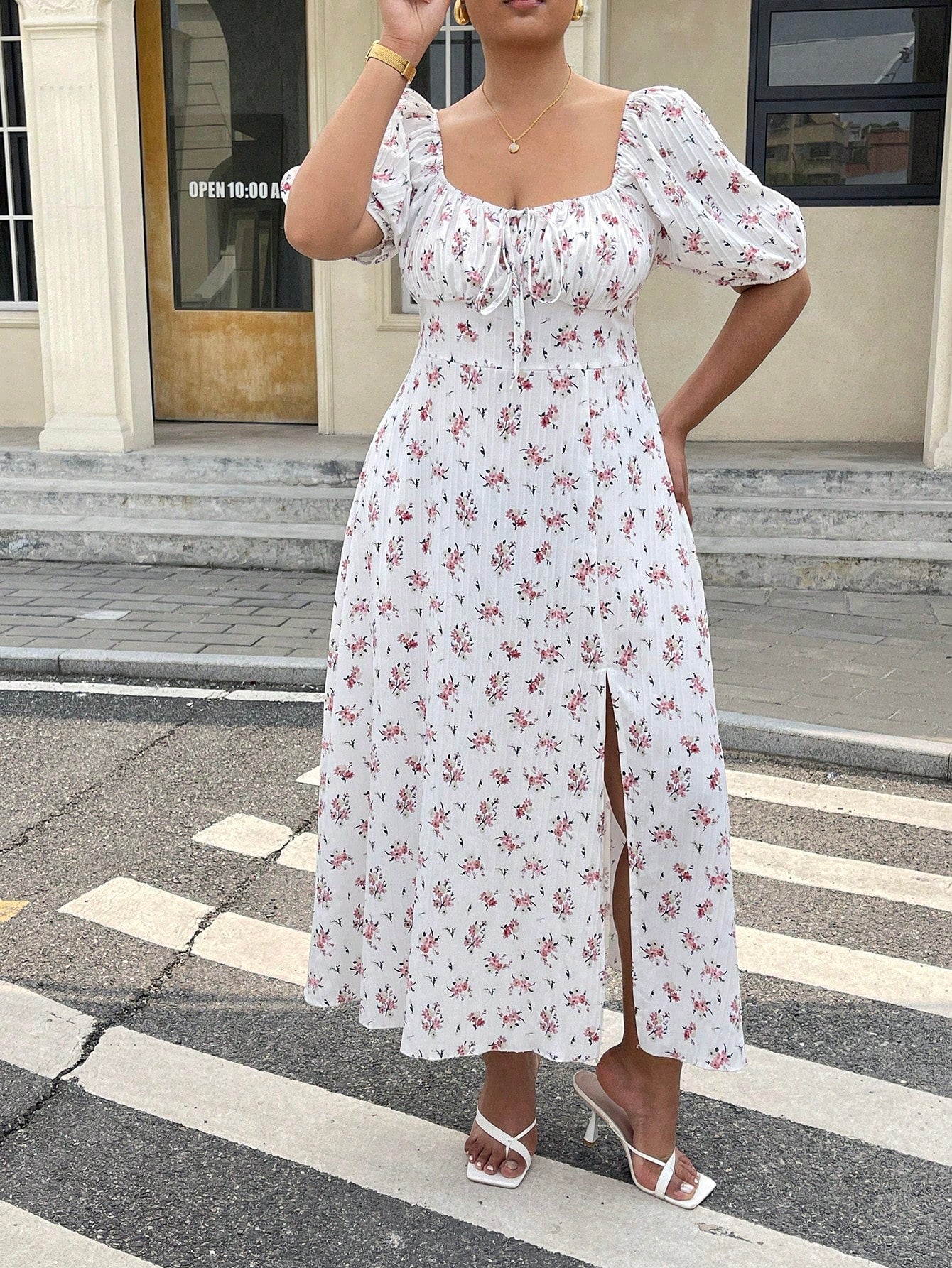 Flirla Plus Size Women Floral Print Puff Sleeve Split Hem Casual Dress