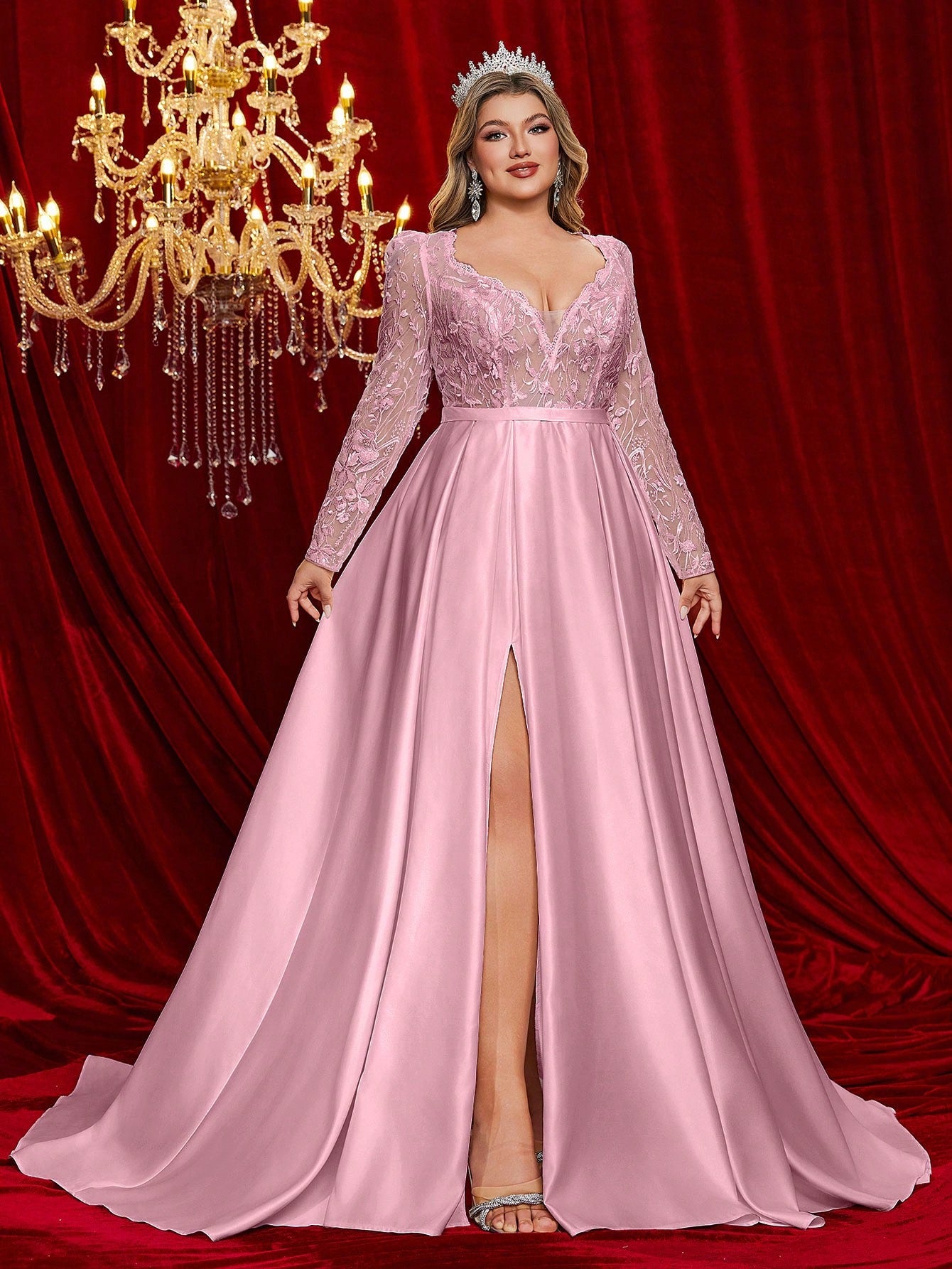 Glamrae Plus Size Elegant & Luxurious Sweetheart Neck Long Sleeve French Lace And Tulle With Pleating