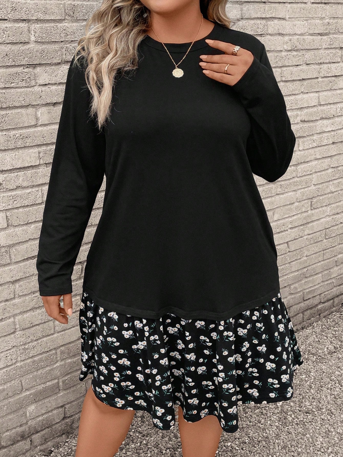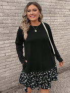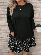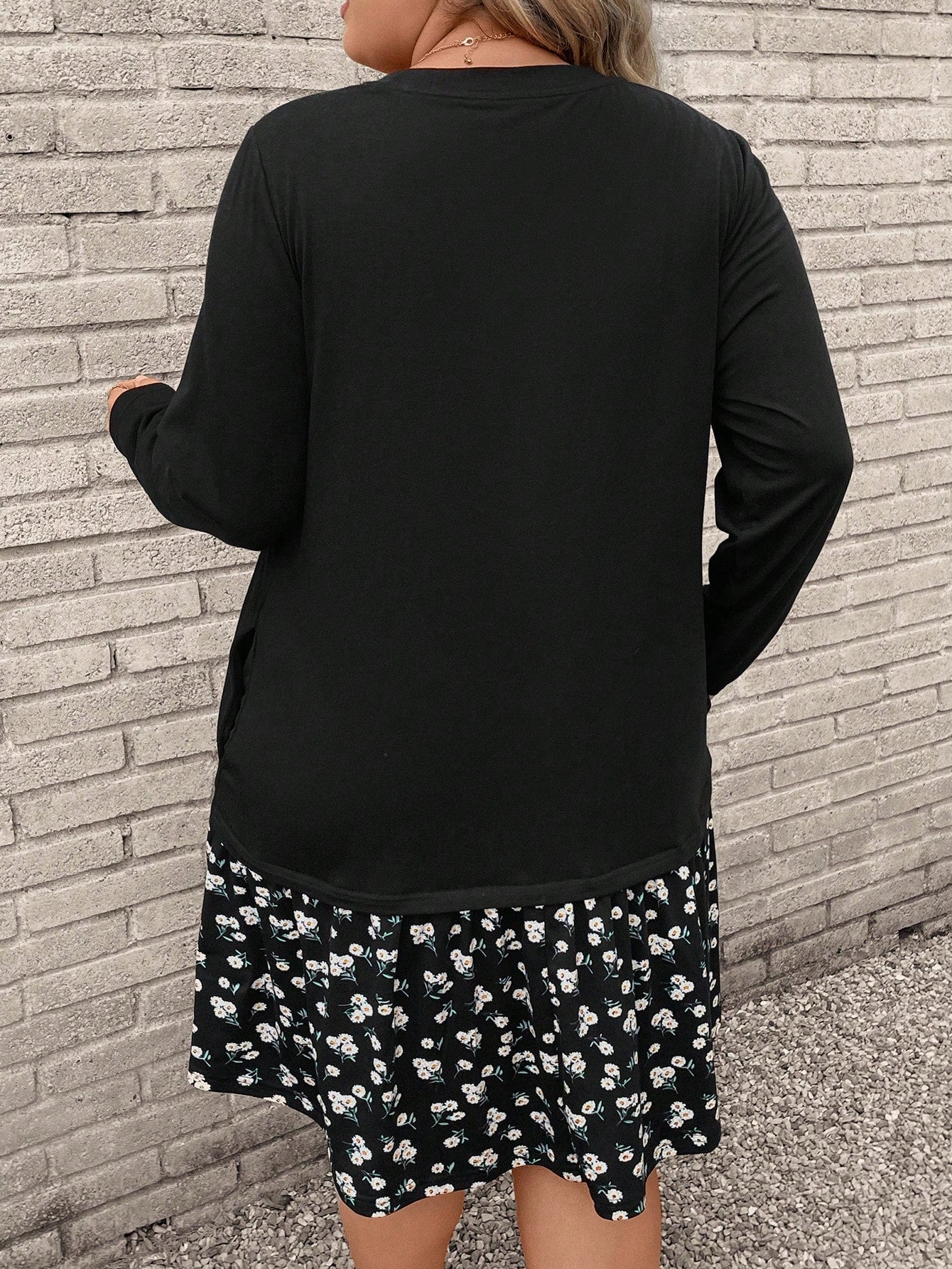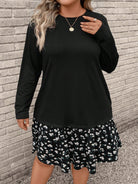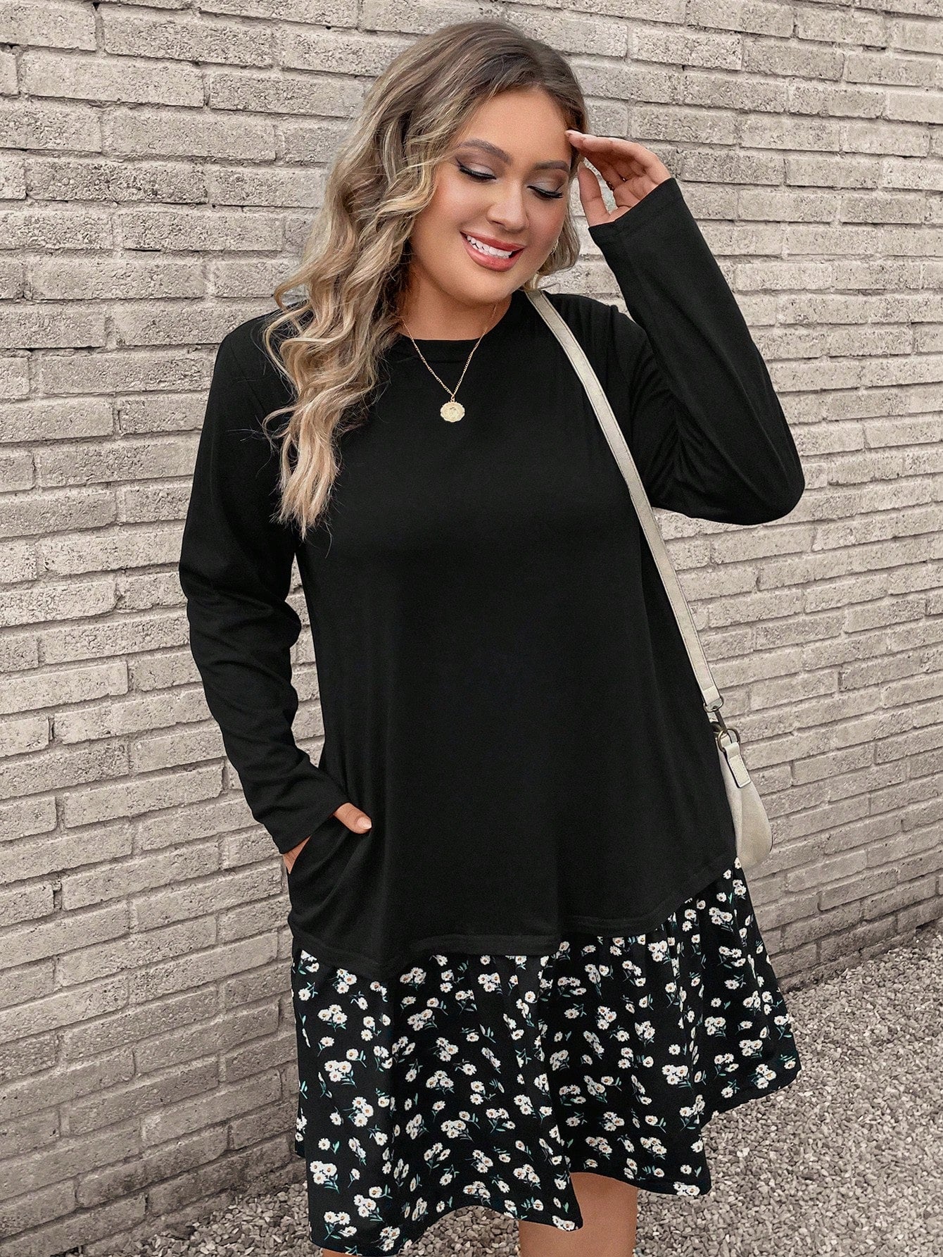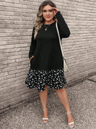LUNE Plus Size Women's Black Patchwork Polka Dot Pattern Side Pocket Round Neck Long Sleeve Casual Dress,