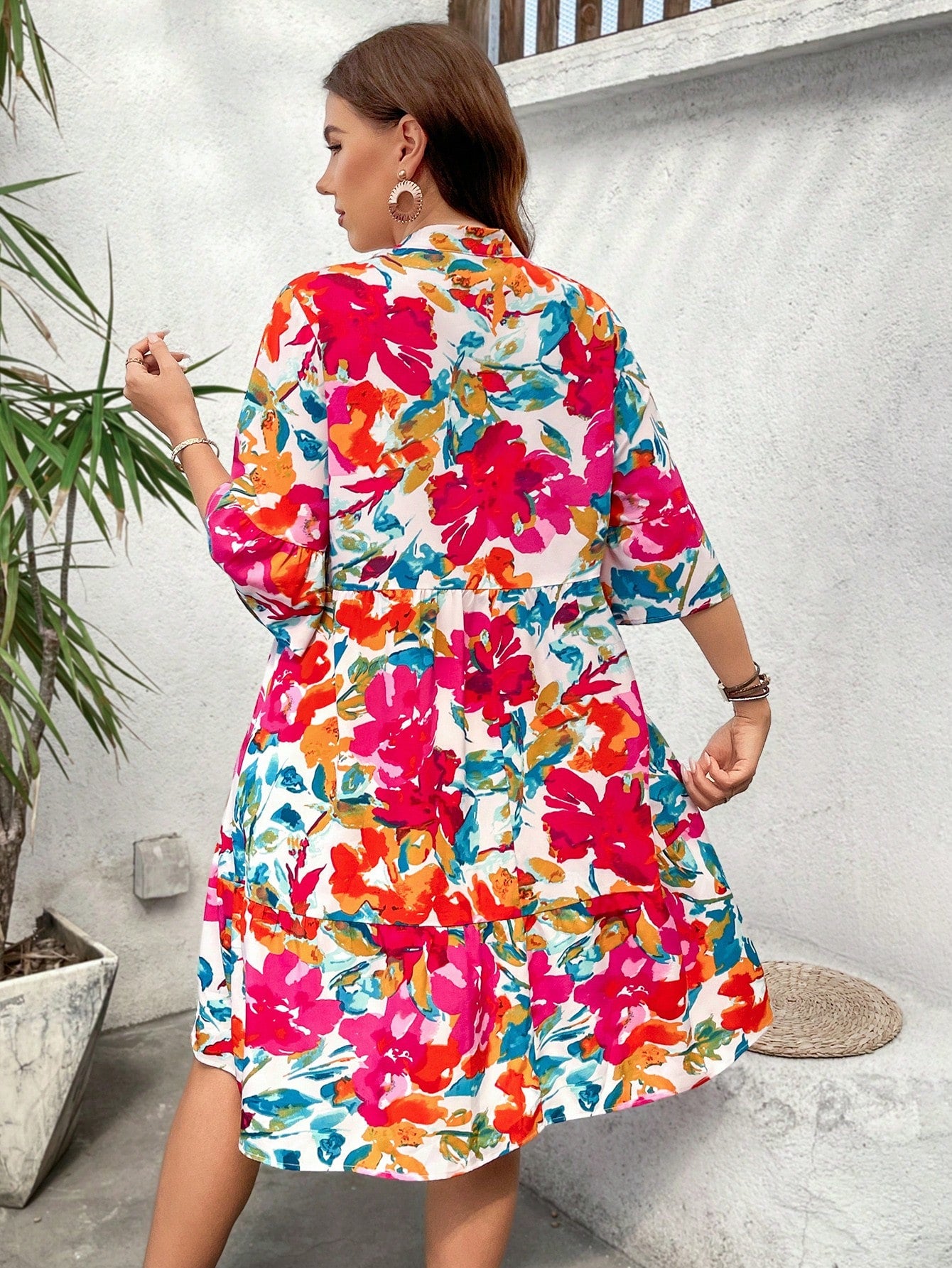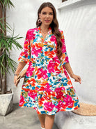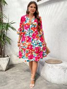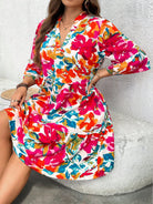 LUNE Plus Size Women's Boho Floral Print Knee Length Dress With V Neck And Three Quarter Sleeves