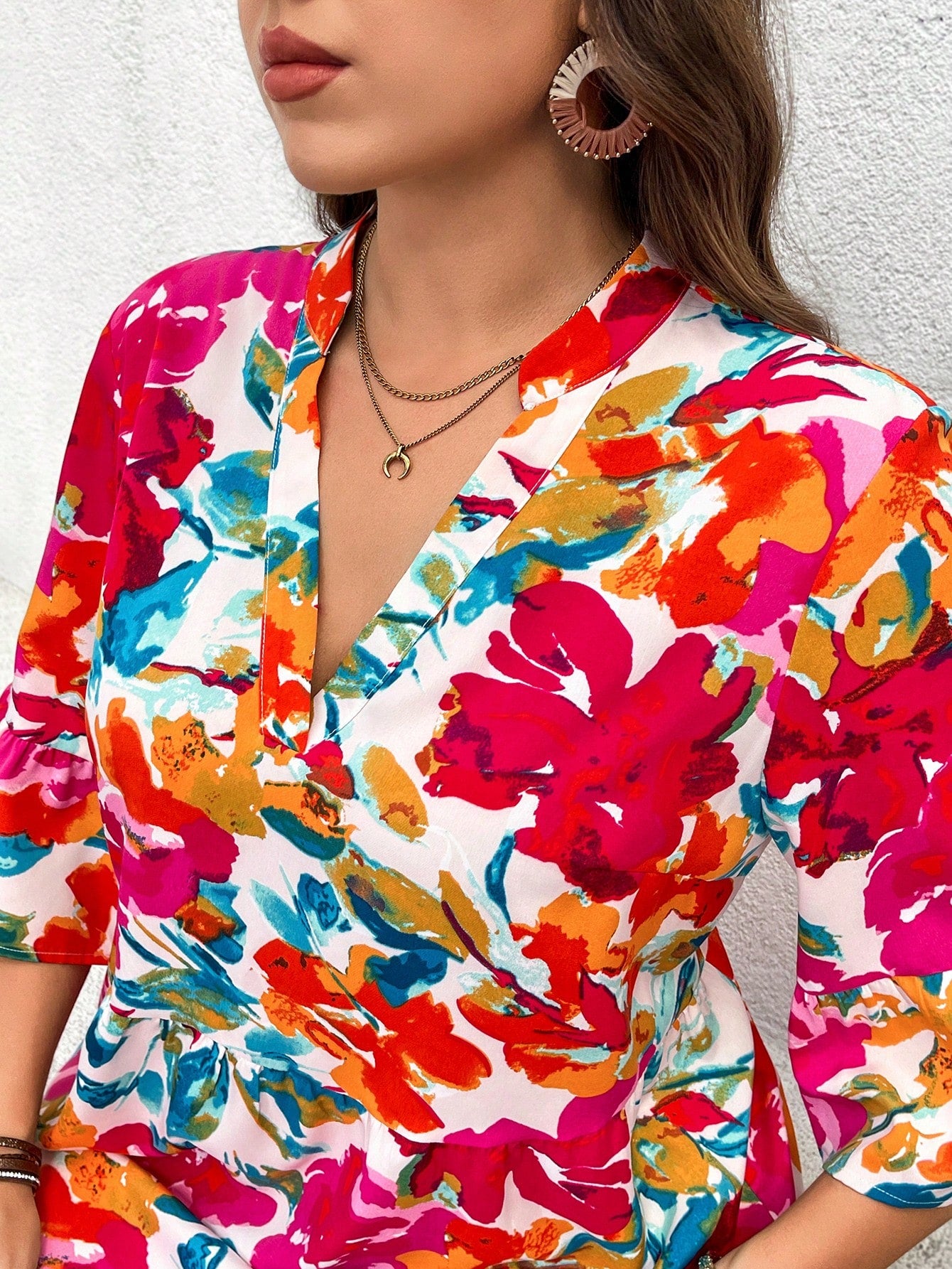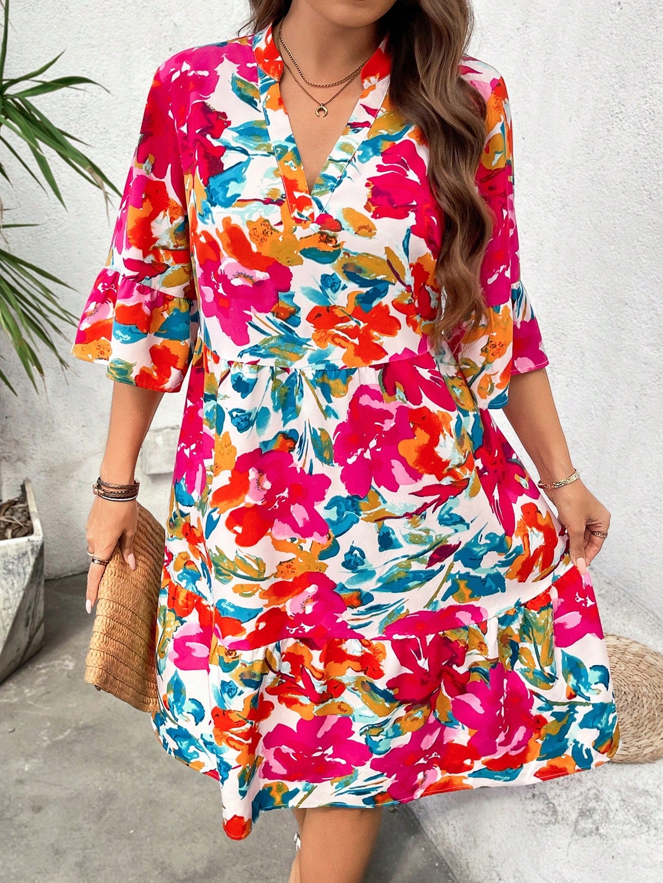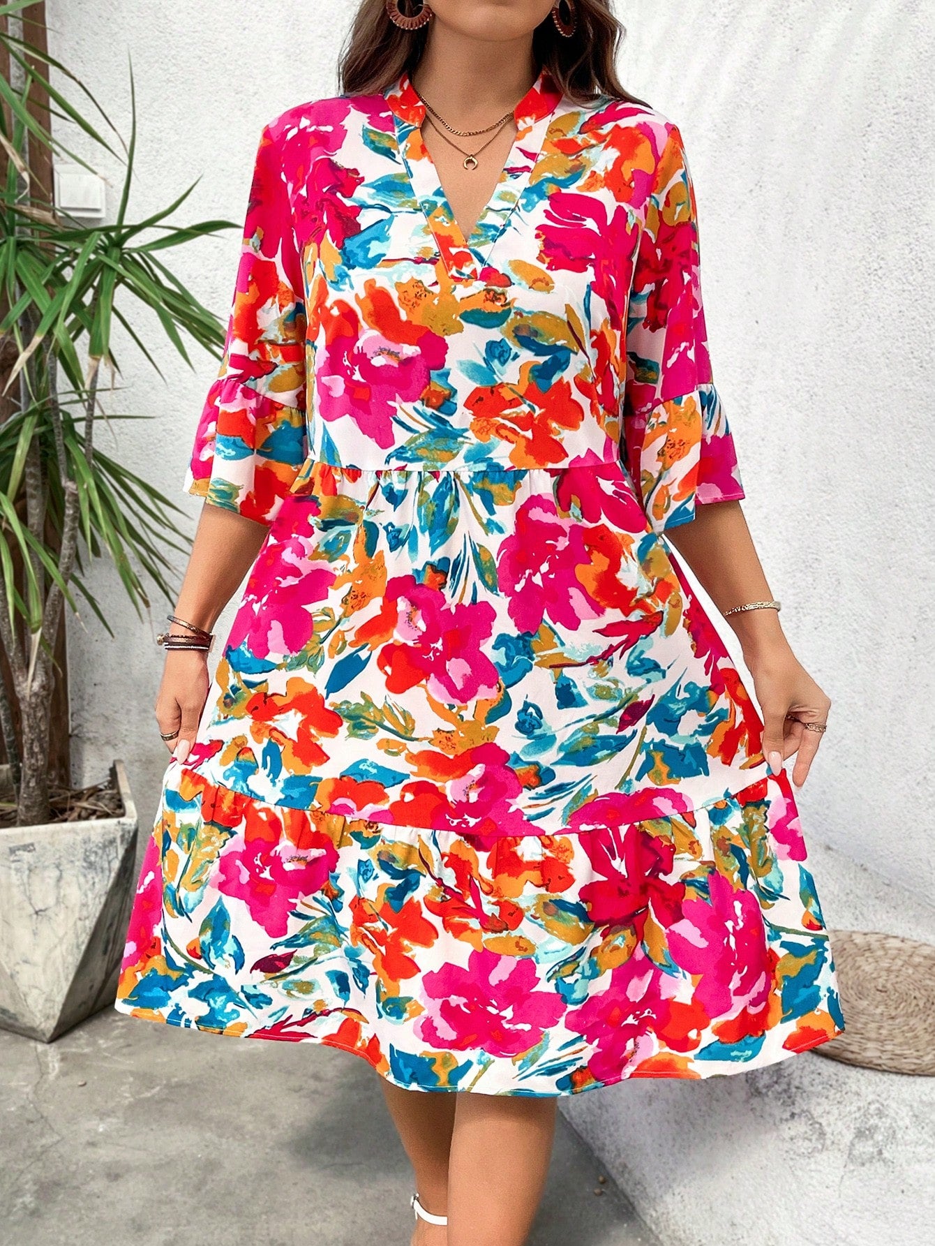 فستان LUNE نسائي بمقاسات كبيرة بطبعة زهور بوهو بطول الركبة مع رقبة على شكل حرف V وأكمام ثلاثة أرباع