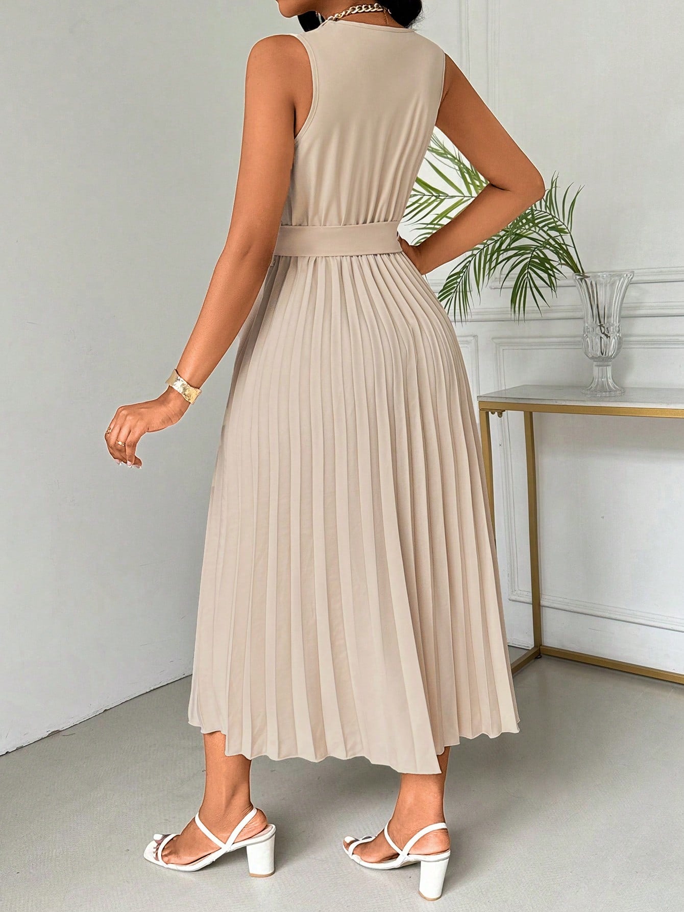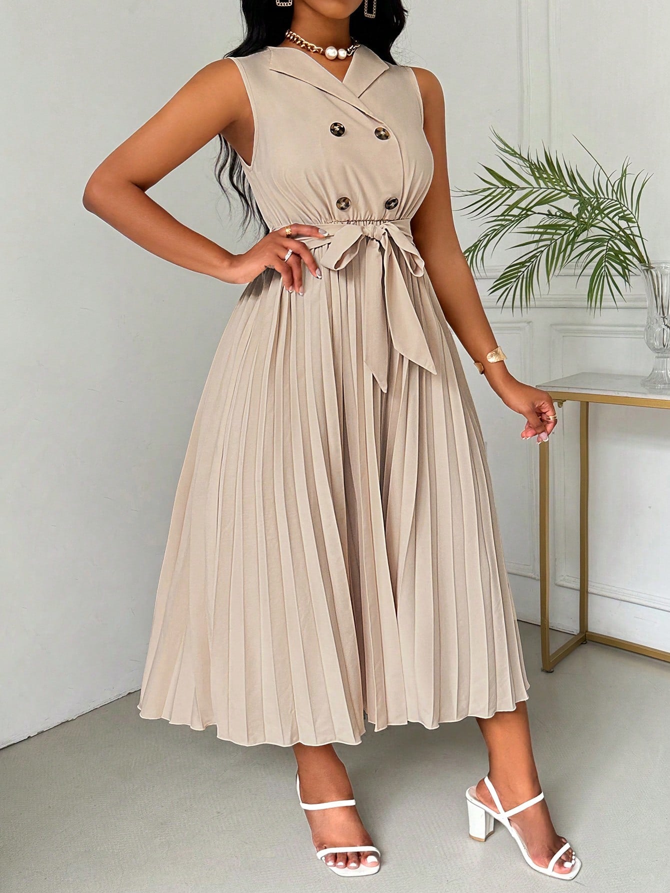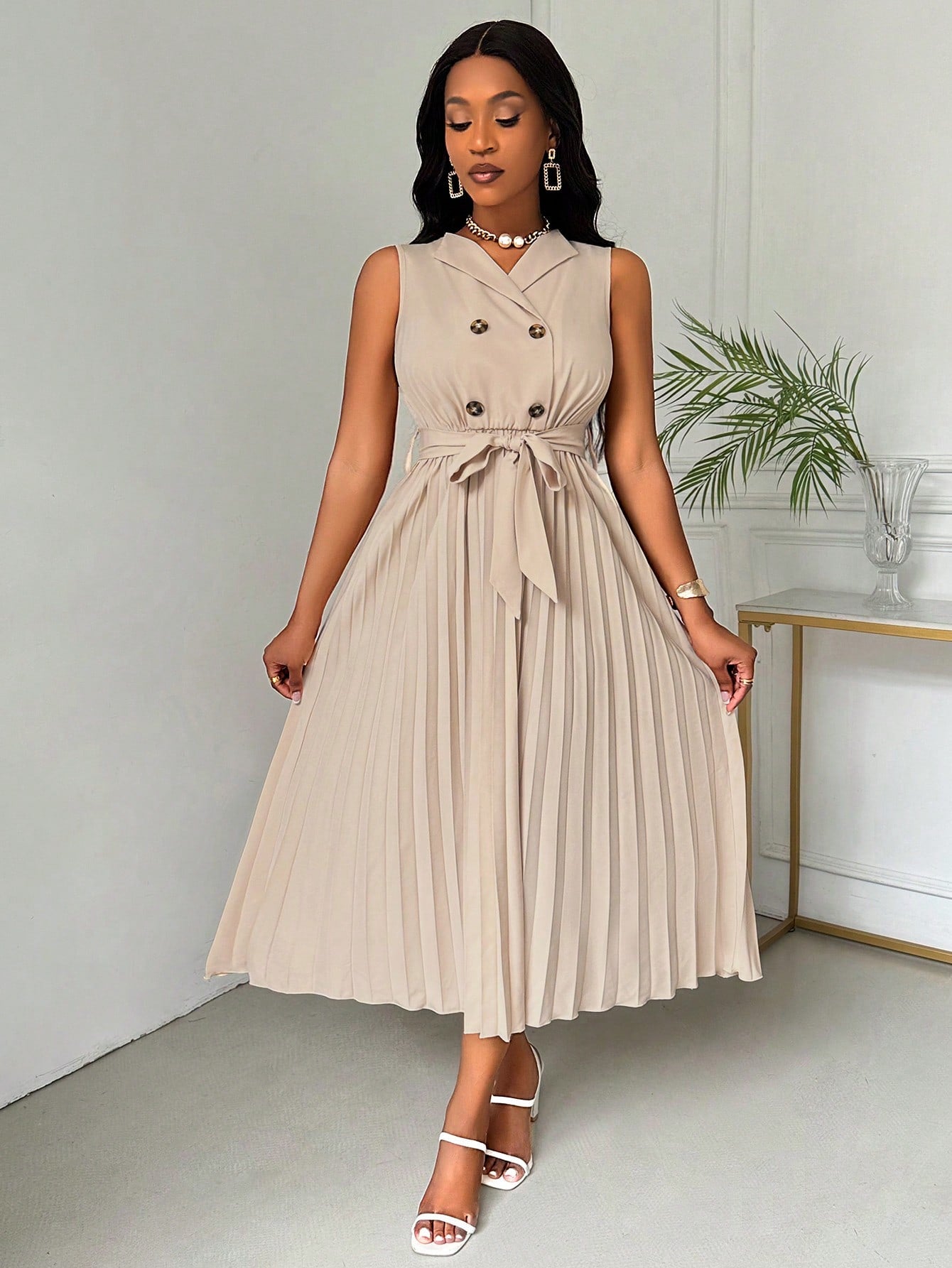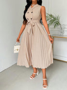 women Lyxana Women's Fashionable Sleeveless Blazer Collar Pleated Dress Maxi Women Outfit