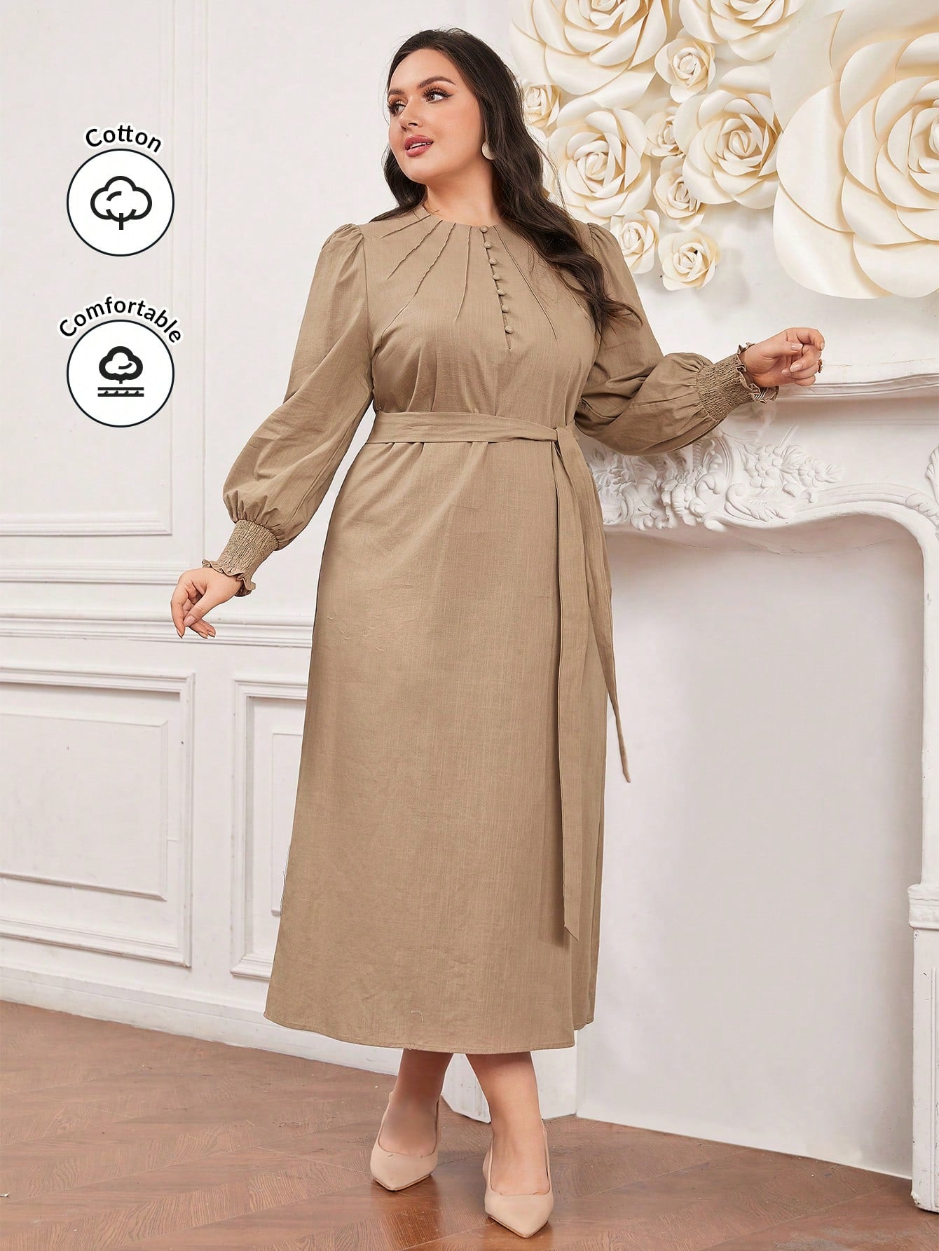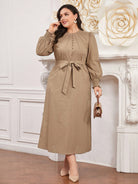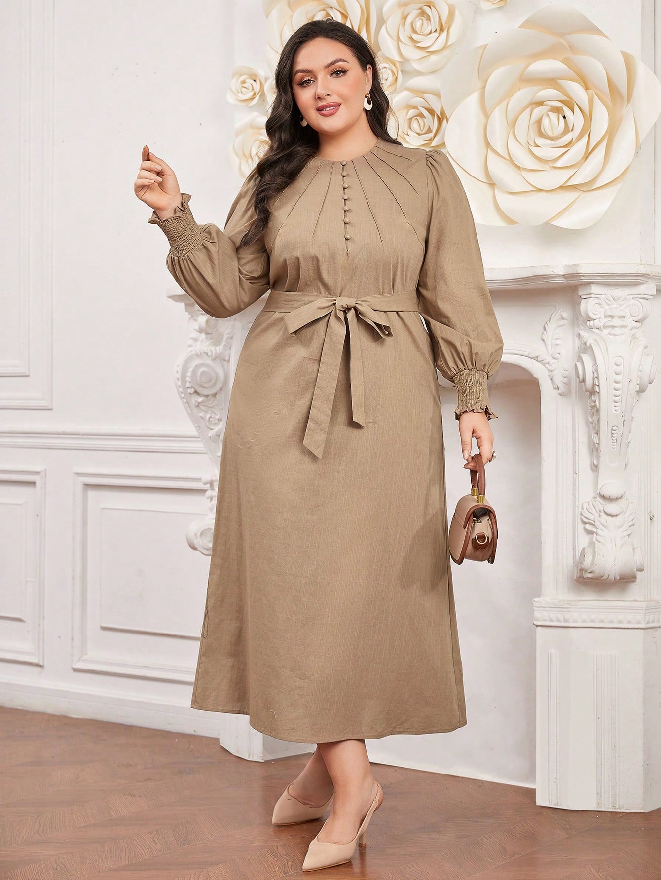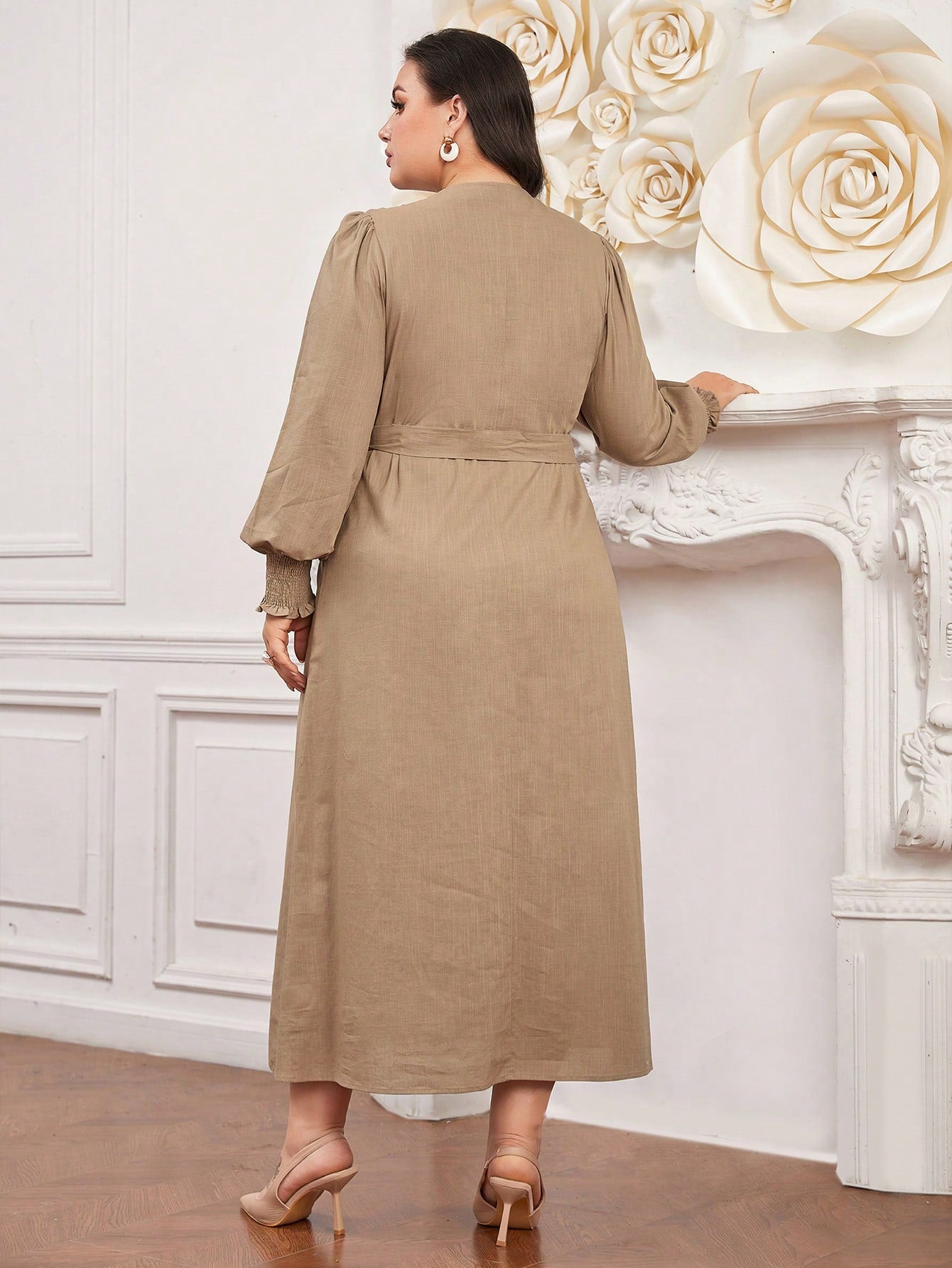 Modelyn Plus Size Lantern Sleeve Button Front Belted Midi Dress With Pockets Long Evening Dresses