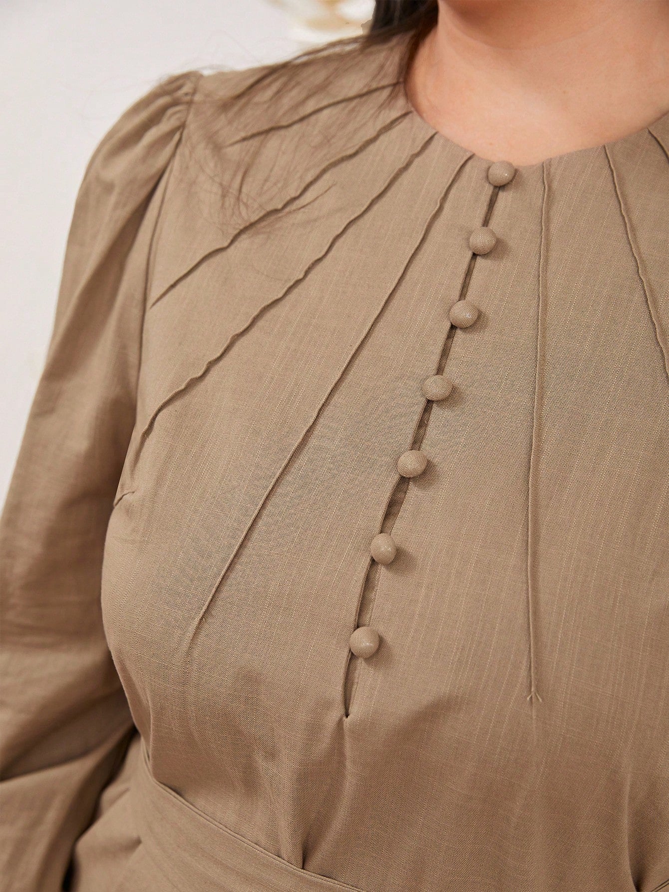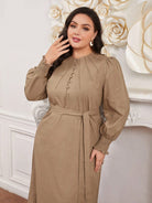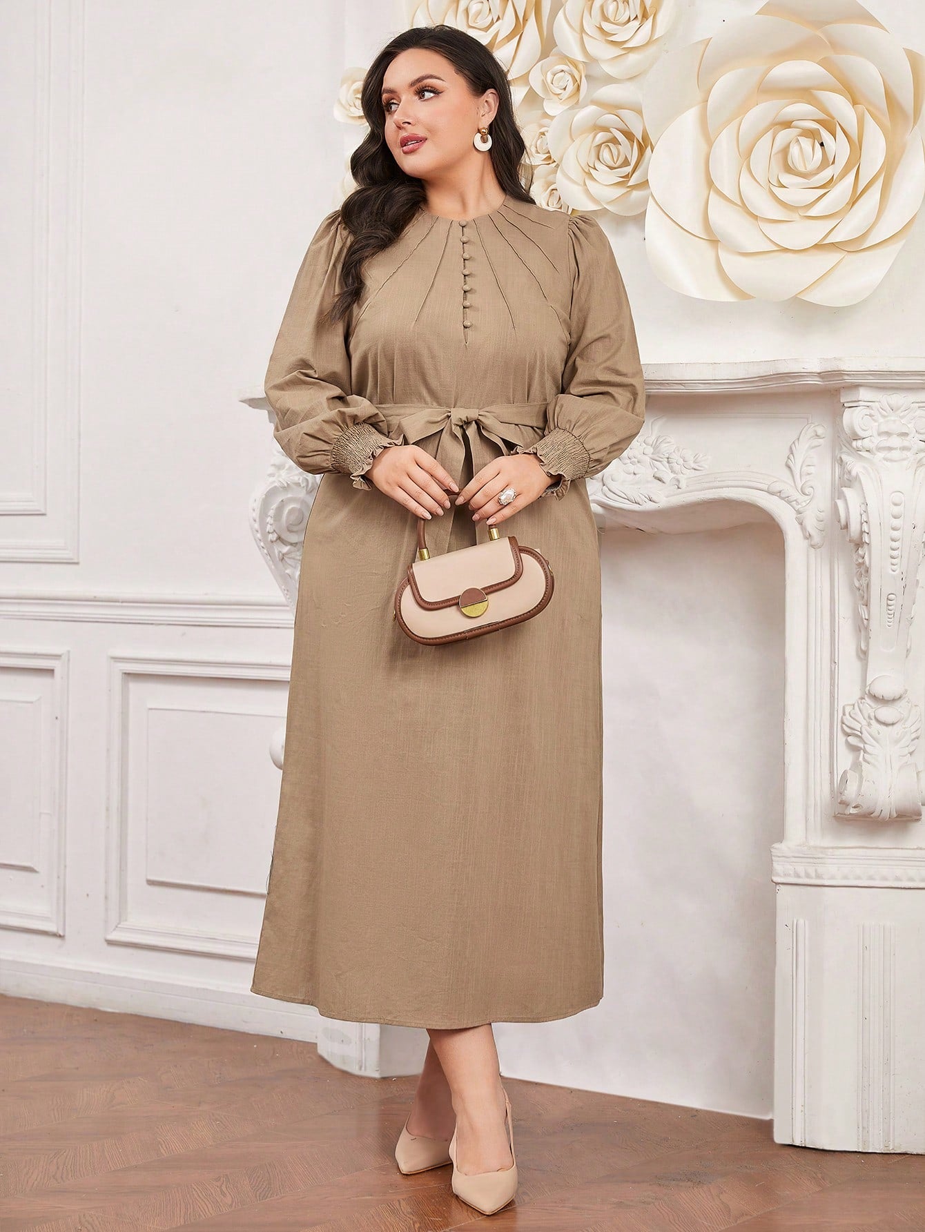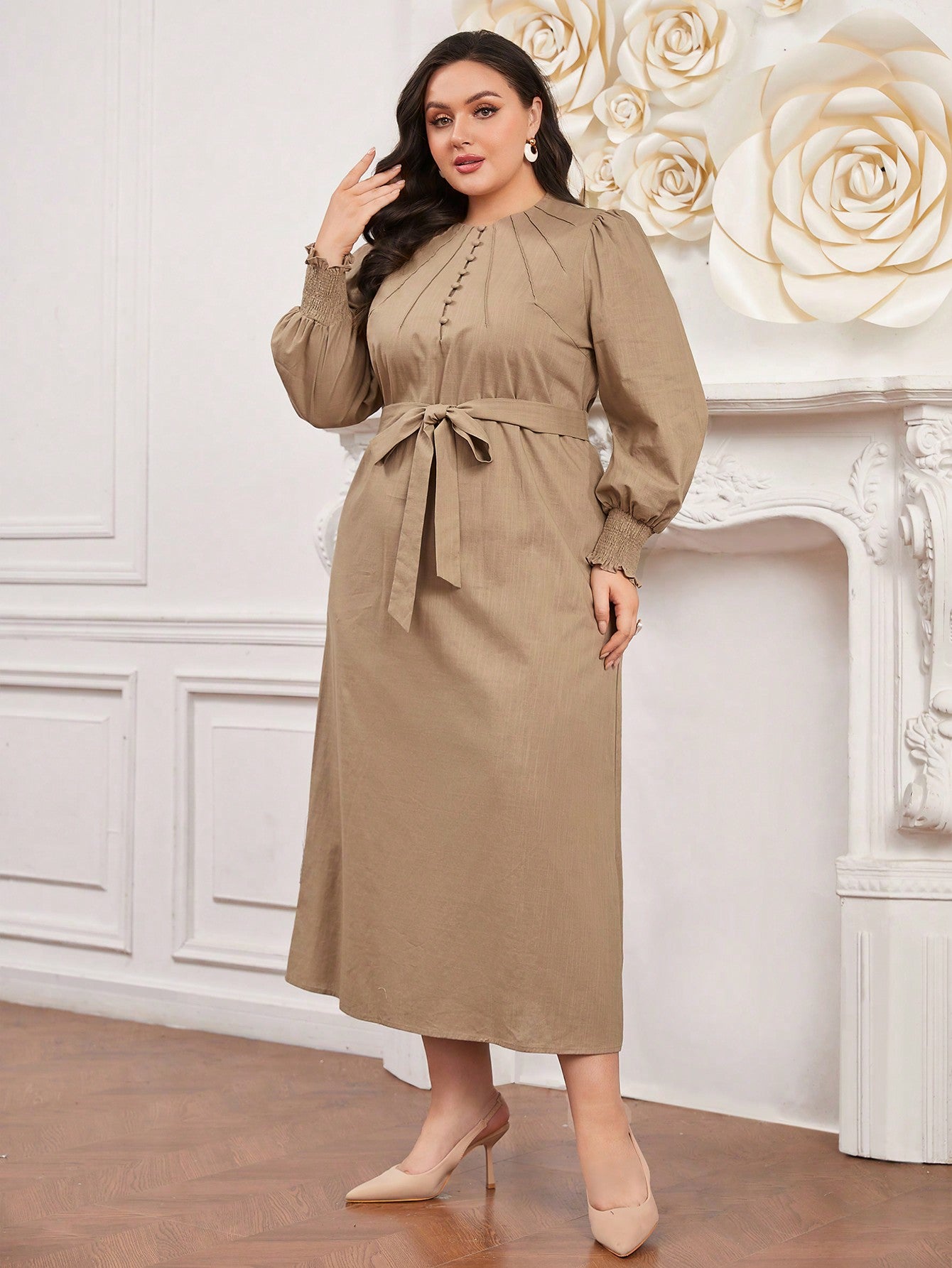 Modelyn Plus Size Lantern Sleeve Button Front Belted Midi Dress With Pockets Long Evening Dresses