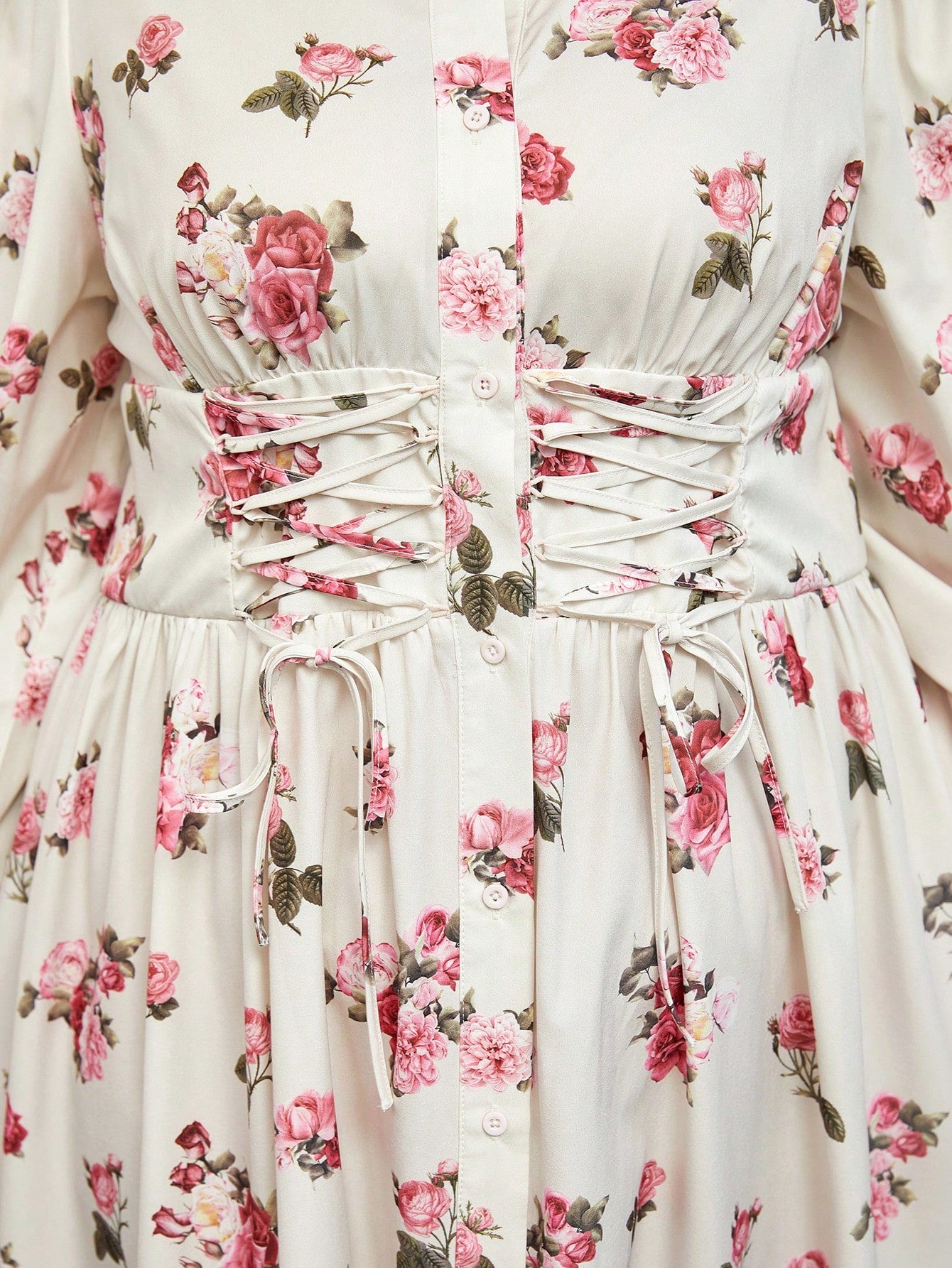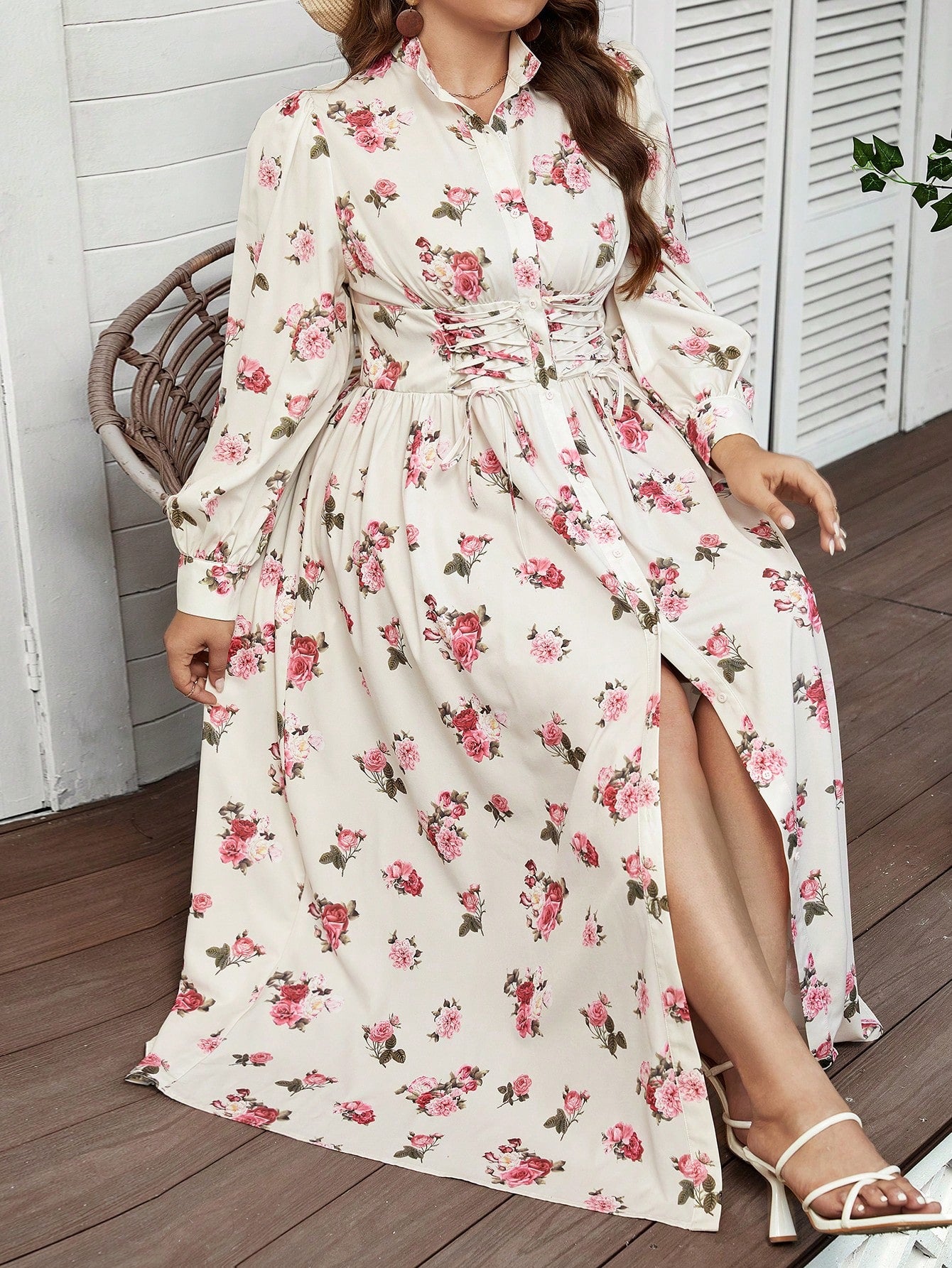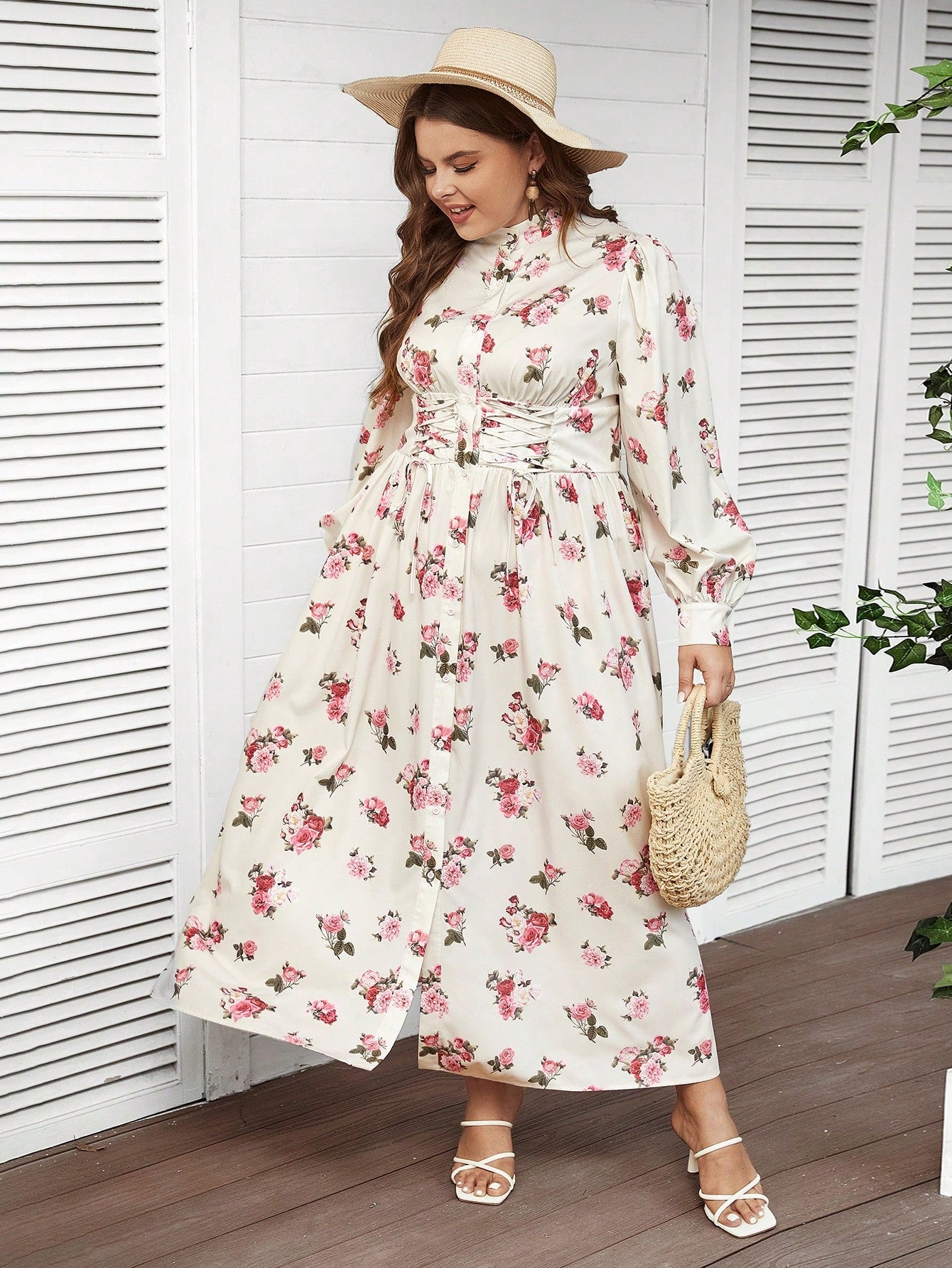 Mulvari Plus Size Women's Floral Print Stand Collar Lantern Sleeve Dress