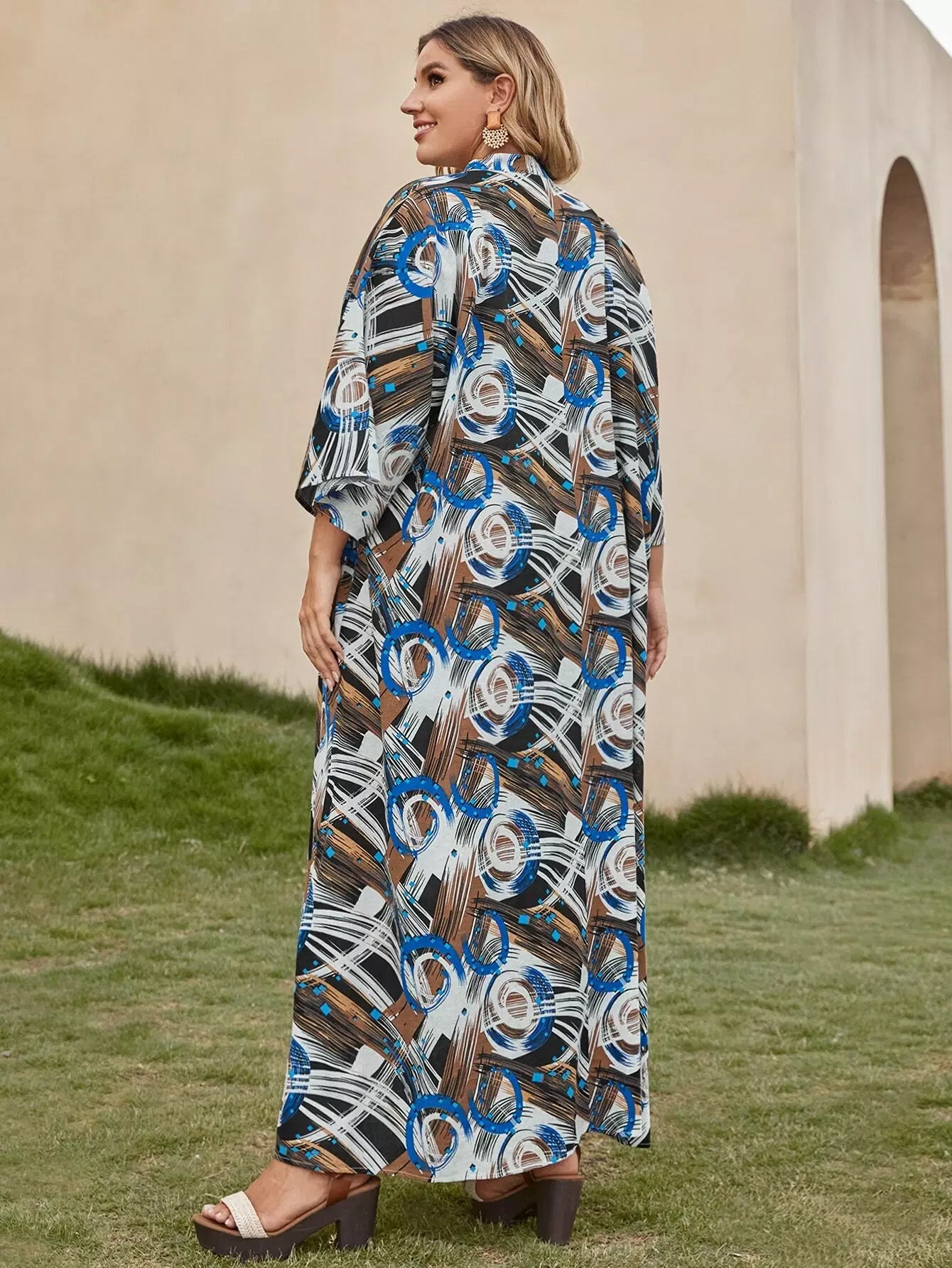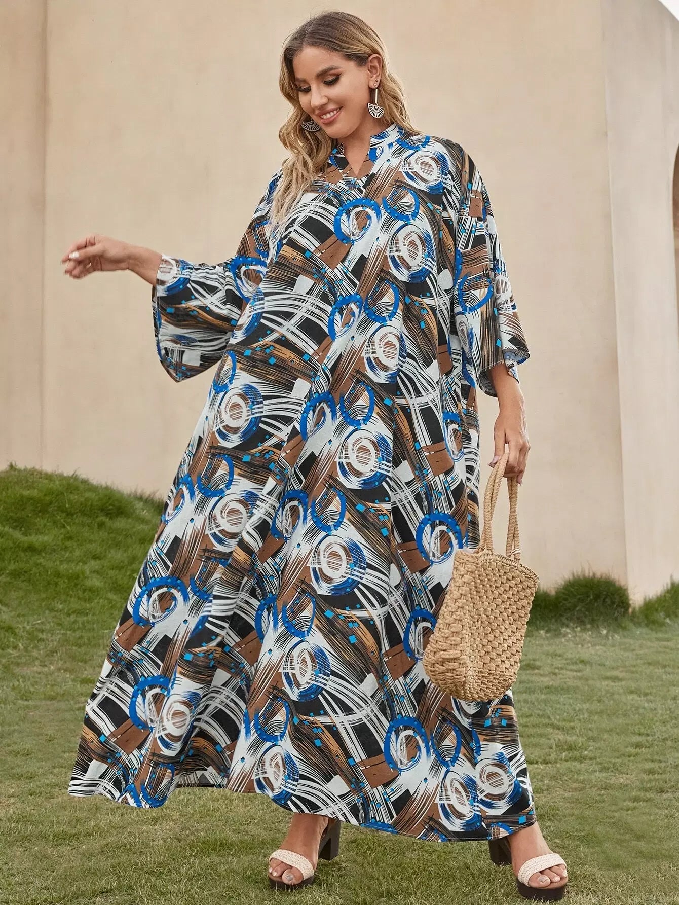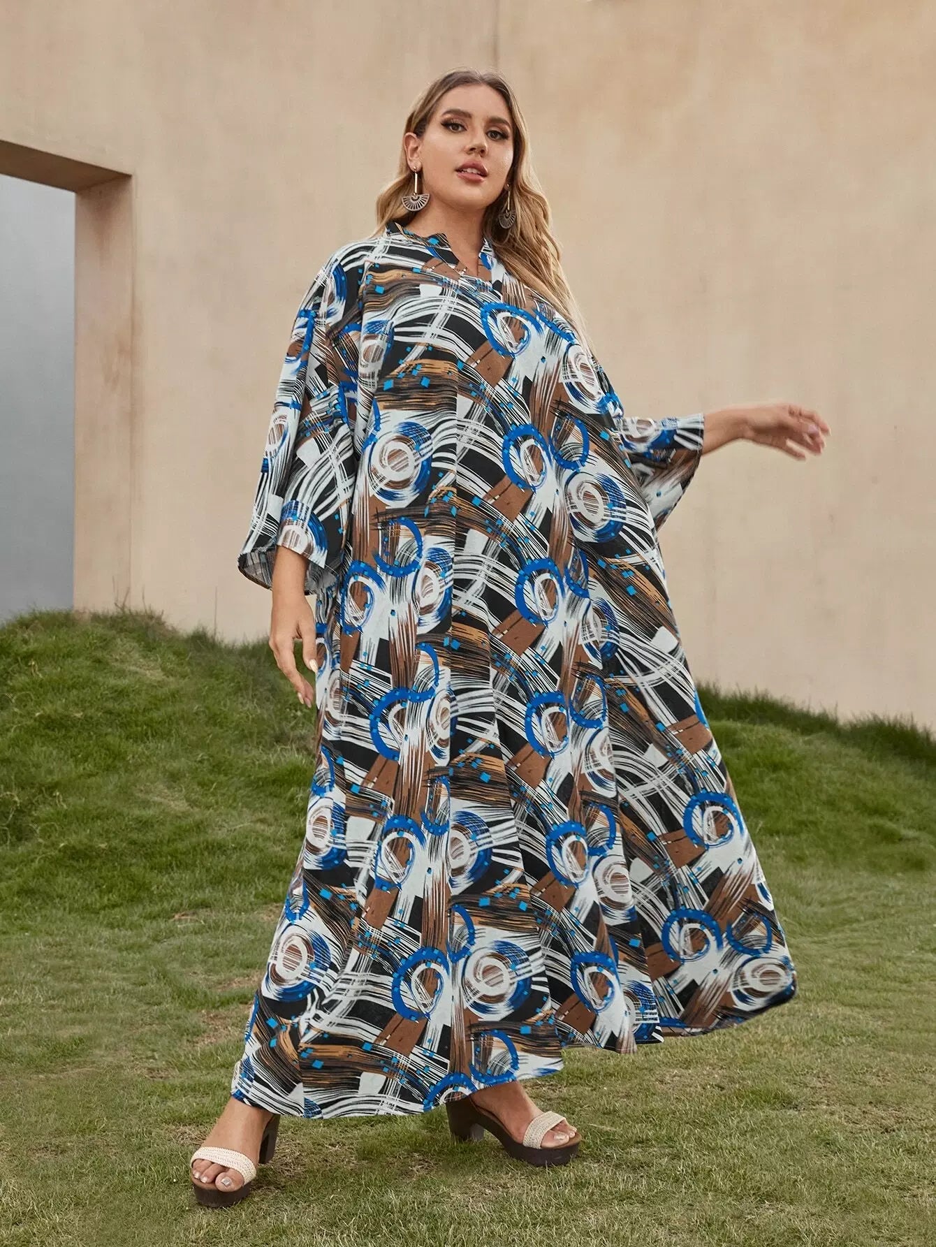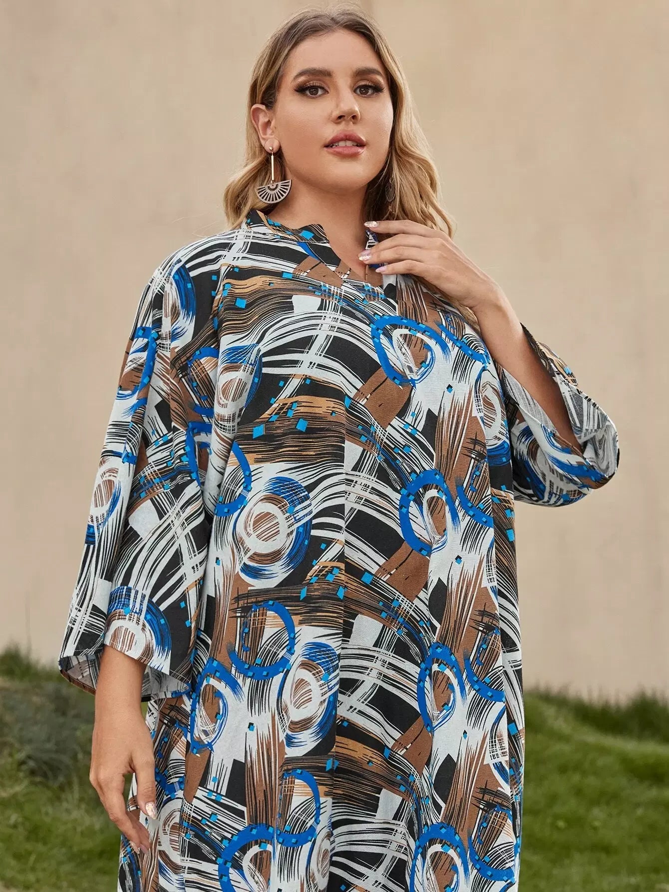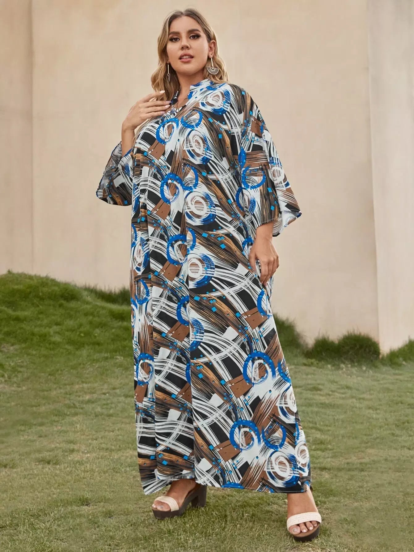فستان بأكمام بفتحة رقبة جرس مطبوع عليه طبعات زائد