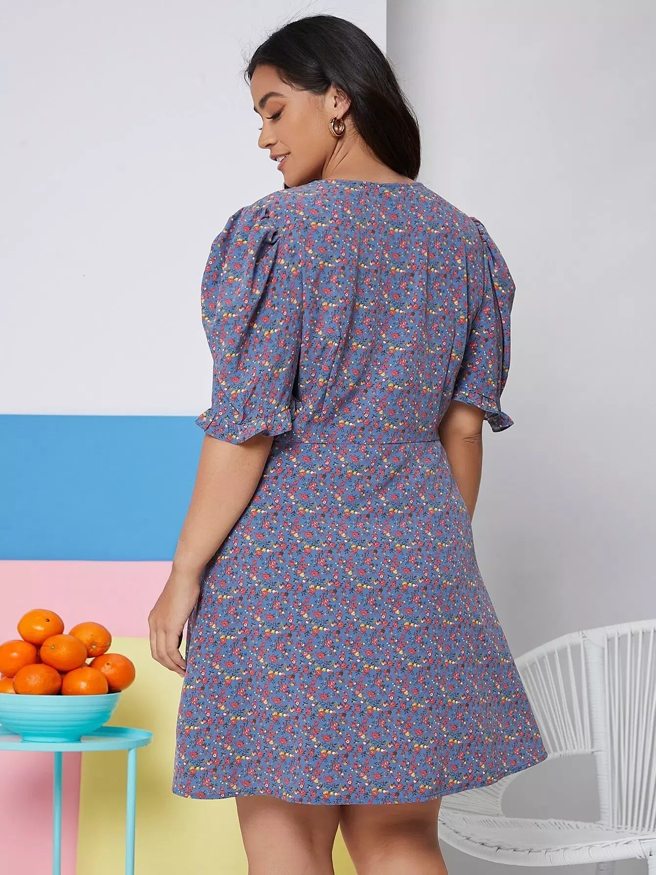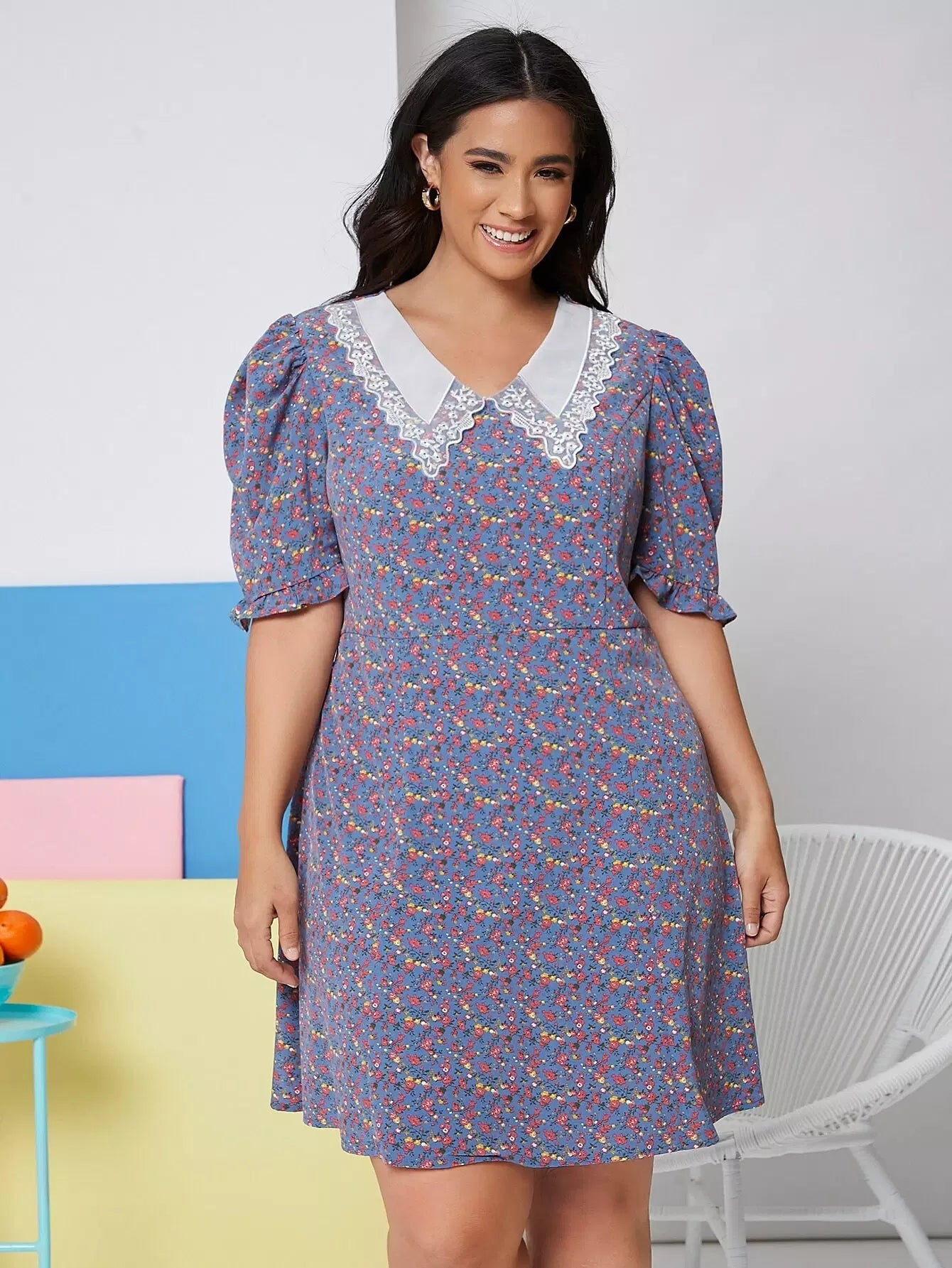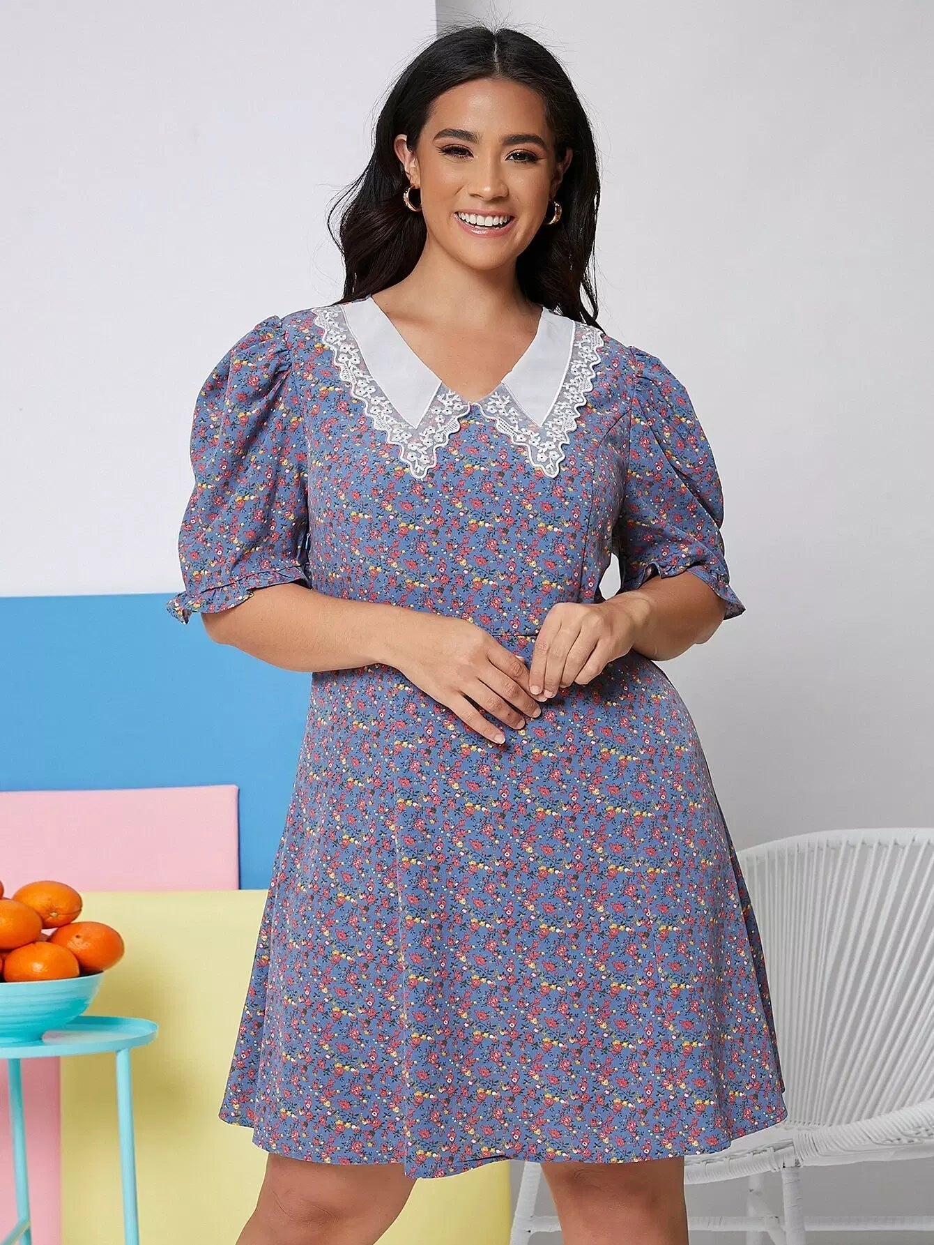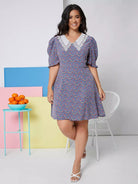 فستان بأكمام منفوشة بياقة بلون مغاير وأكمام منفوشة بياقة بلون مغاير