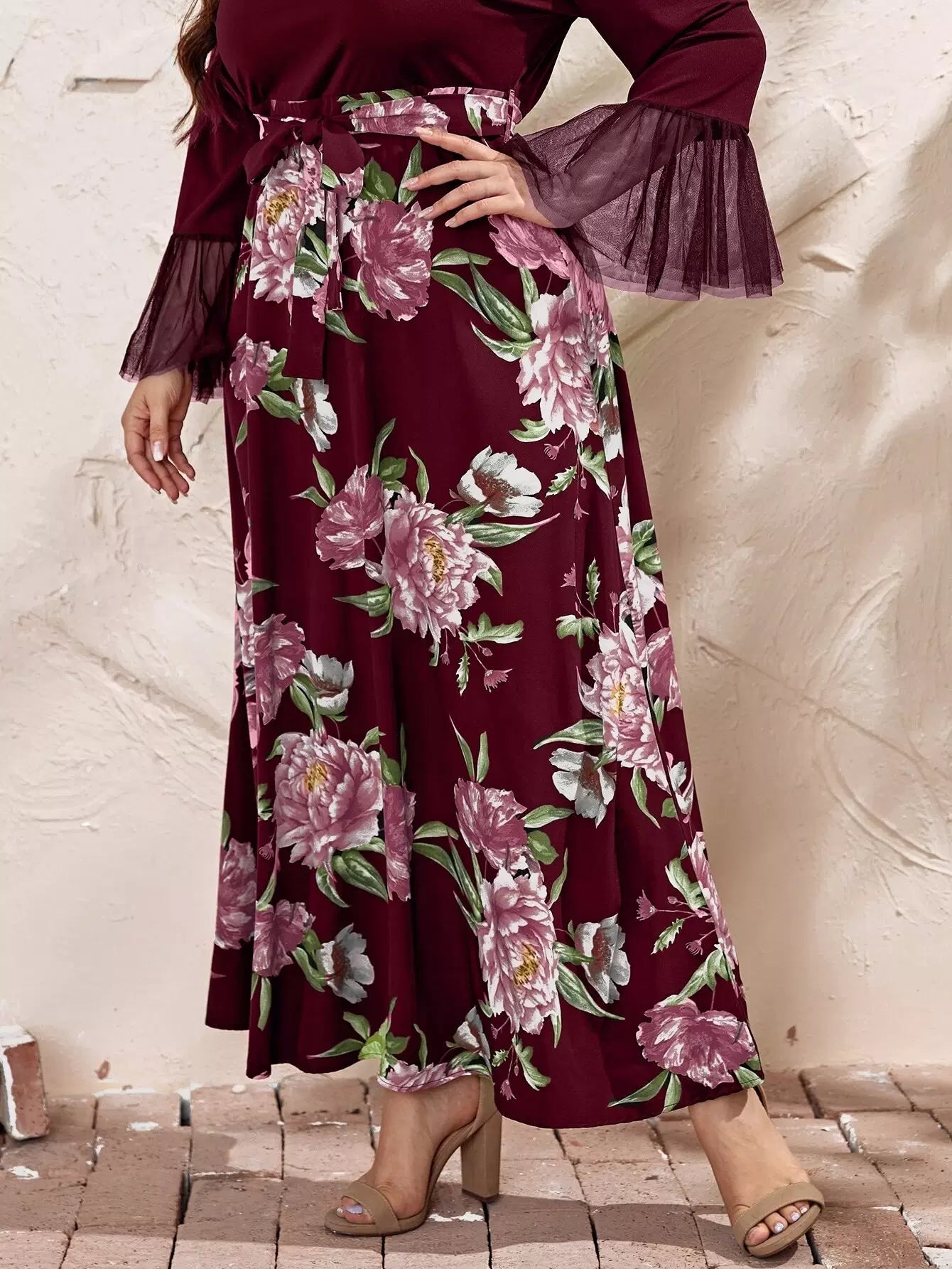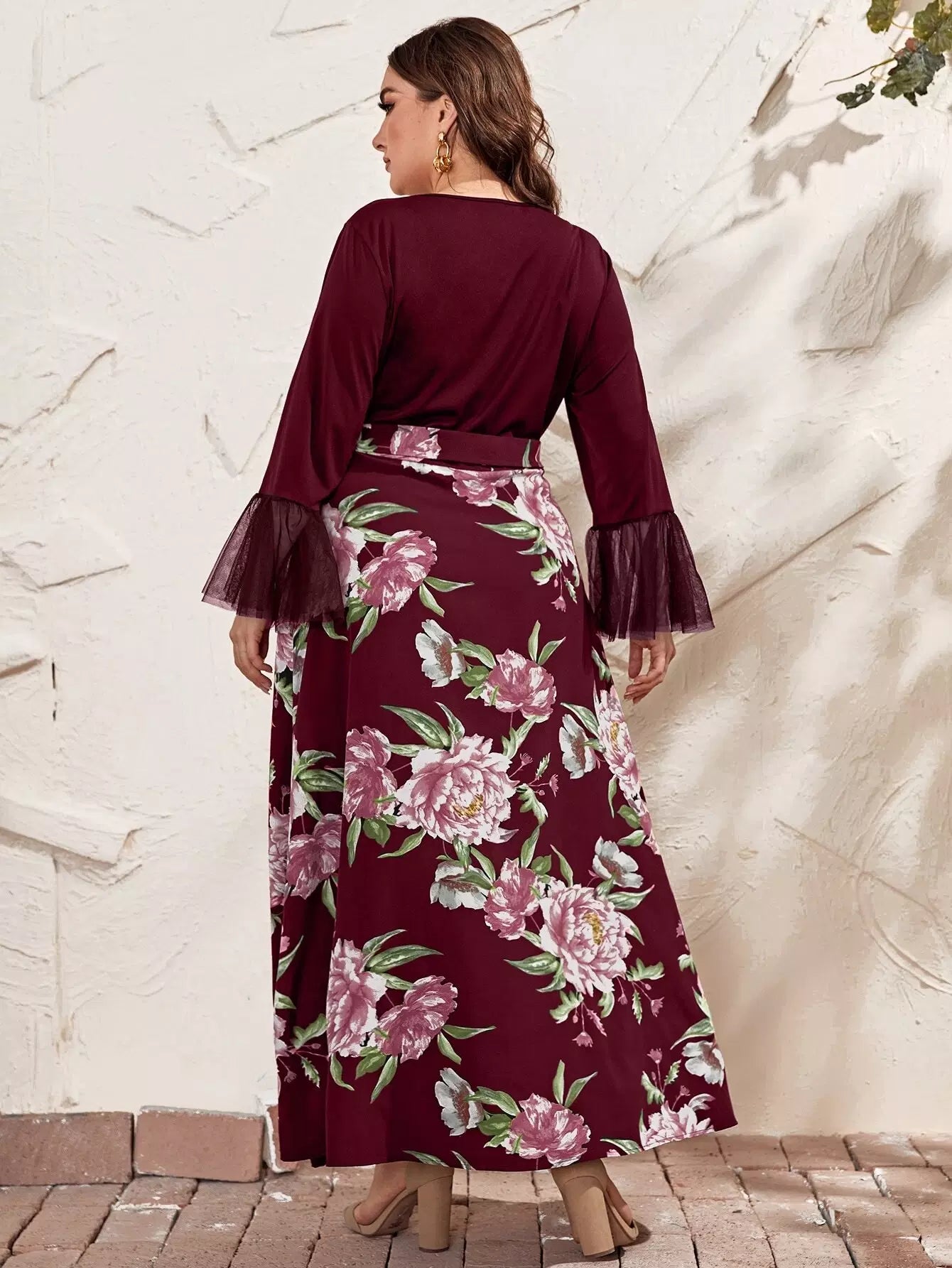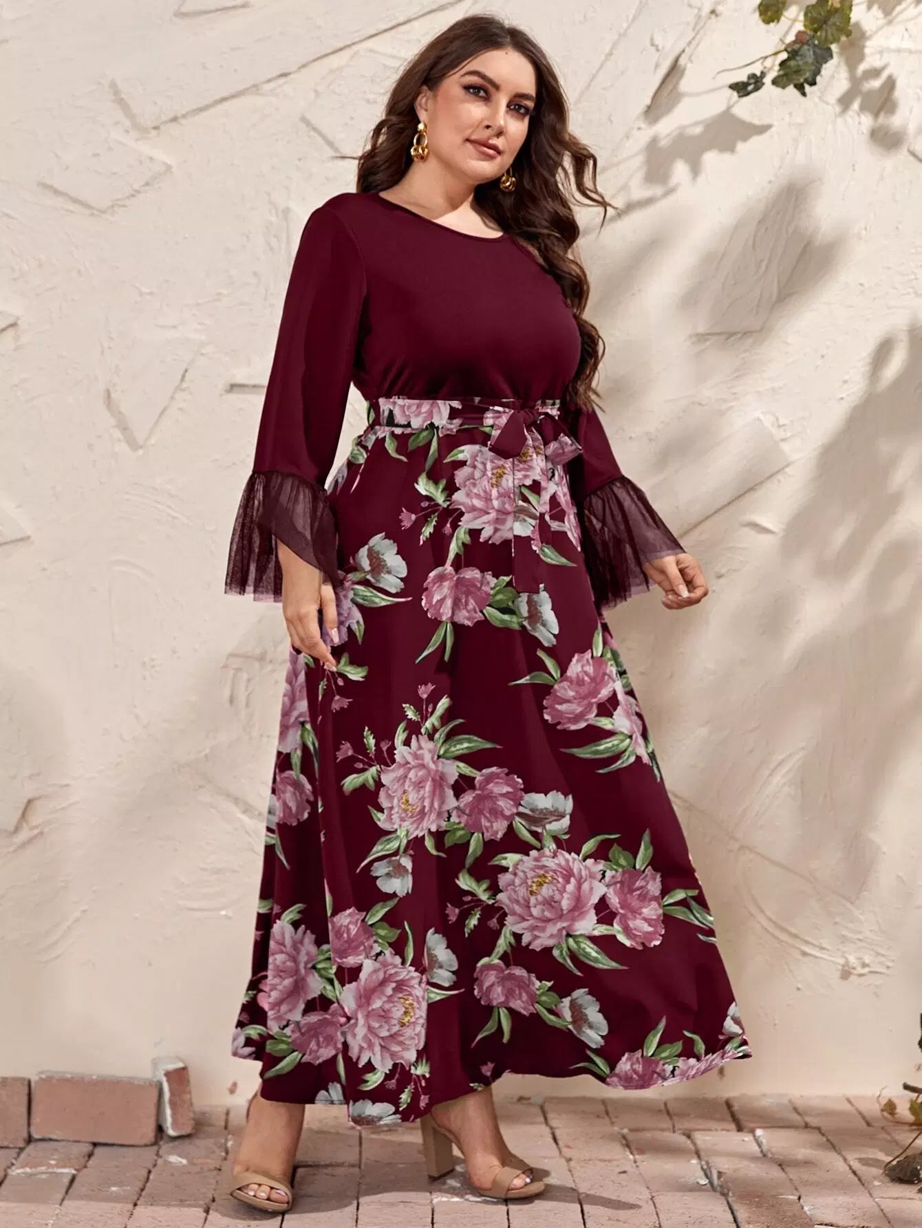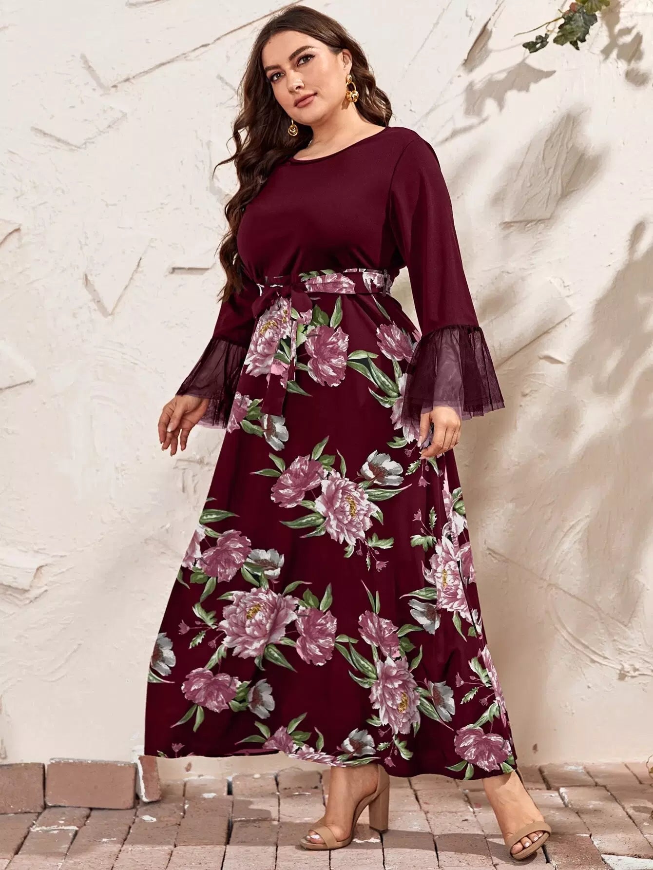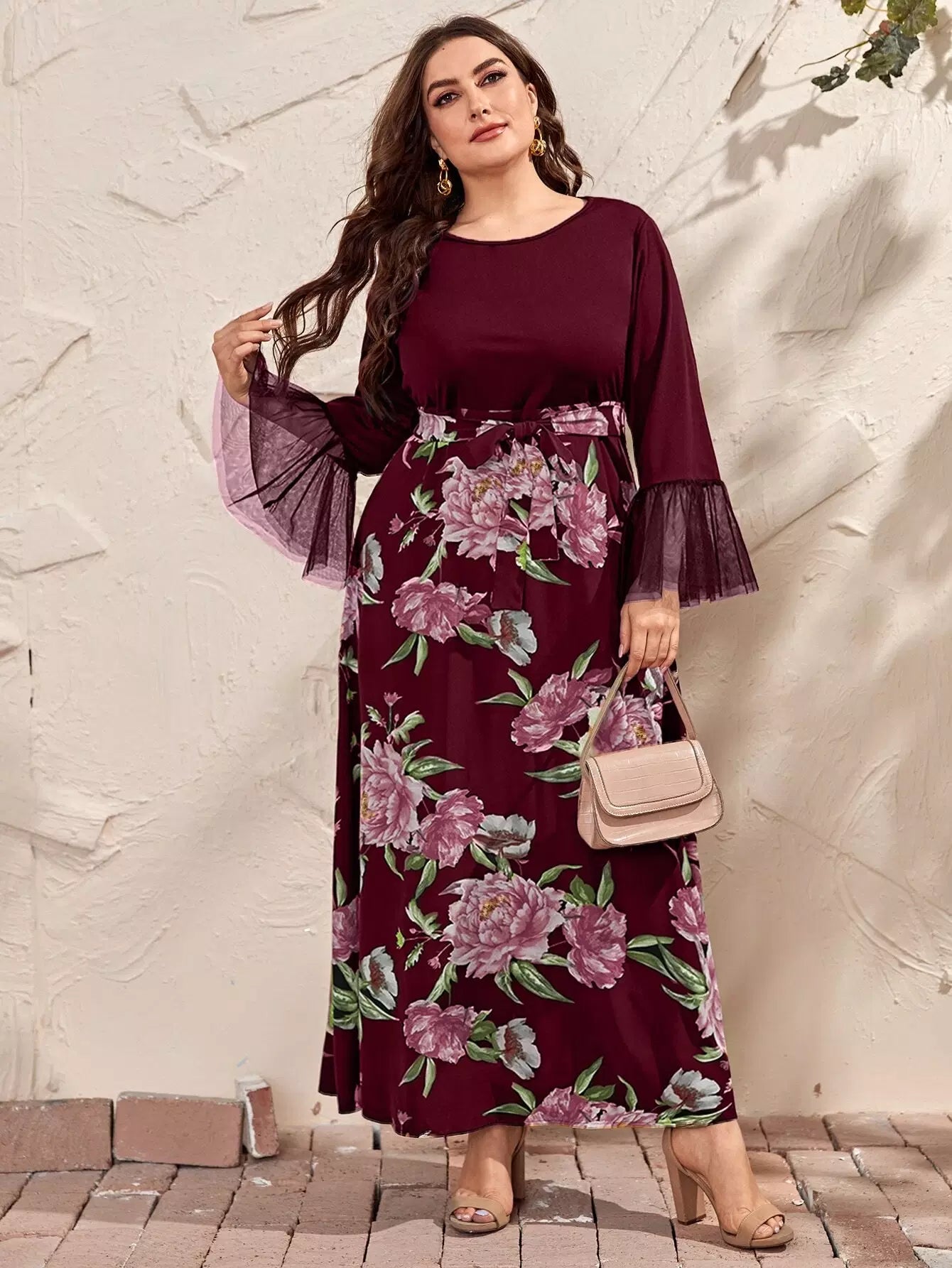 بالإضافة إلى فستان شبكي متباين بأكمام واسعة وطبعة زهور بدون حزام