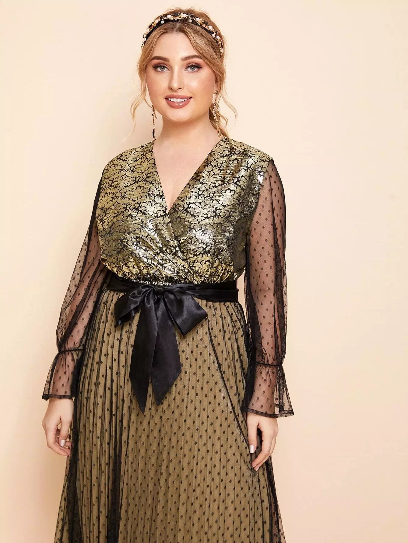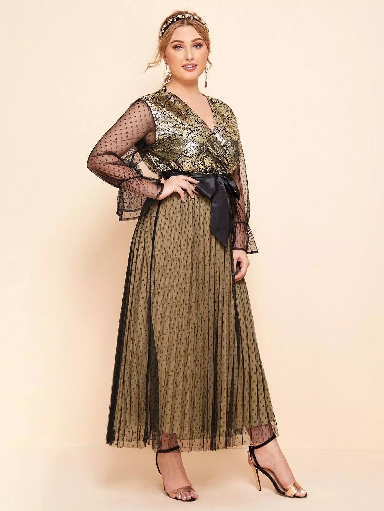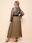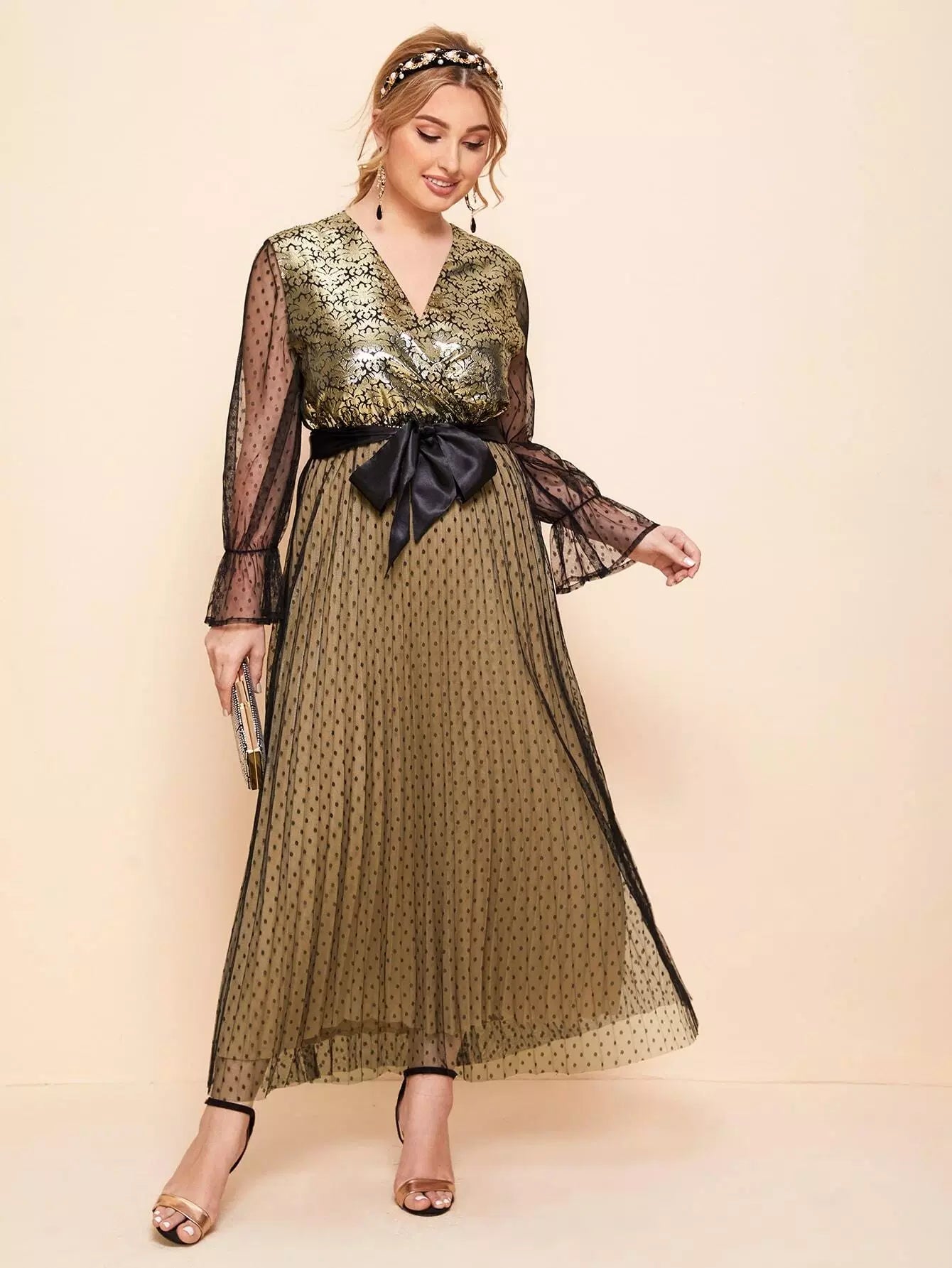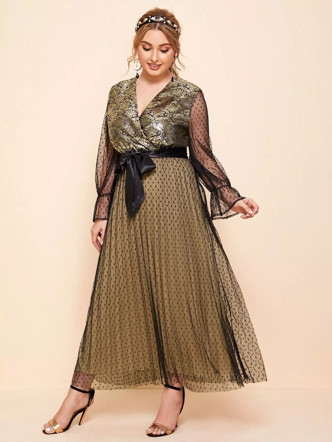فستان بأكمام مكشكشة وحاشية مطوية من قماش شبكي بلون متباين بدون حزام