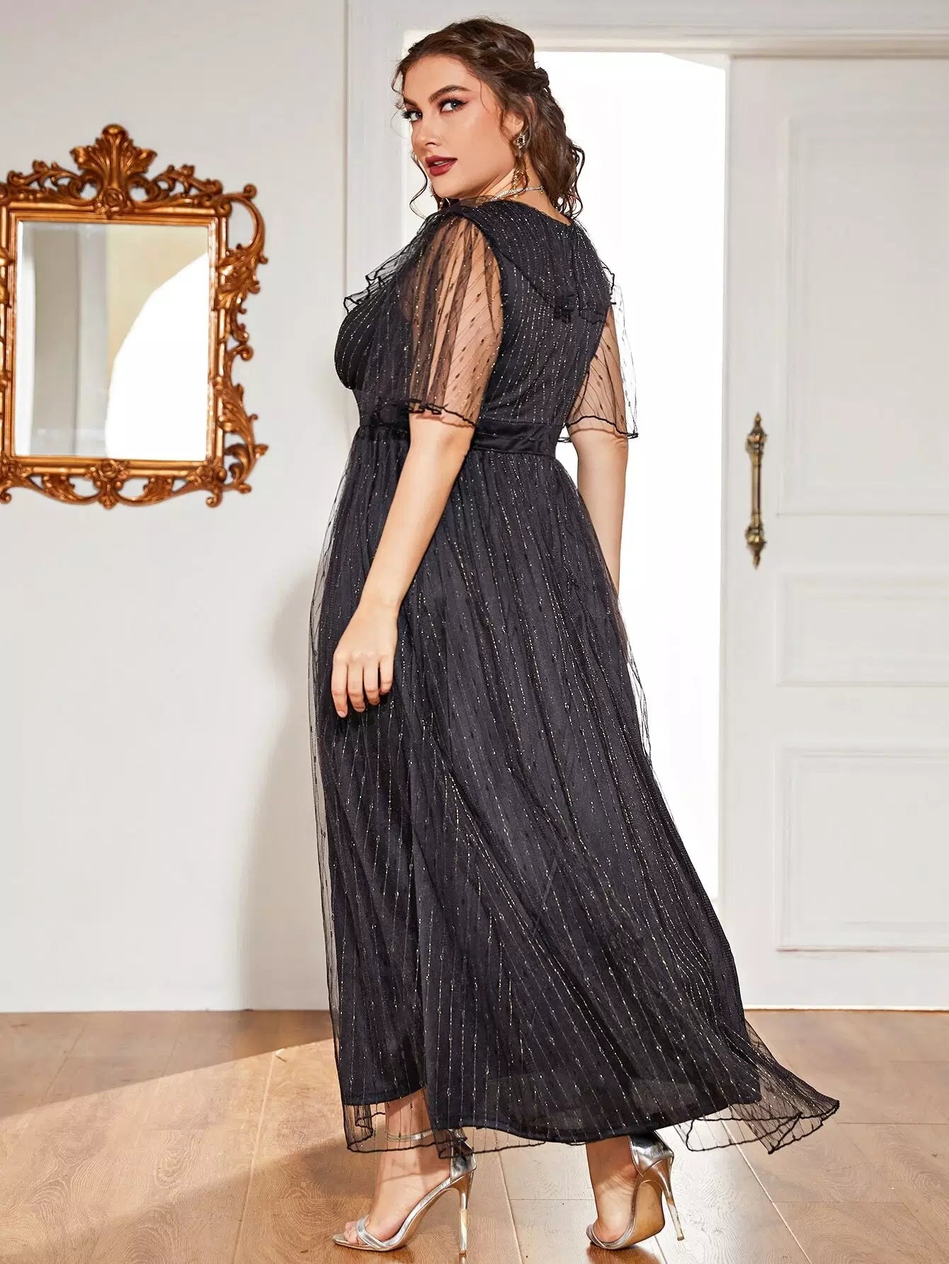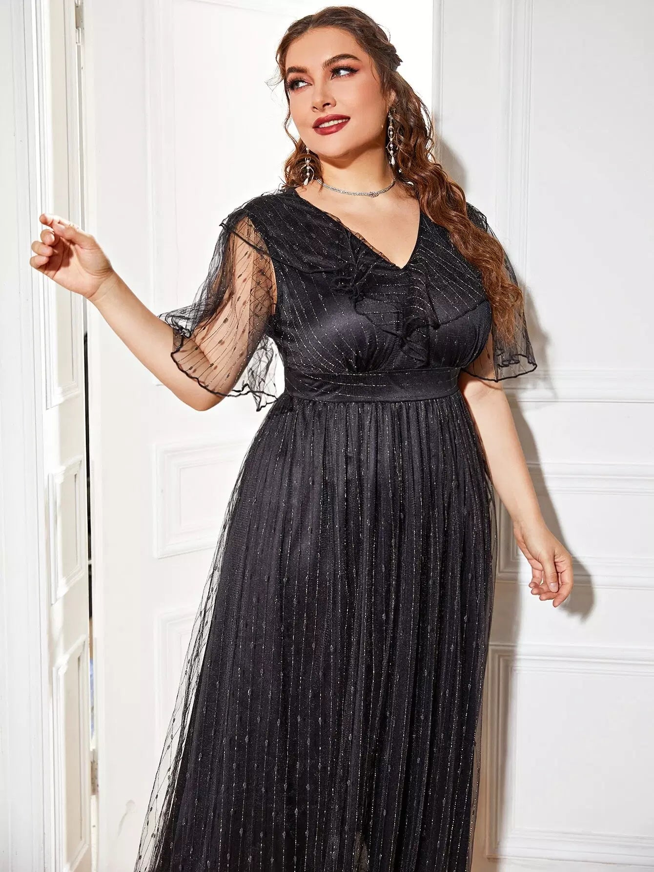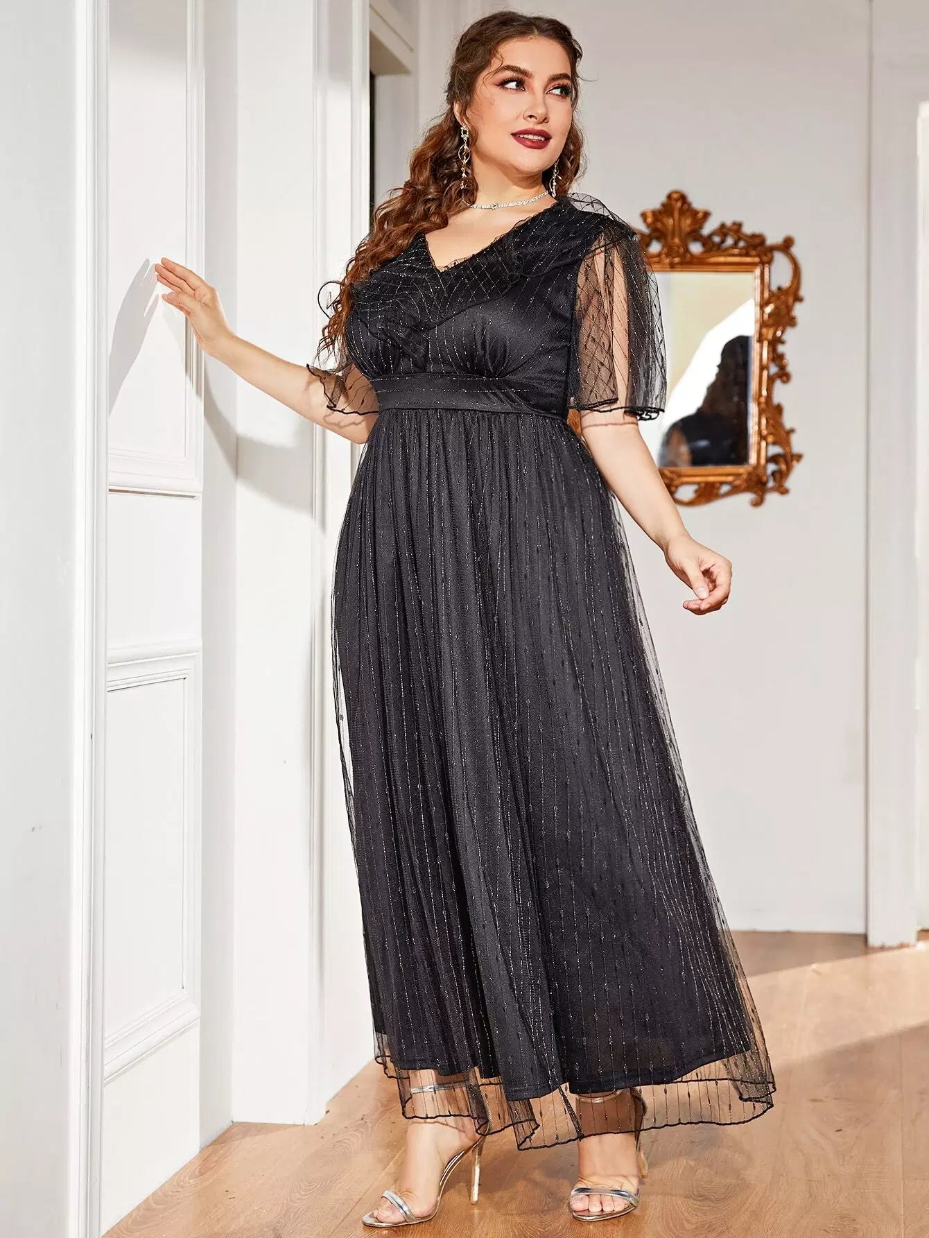 نحيف - مقاس كبير فستان على شكل حرف A بأكمام شبكية متباينة