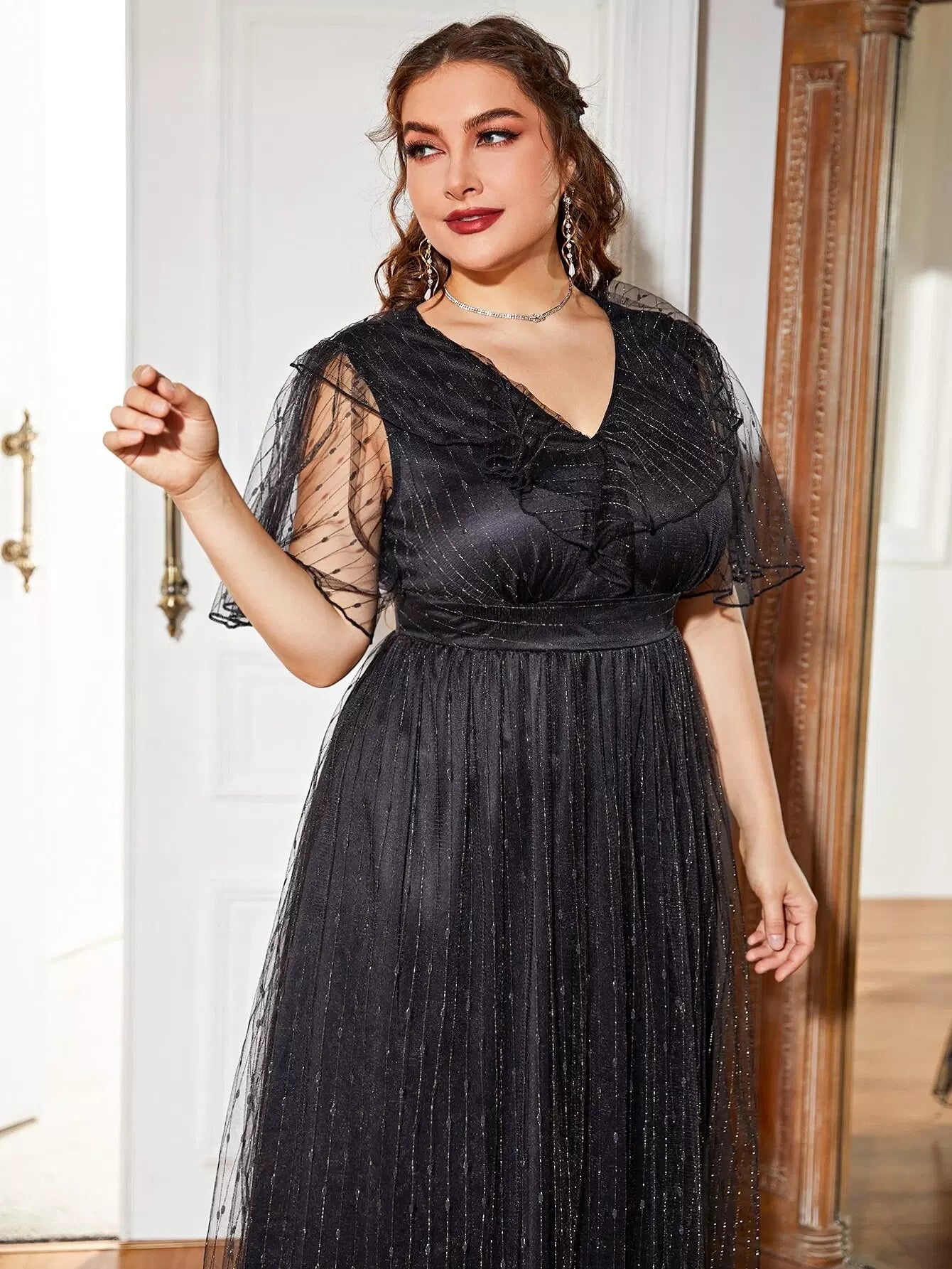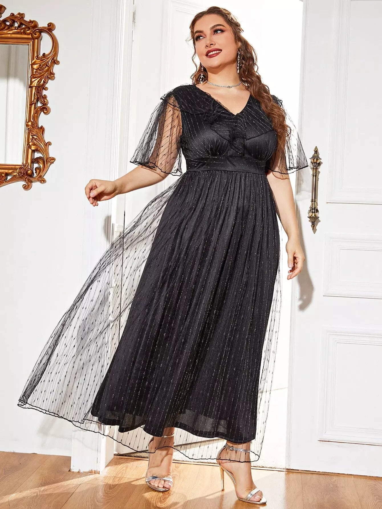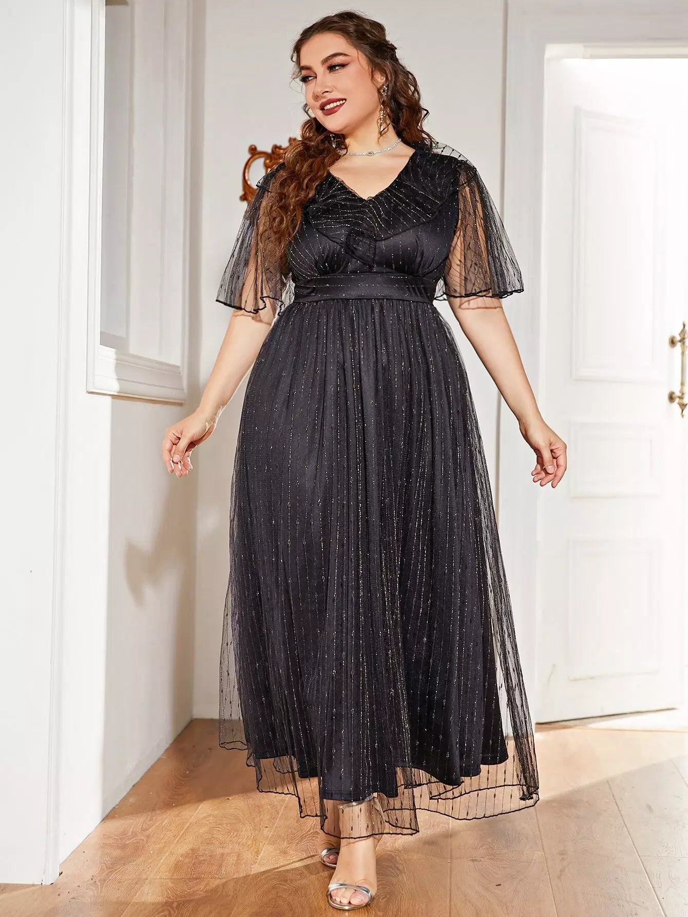 نحيف - مقاس كبير فستان على شكل حرف A بأكمام شبكية متباينة