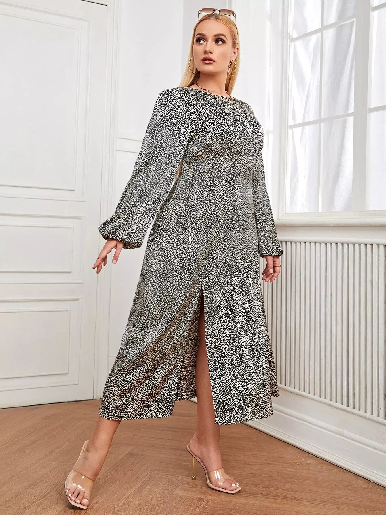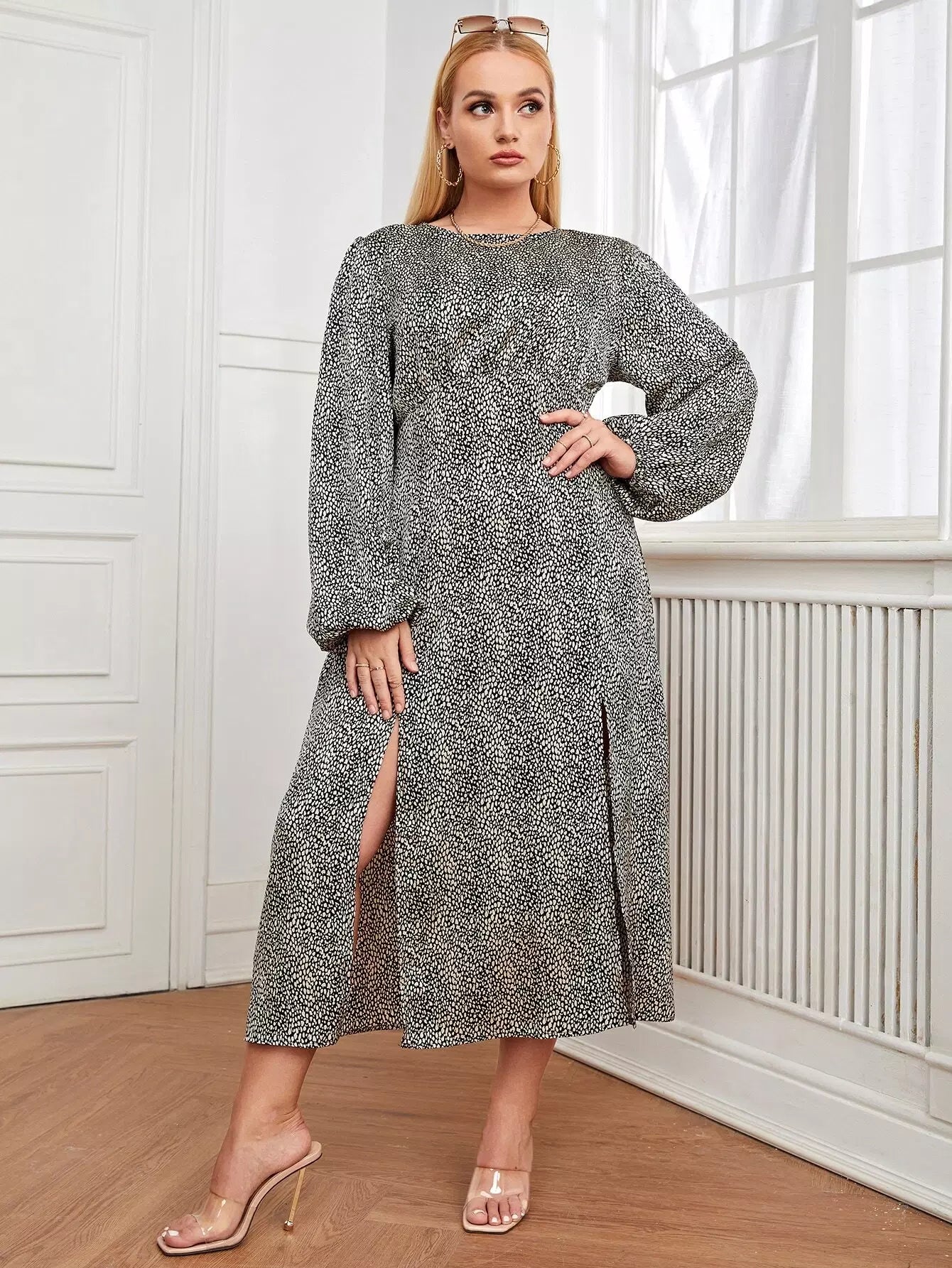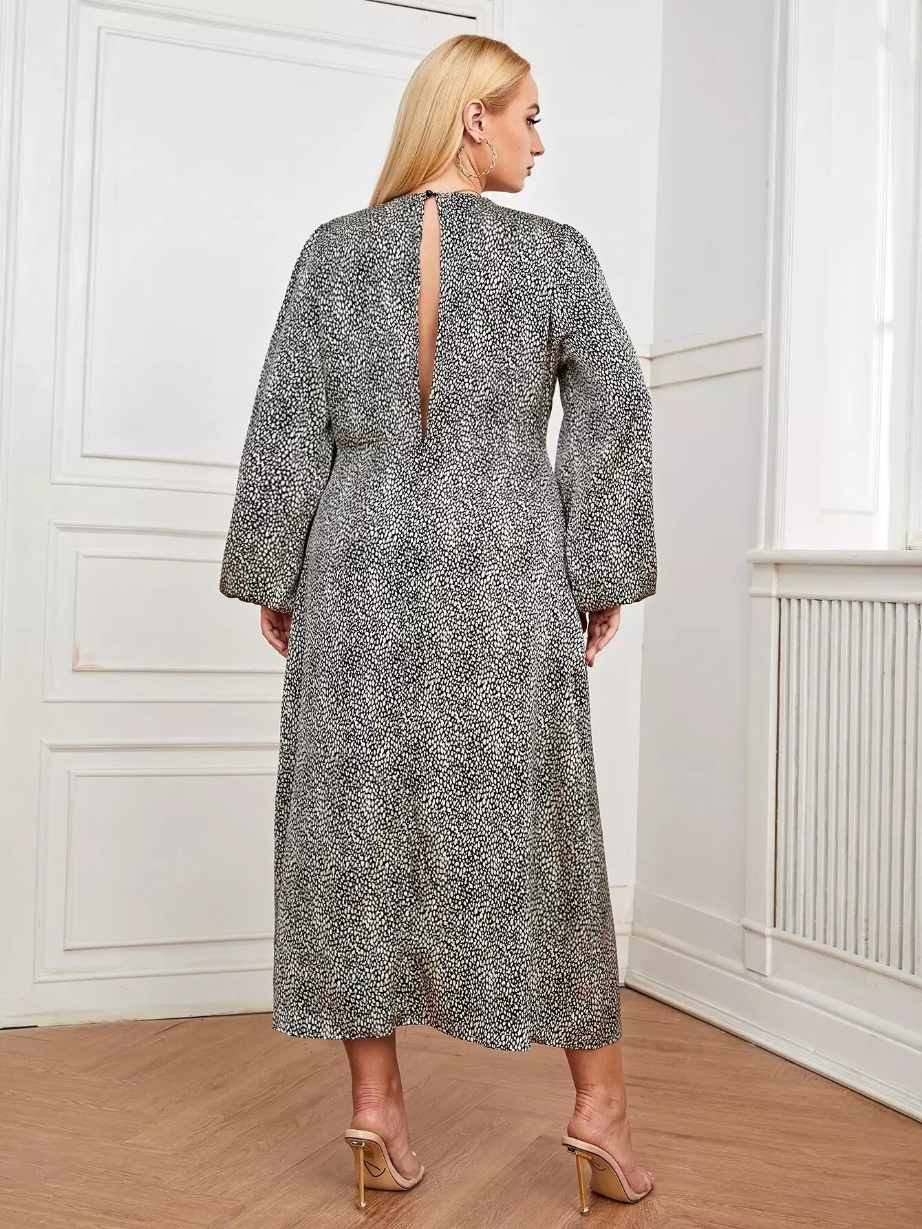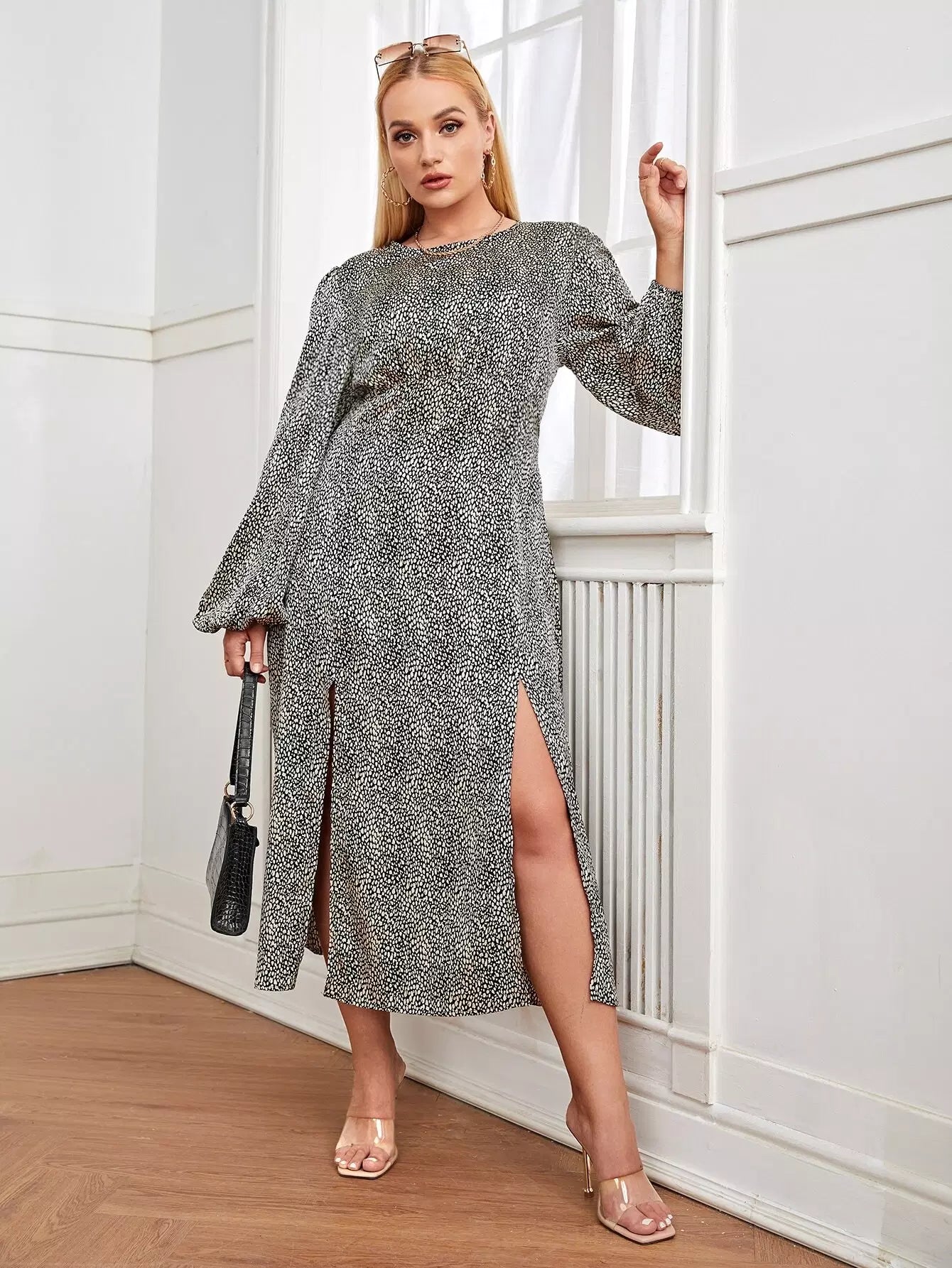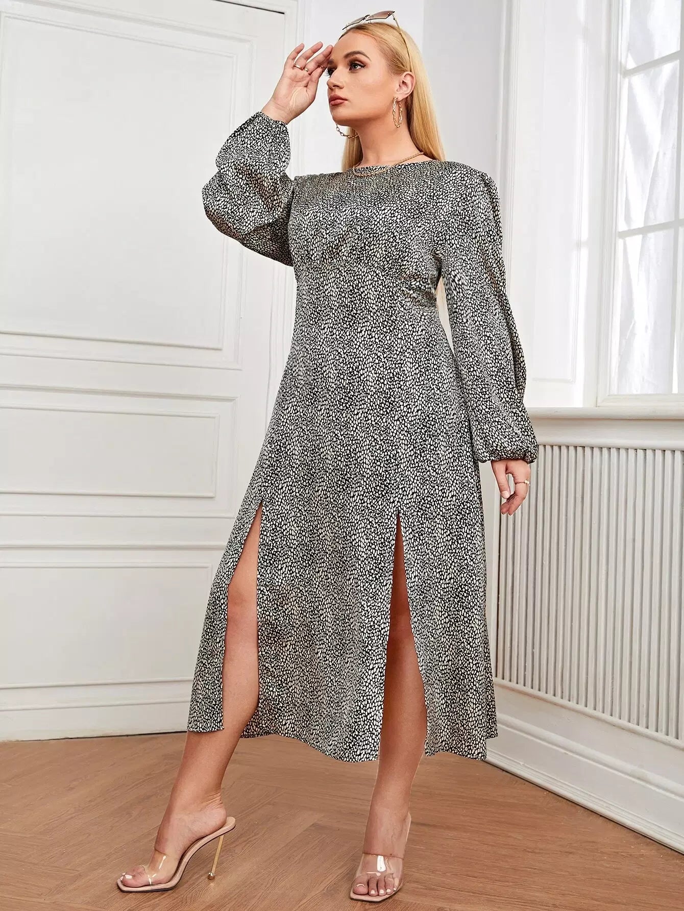 فستان بأكمام فانوس مطبوع بطبعة م مرقش زائد بحافة مشقوقة من الخلف