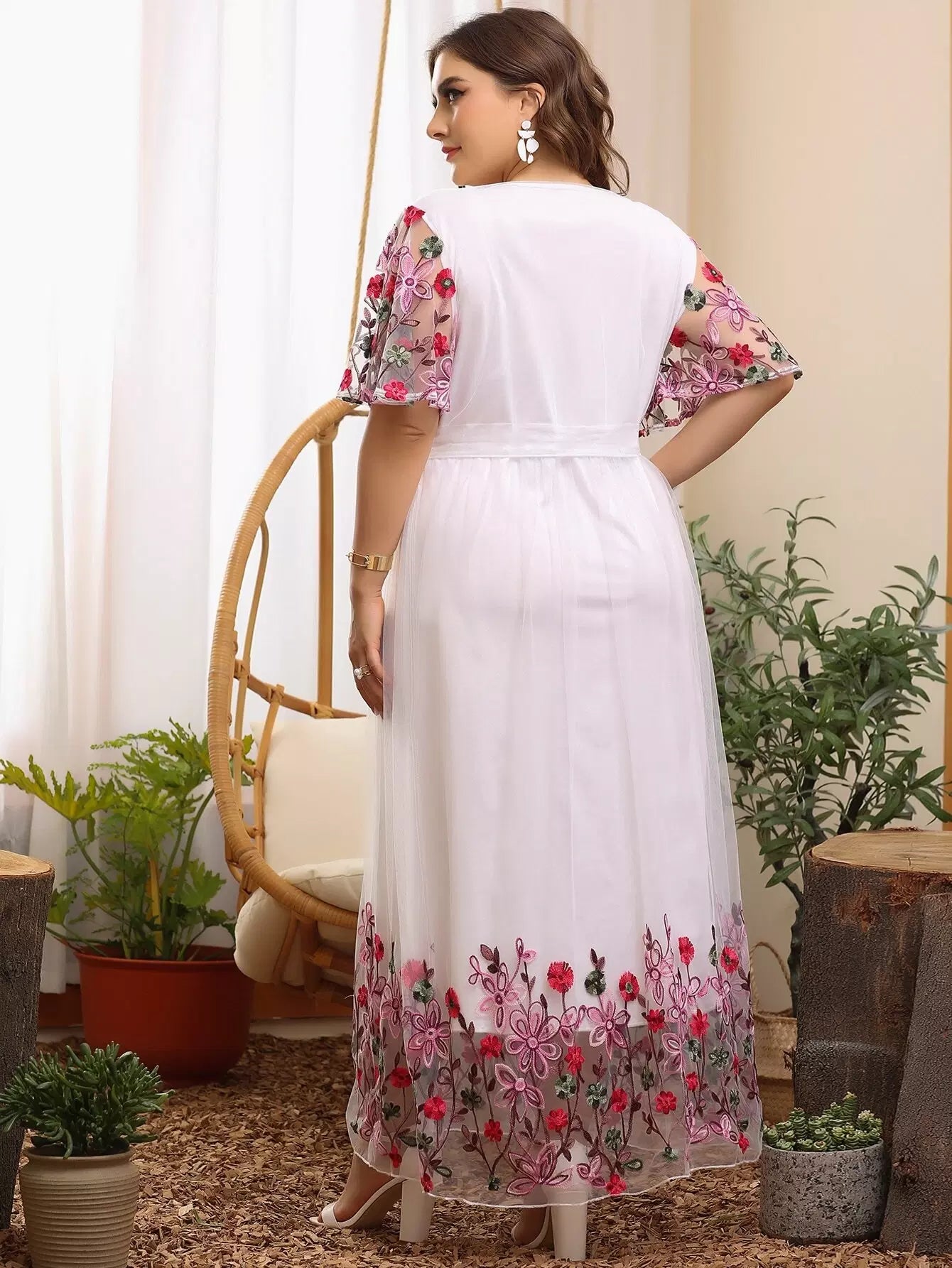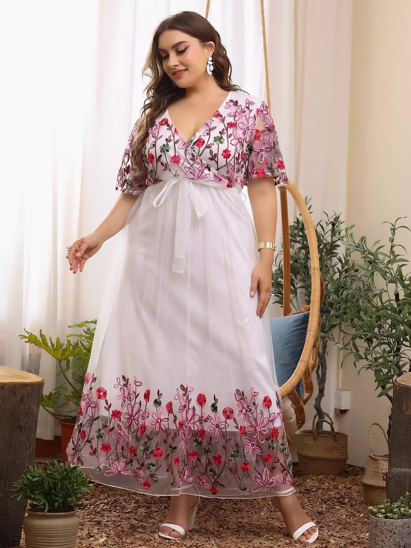 بالإضافة إلى فستان شبكي مطرز طويل على شكل حرف A بدون حزام