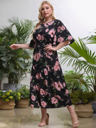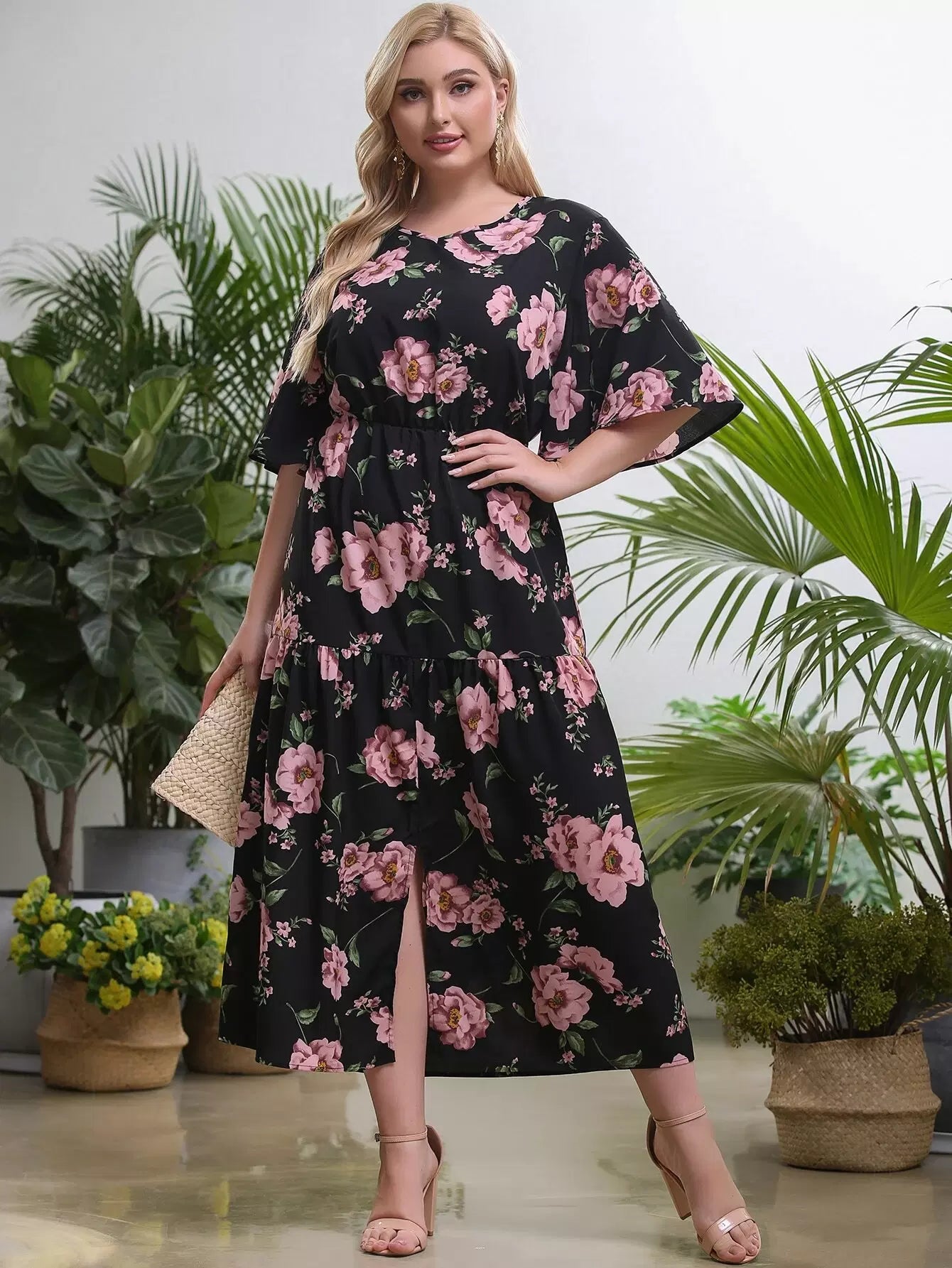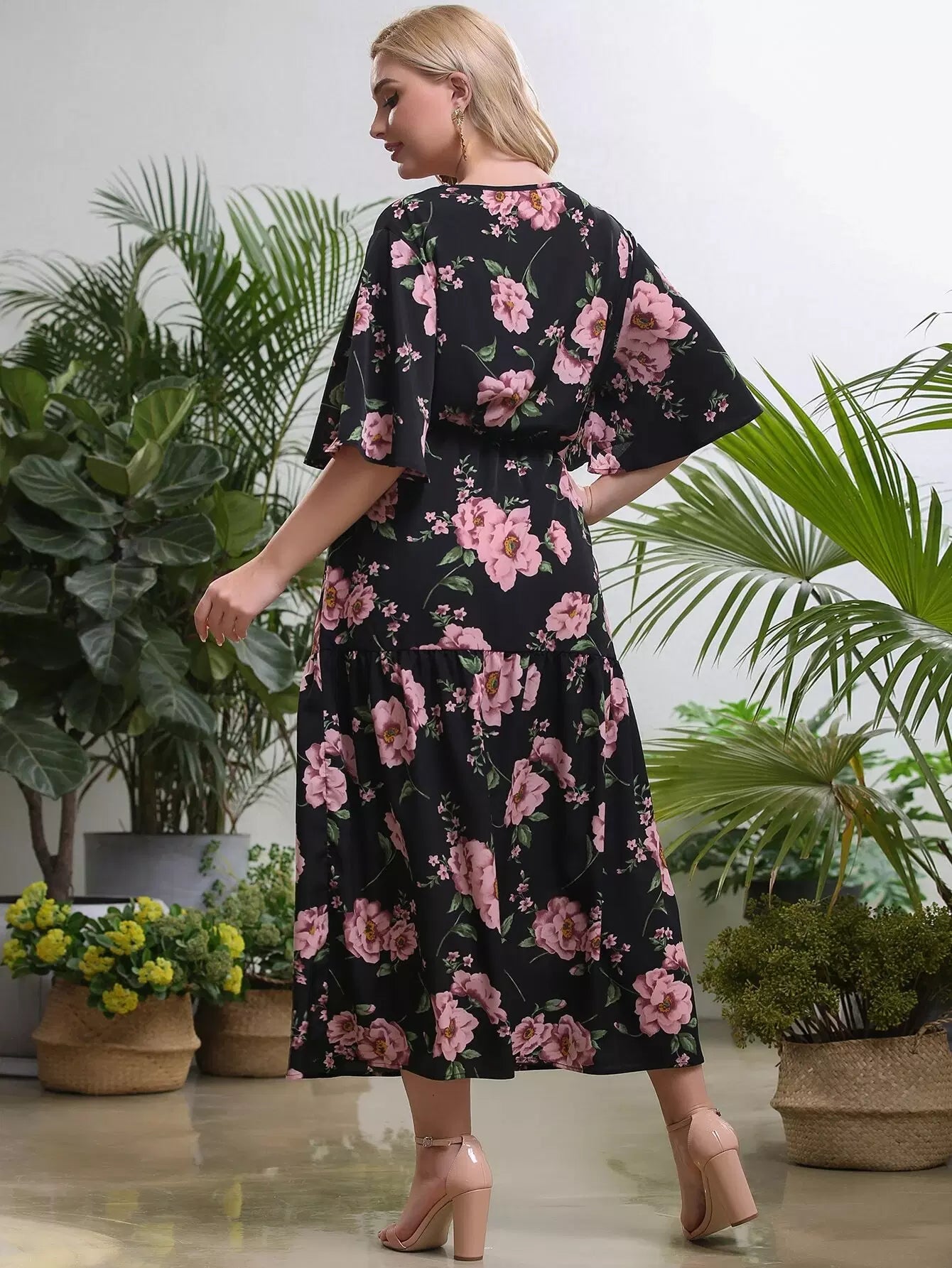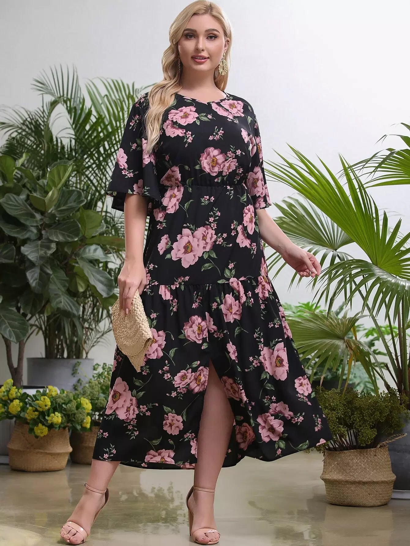 فستان زائد بأكمام زهرية منقسمة الحواف بأزهار زائدة