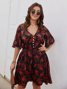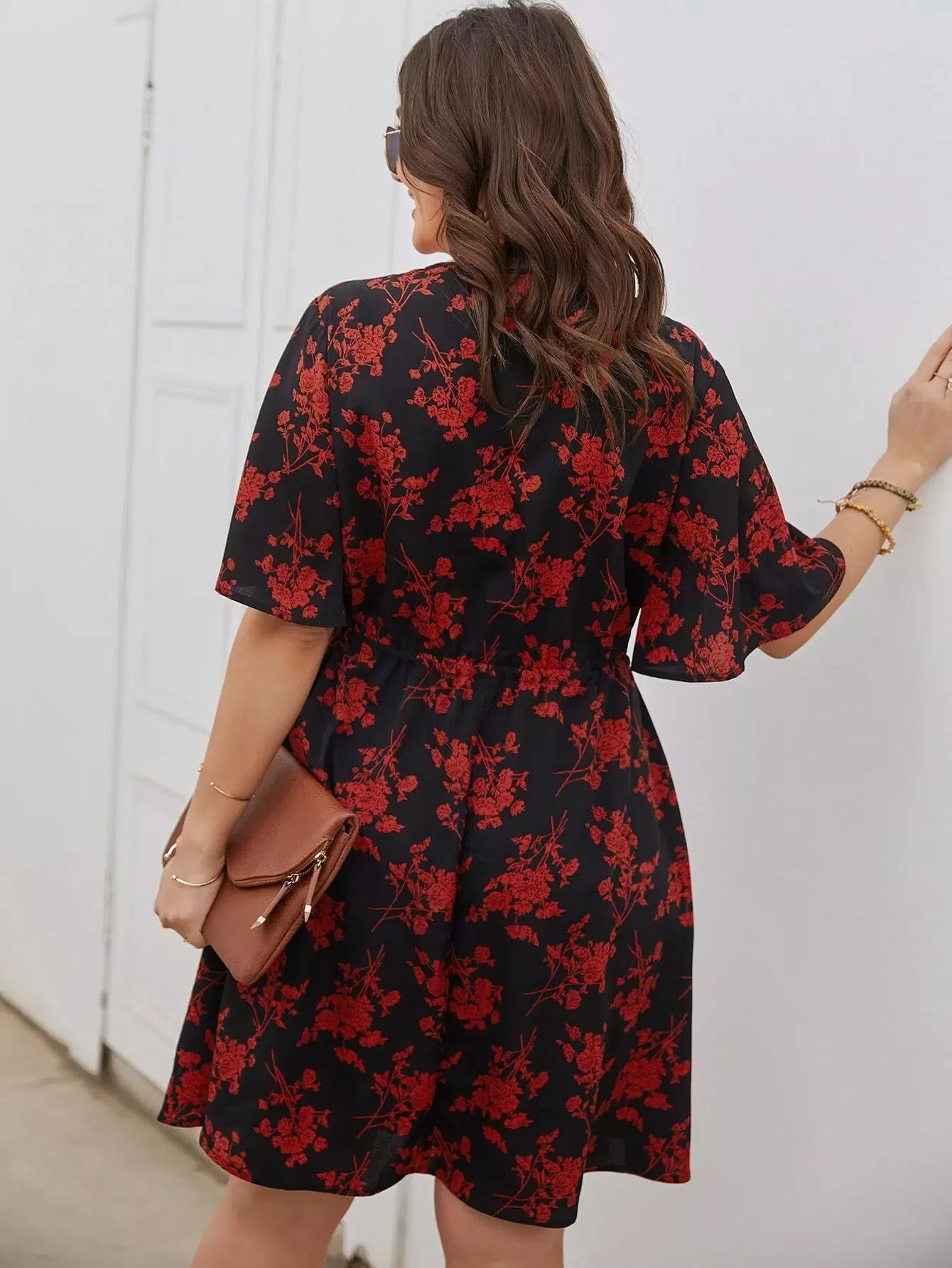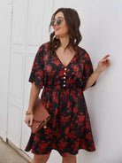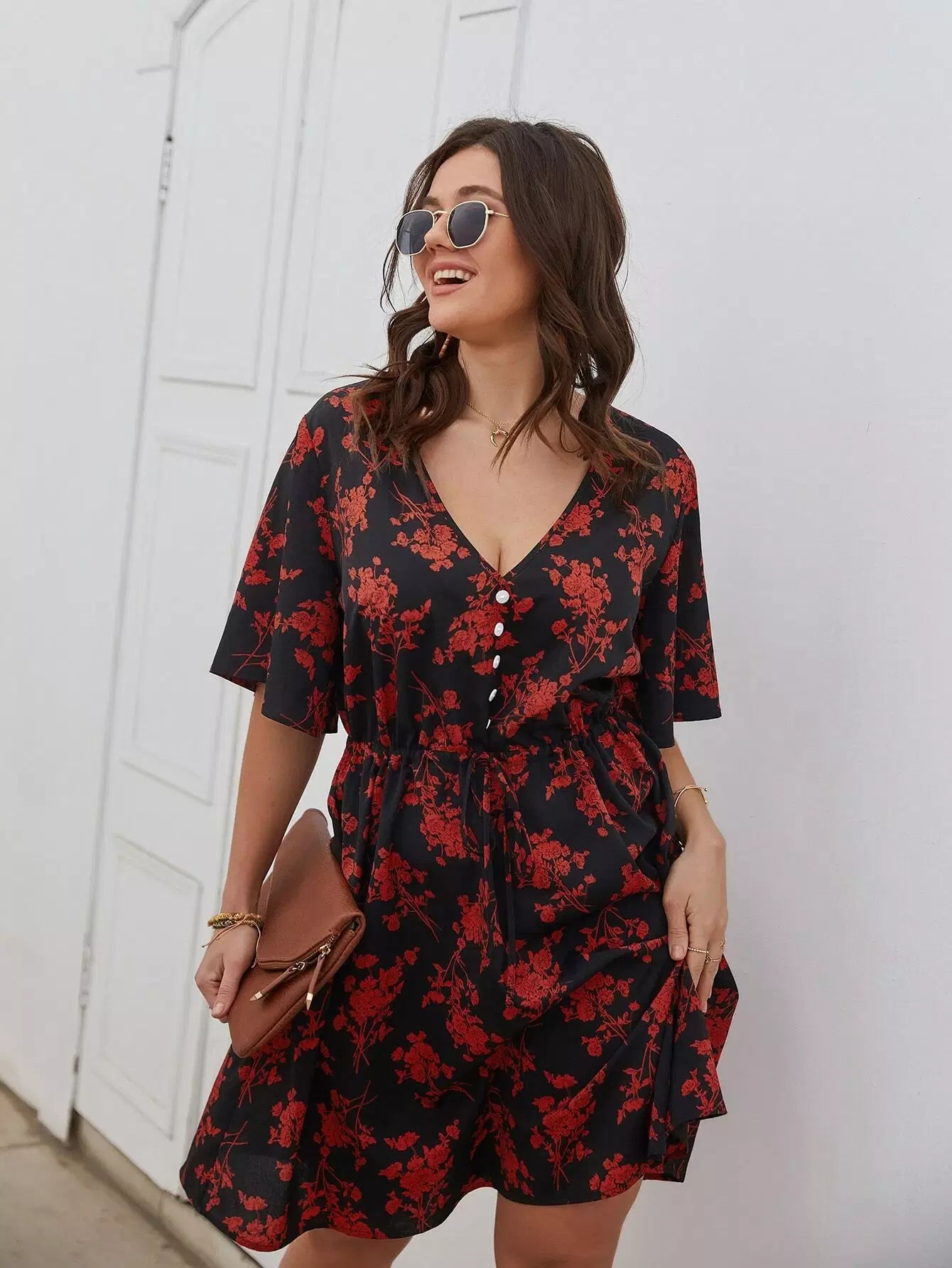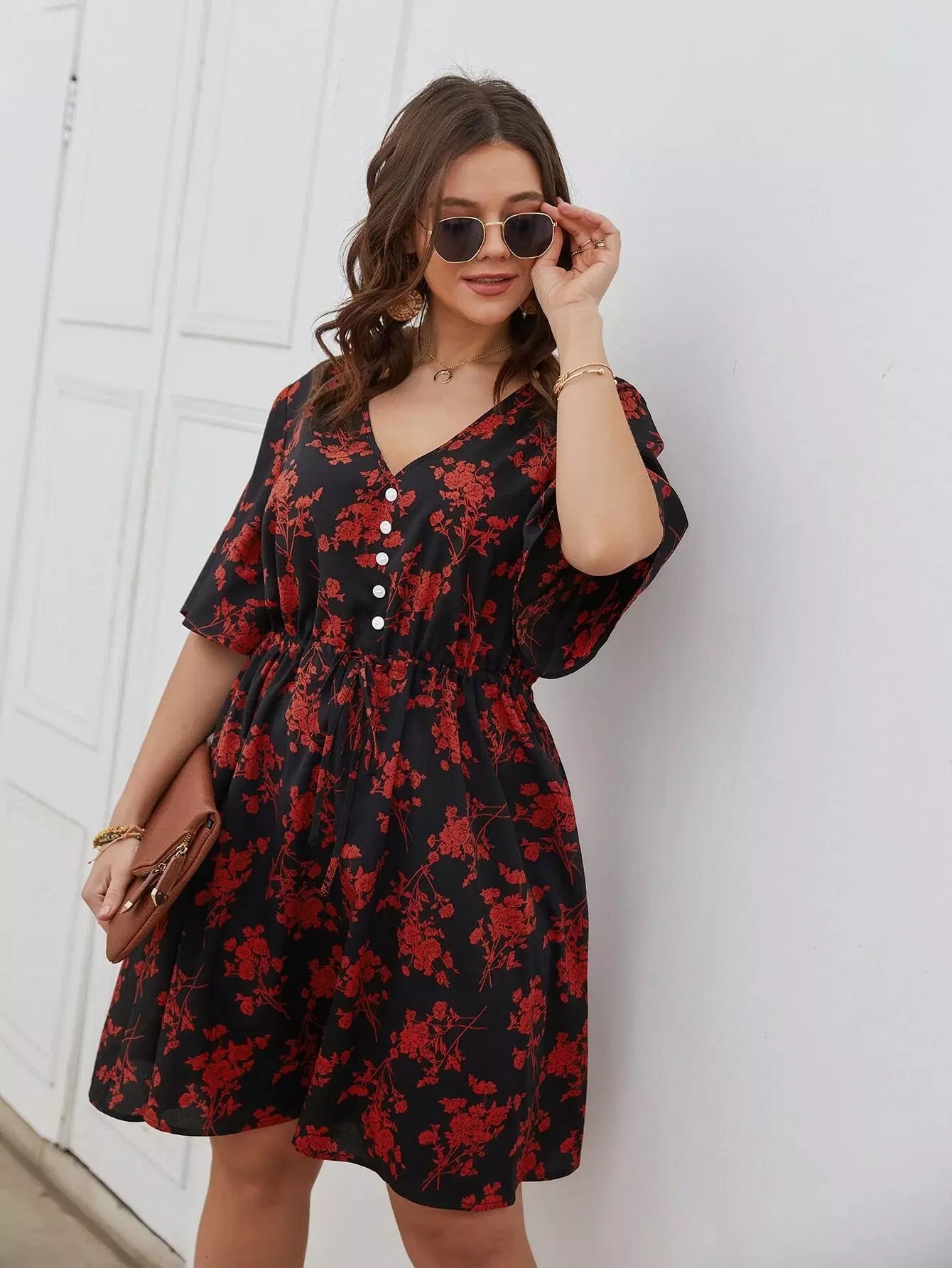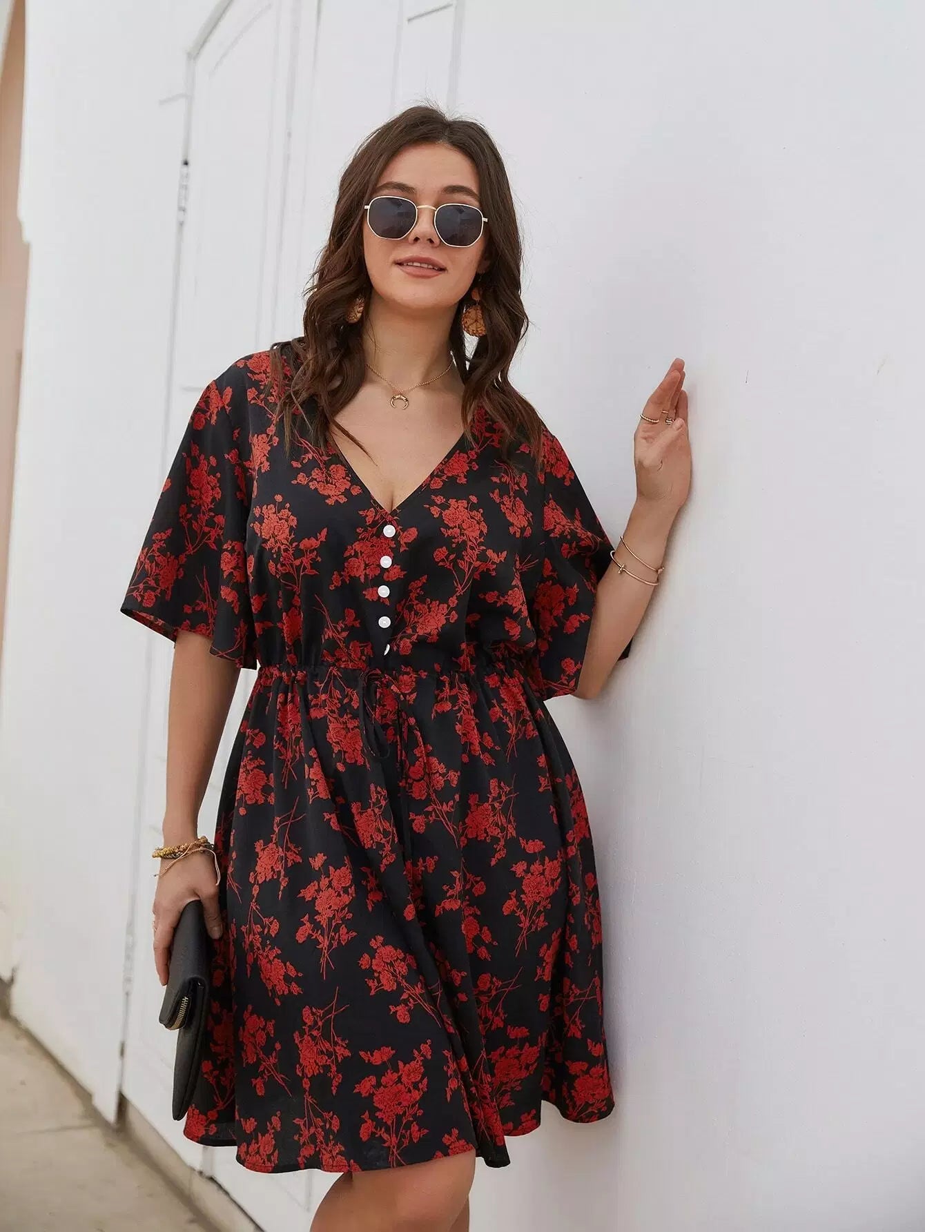 فستان بطبعة زهور مطبوع بأزرار على شكل حرف A
