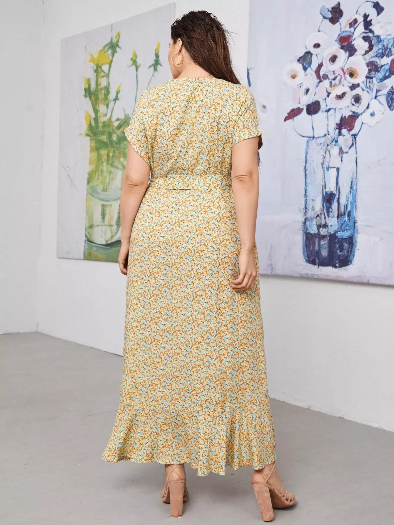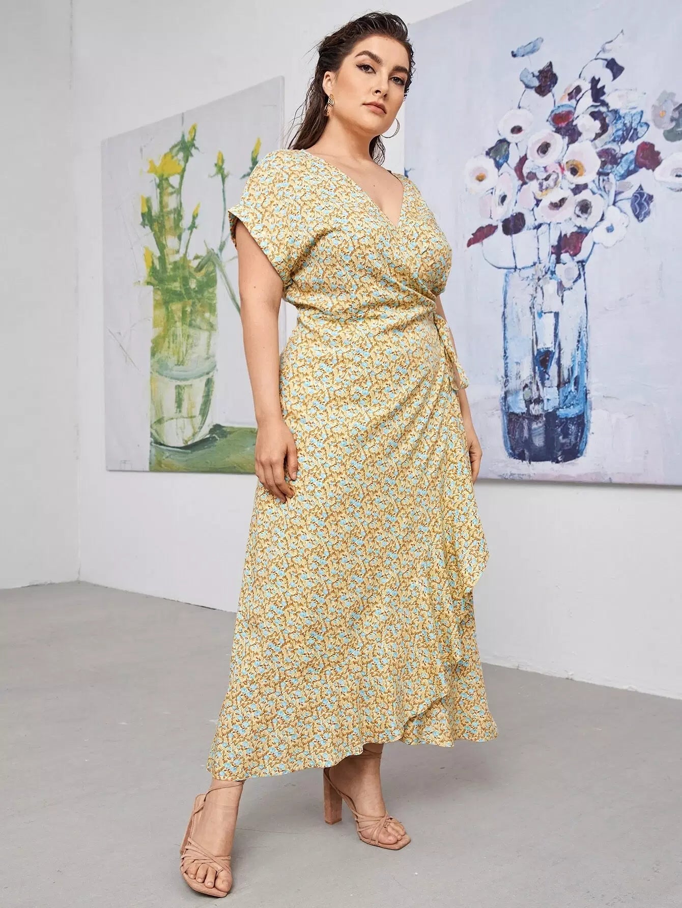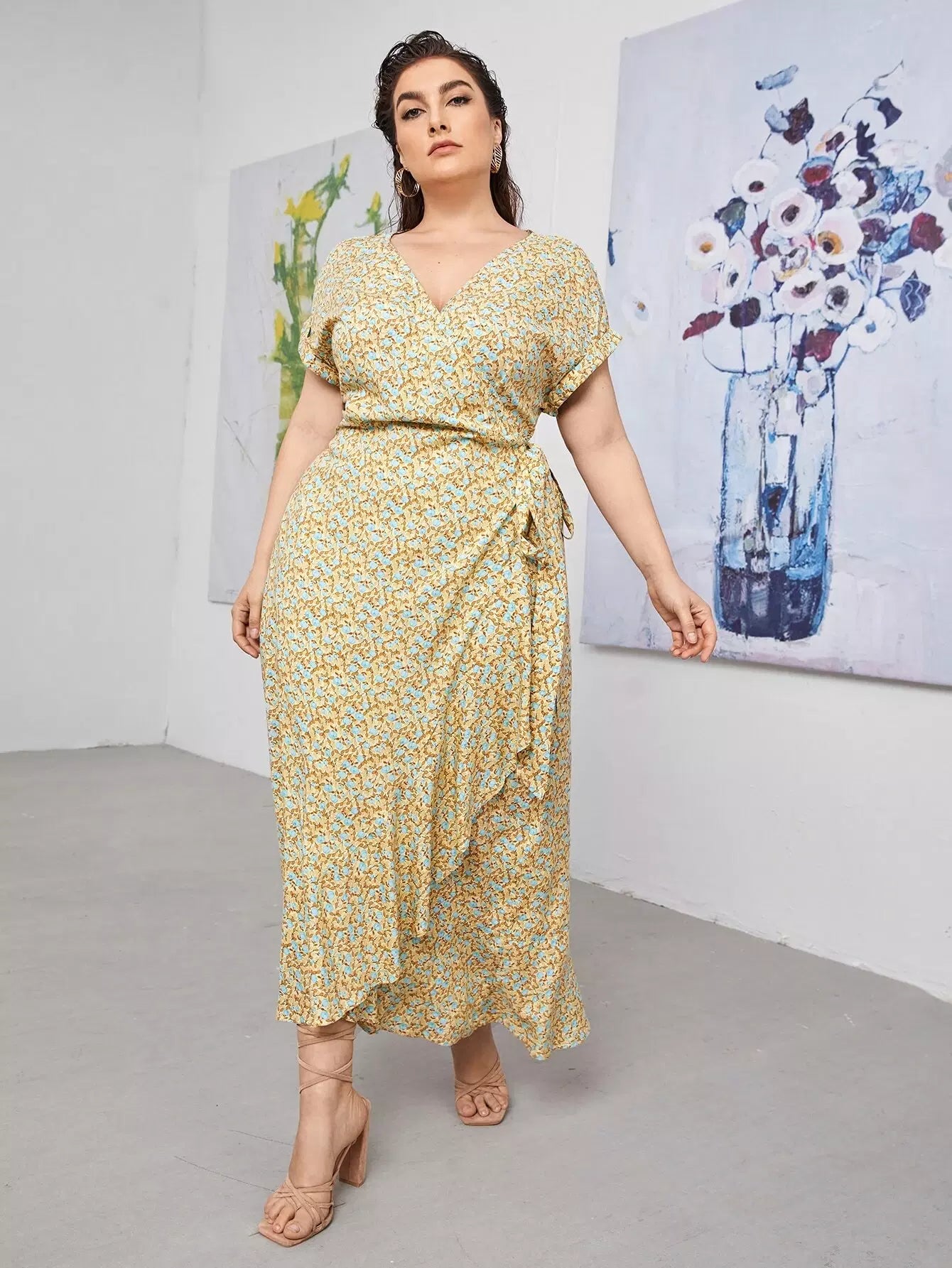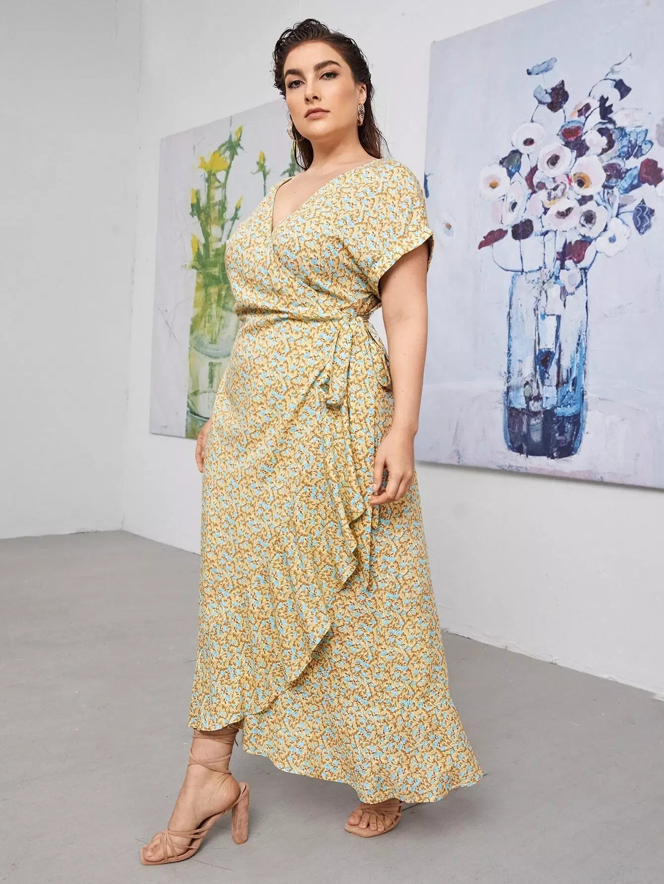 نحيف - مقاس كبير فستان بطبعة زهور وعقدة جانبية