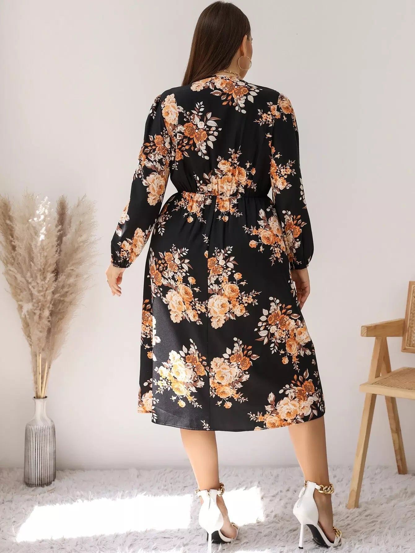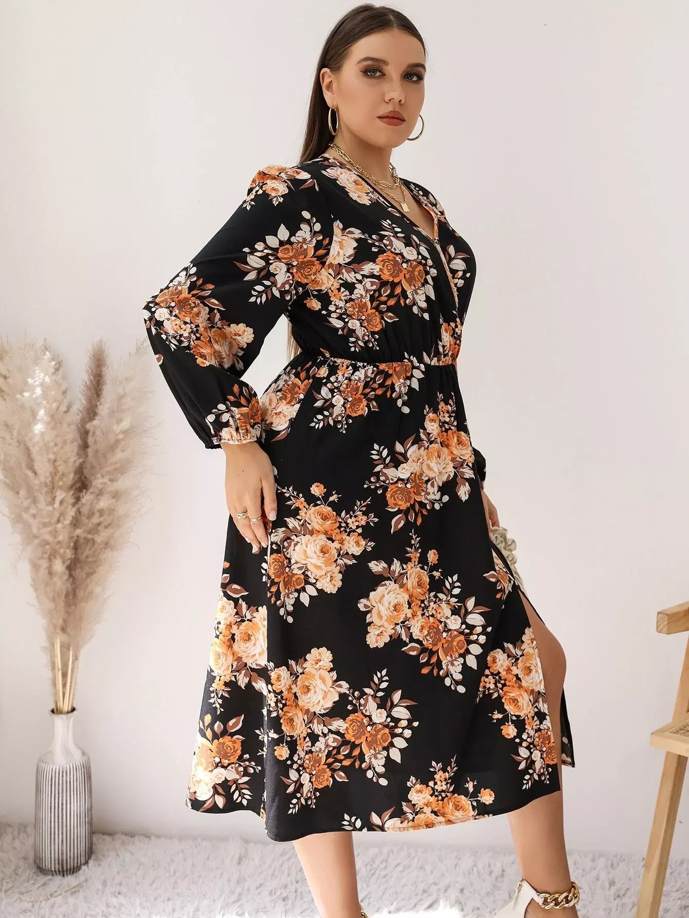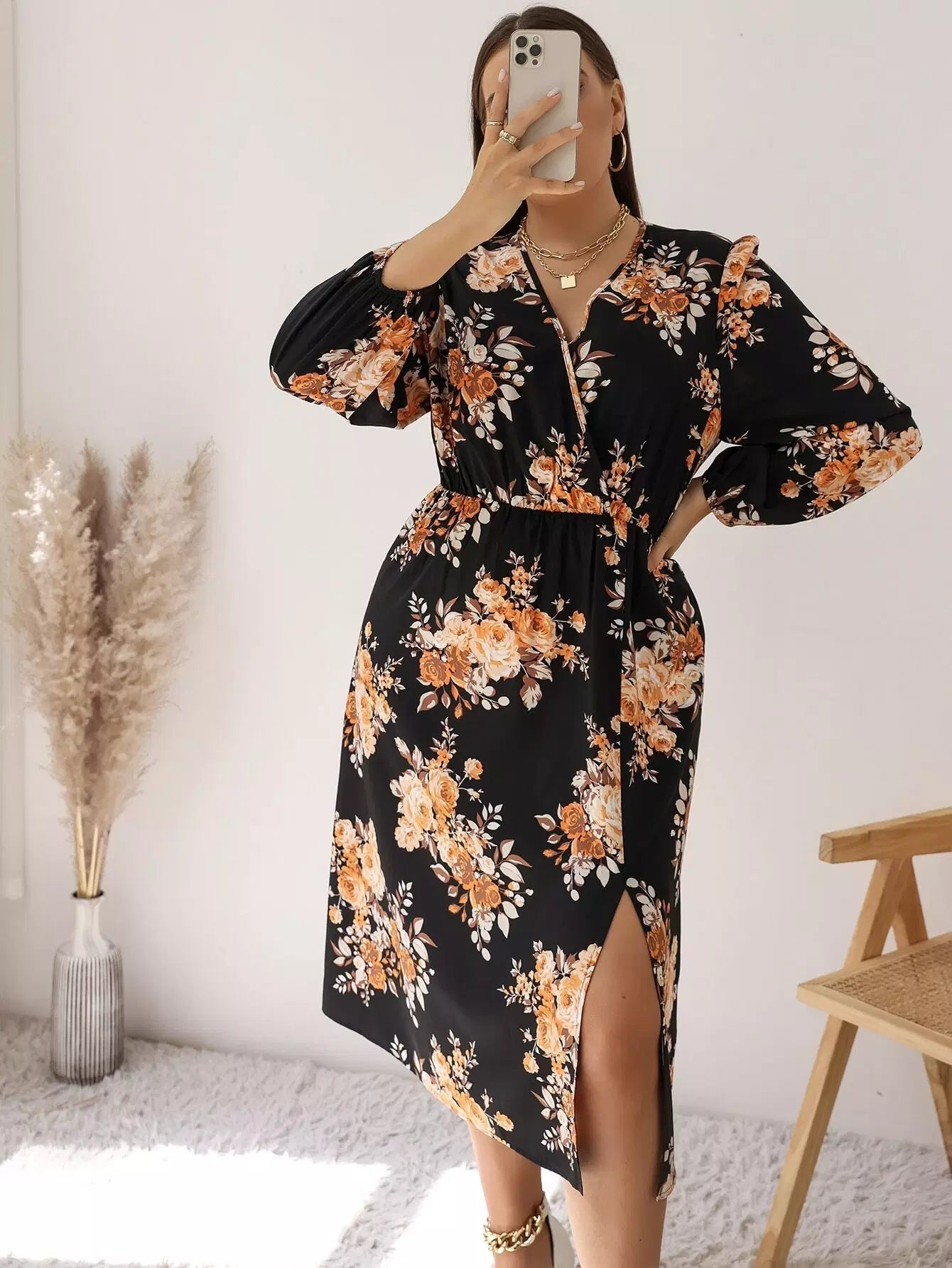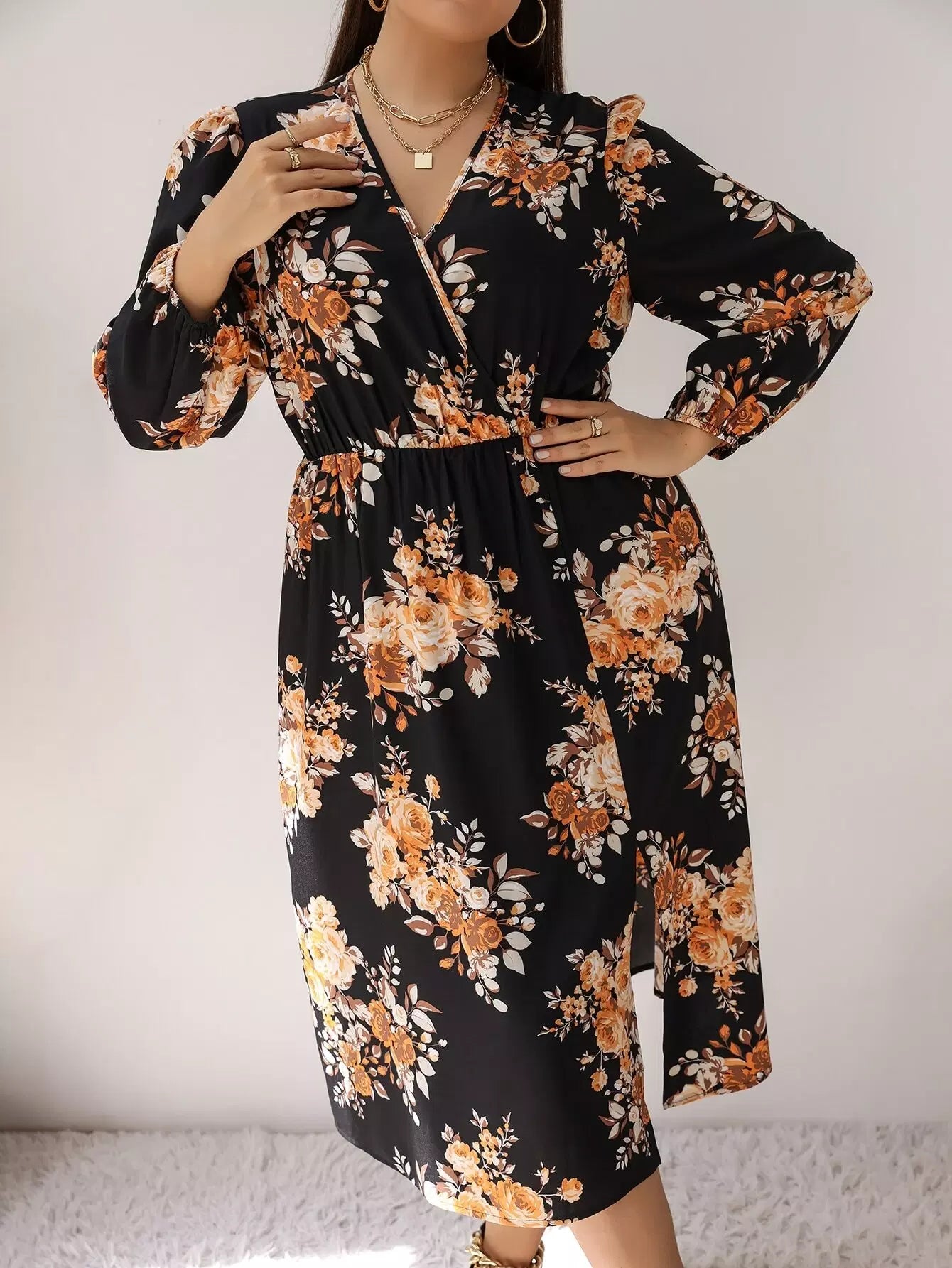 فستان بياقة متداخلة بياقة متداخلة وأكمام فستان بفتحة فخذين متداخلة
