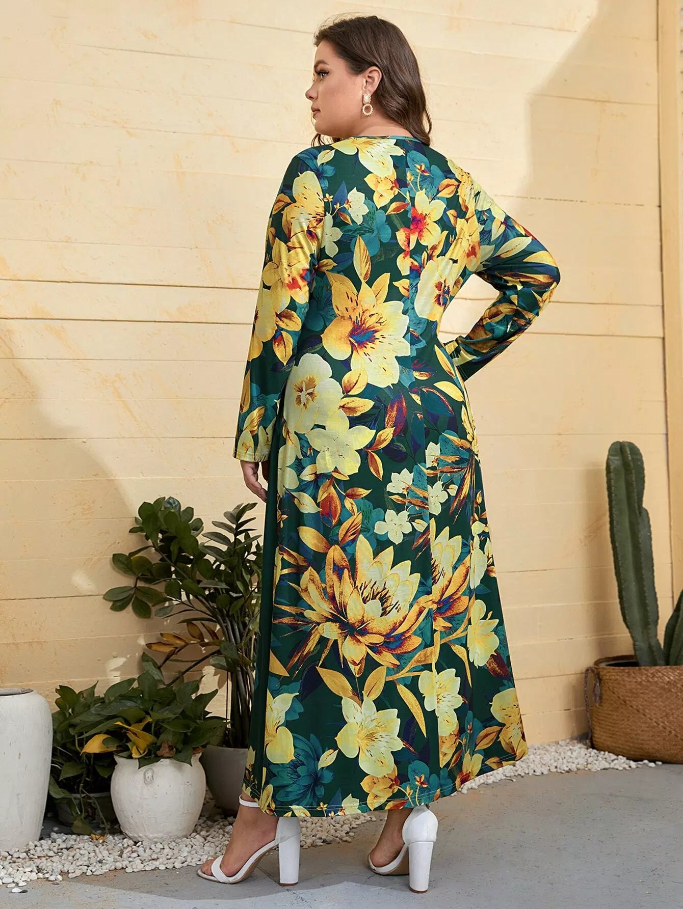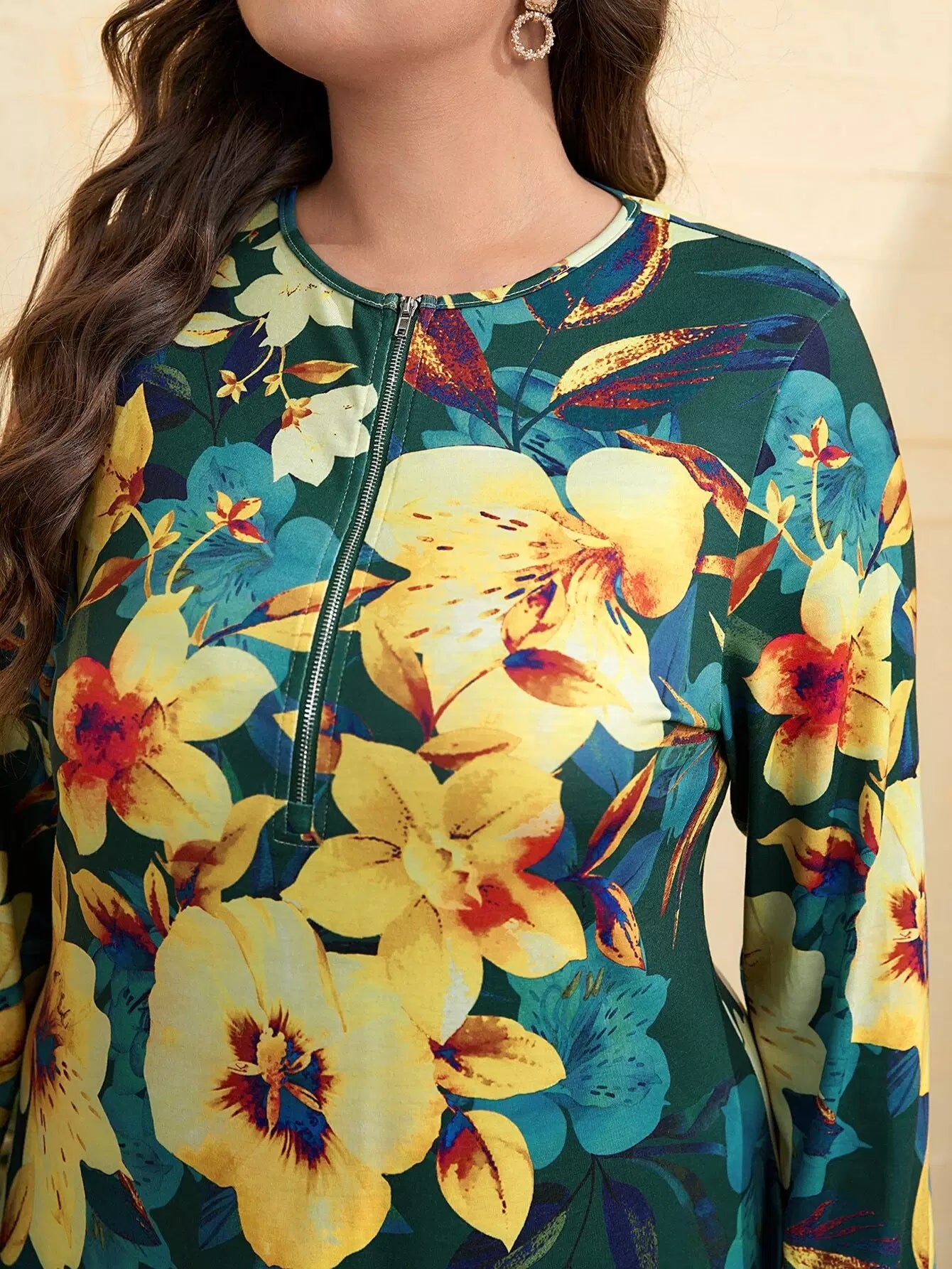 فستان مطبوع بطبعة زهور زائد بسحاب ربع مزين بالزهور