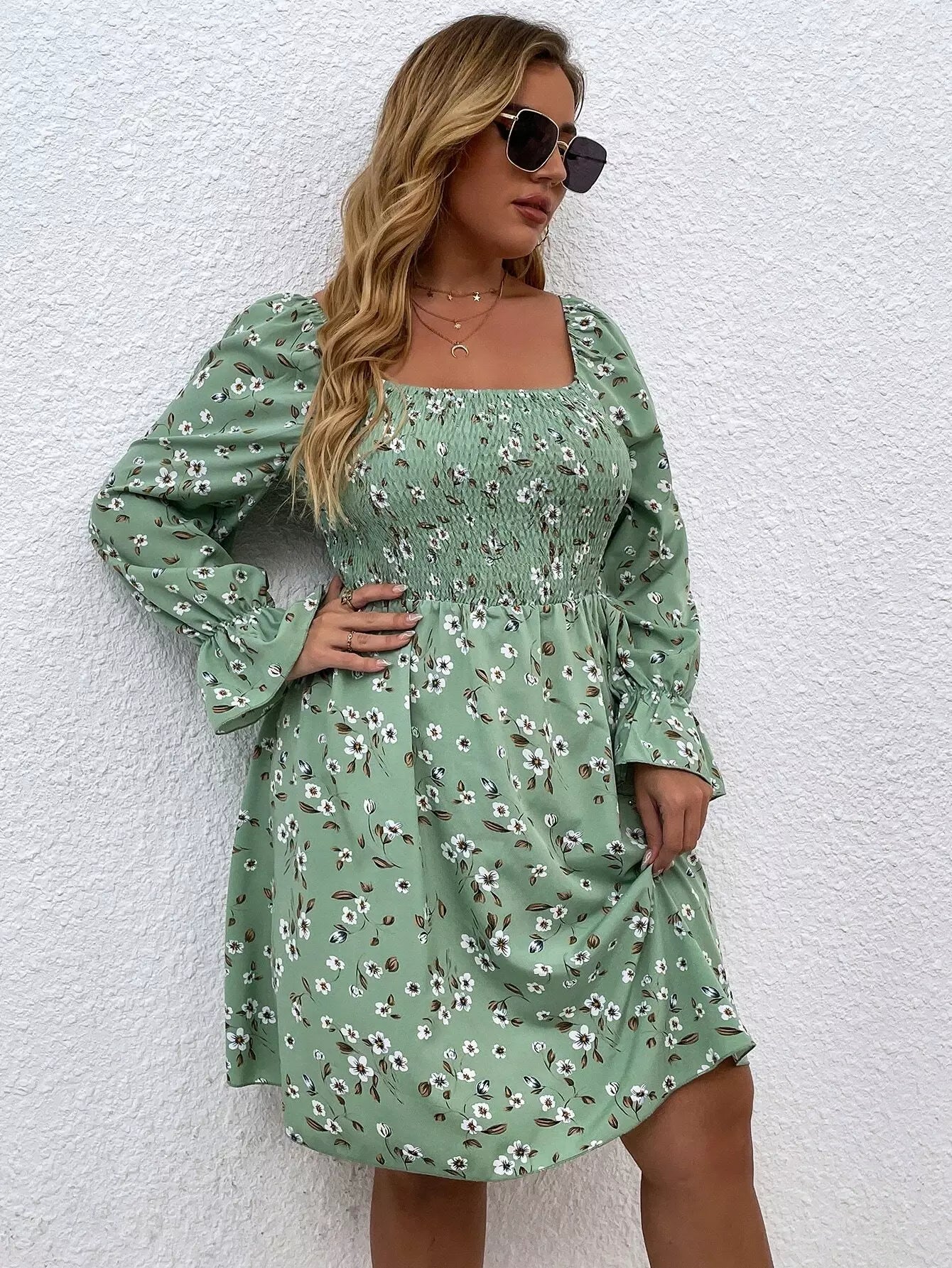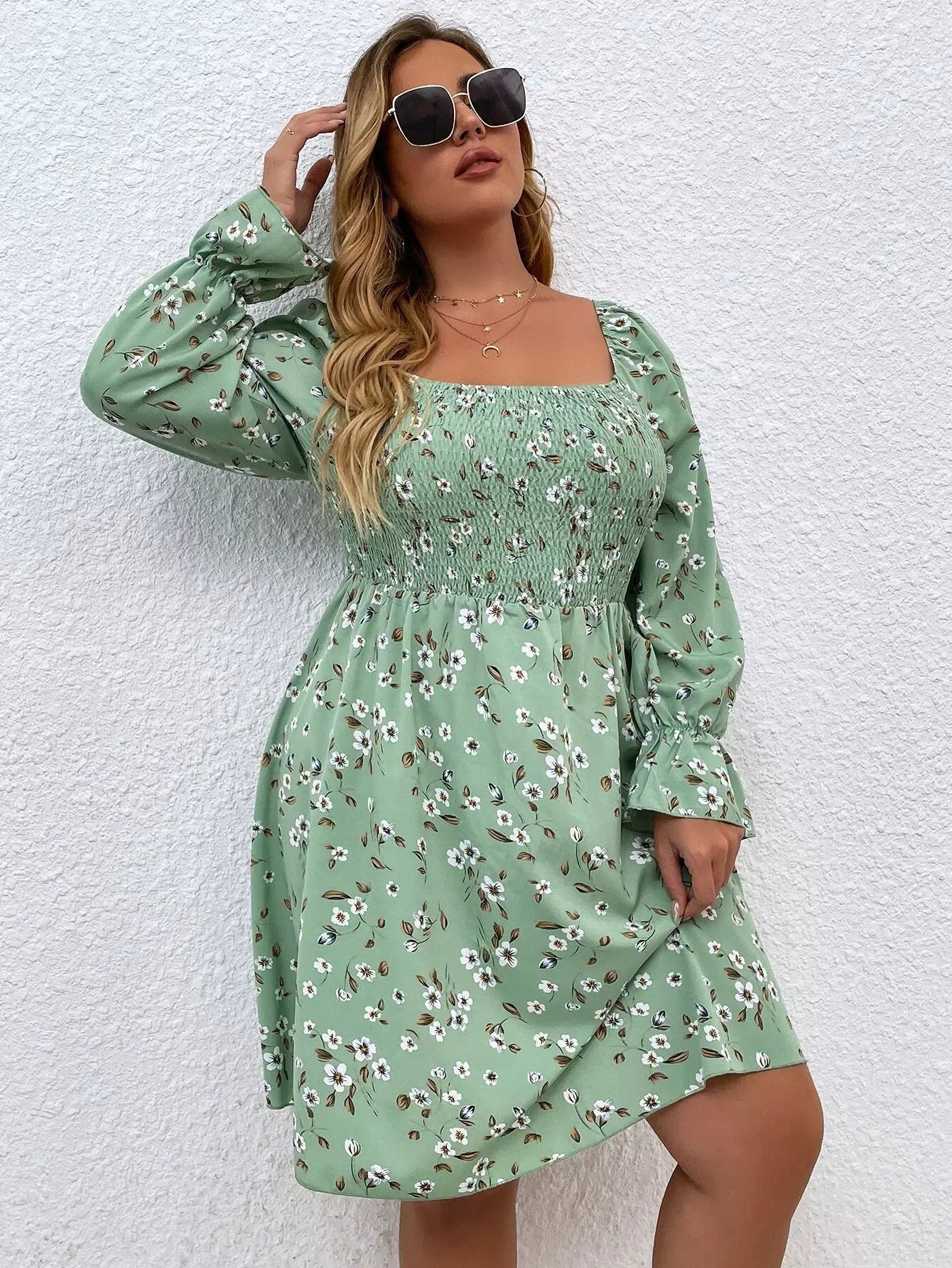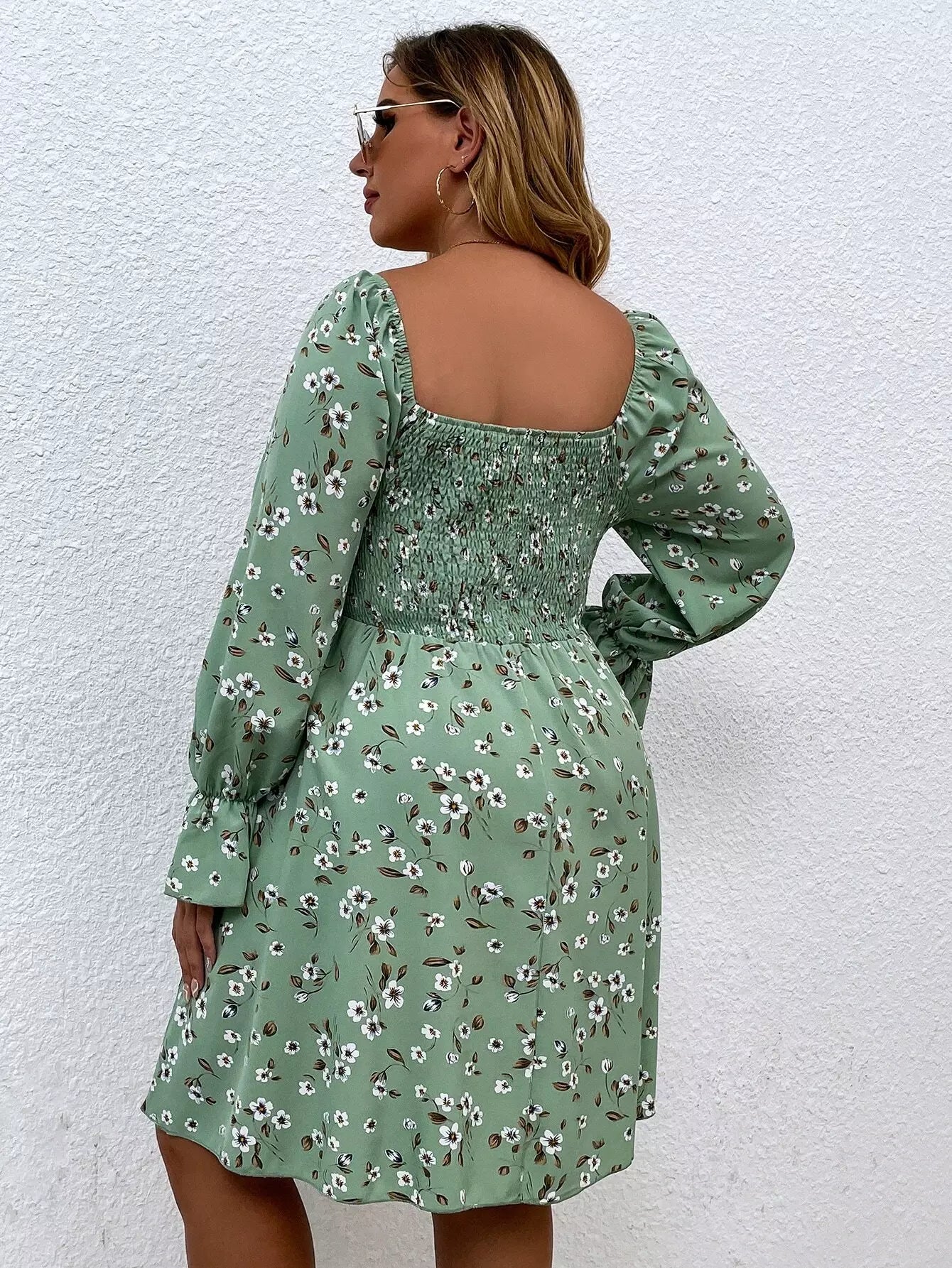 فستان بياقة مربعة برقبة مربعة بطبعة زهور مطبوعة على الصدر زائد