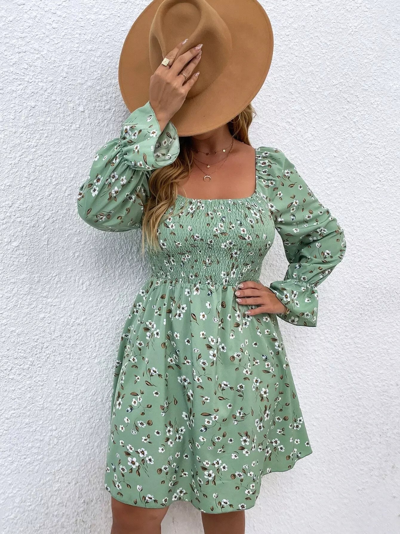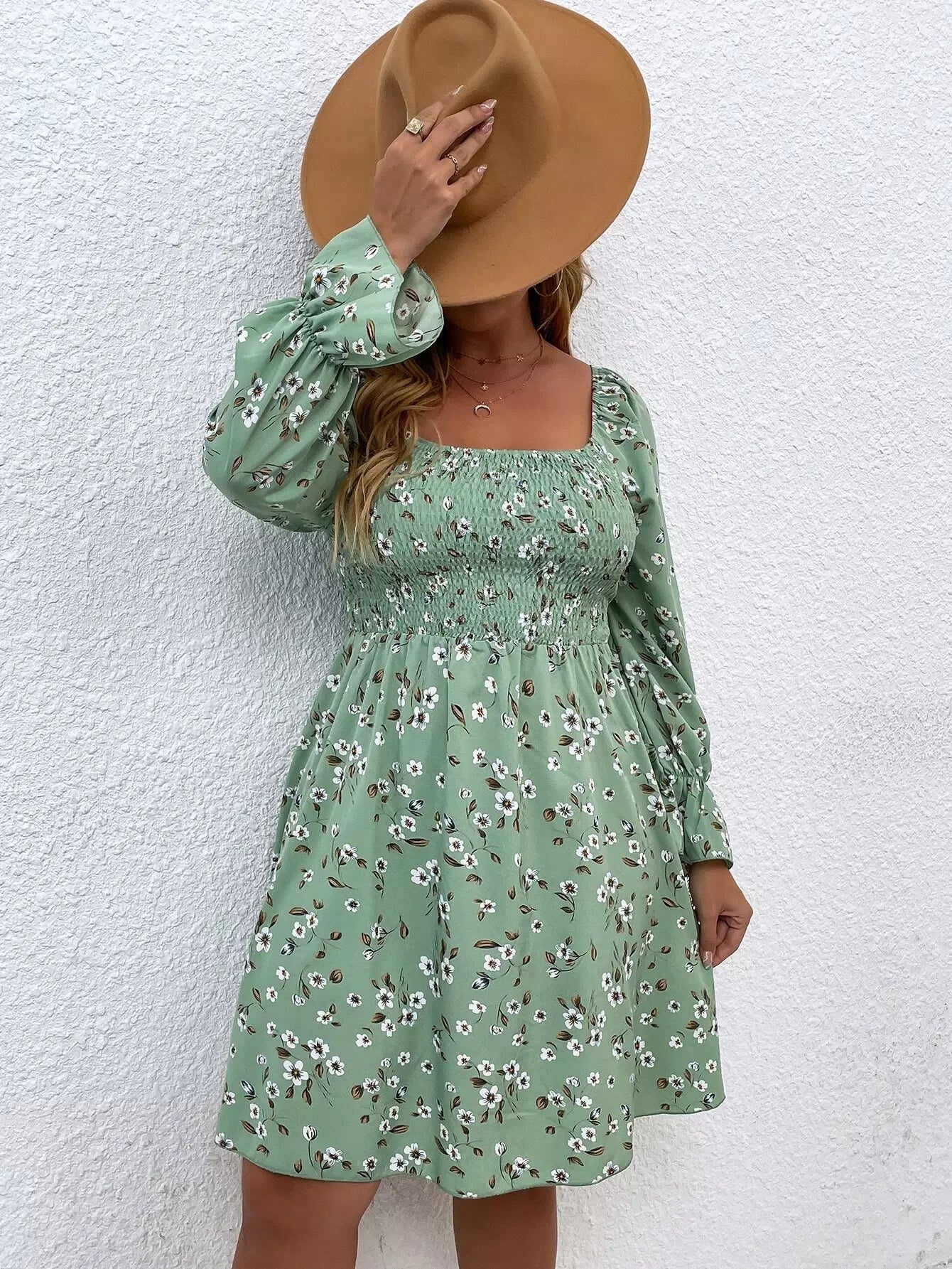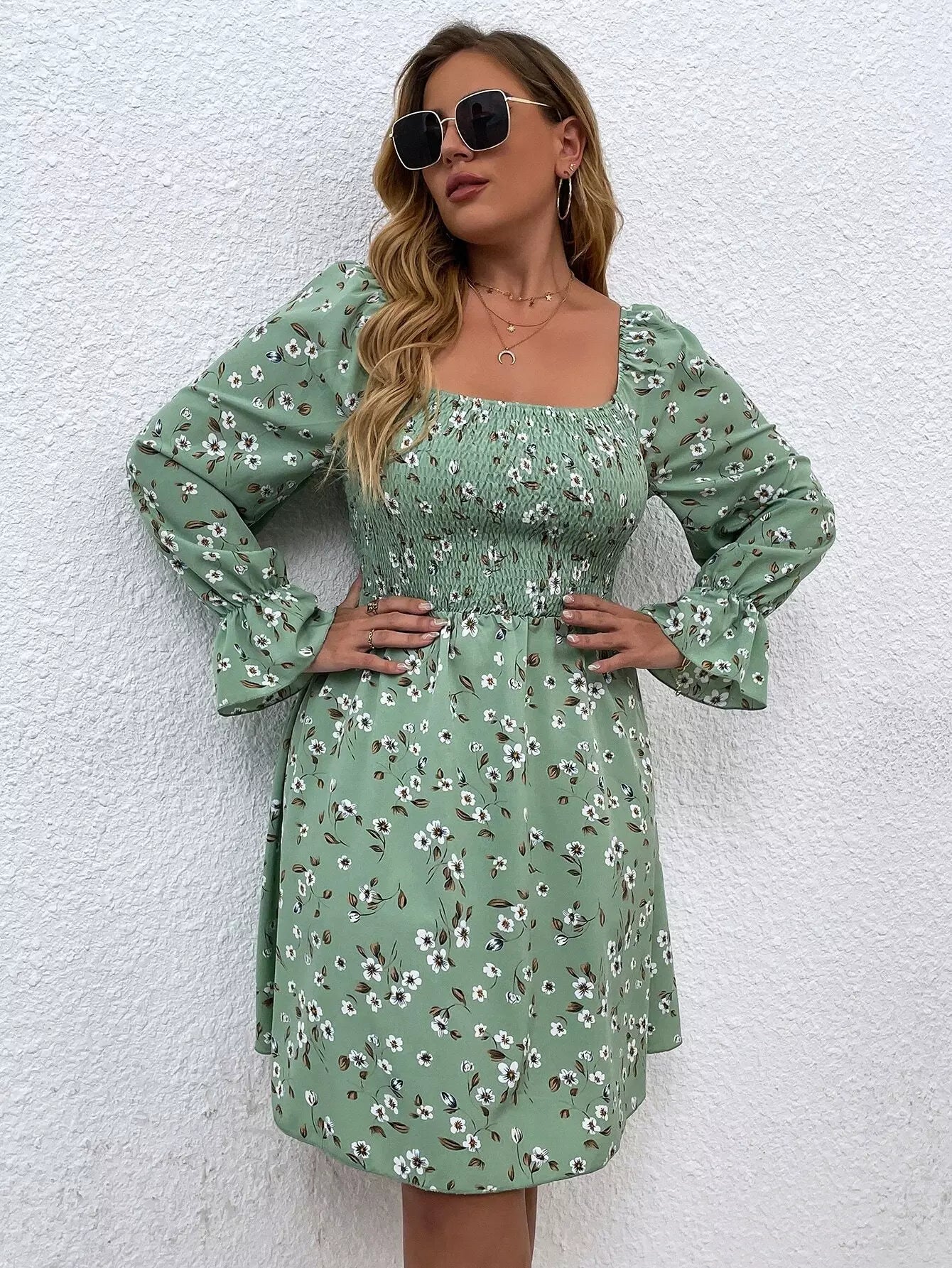فستان بياقة مربعة برقبة مربعة بطبعة زهور مطبوعة على الصدر زائد