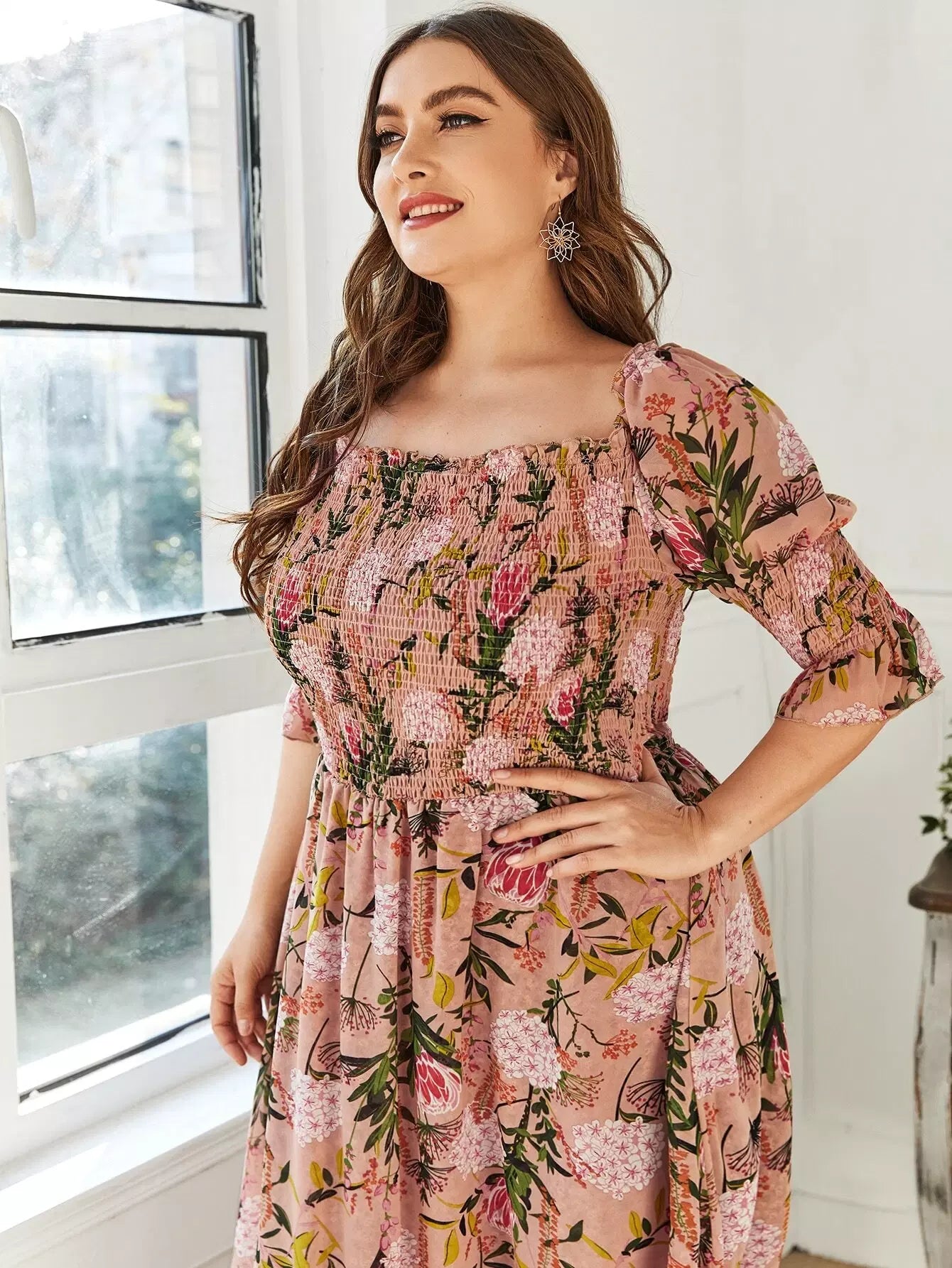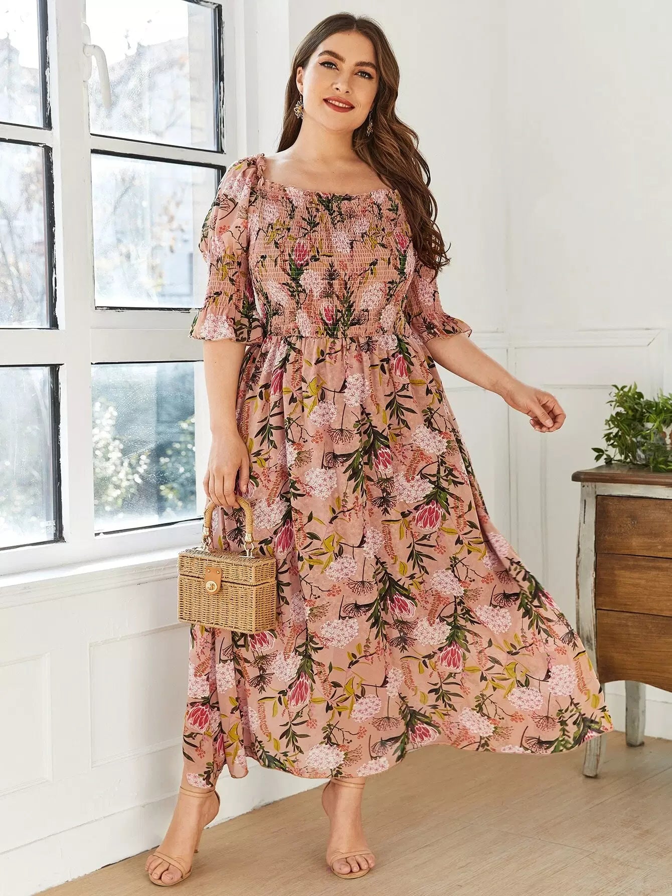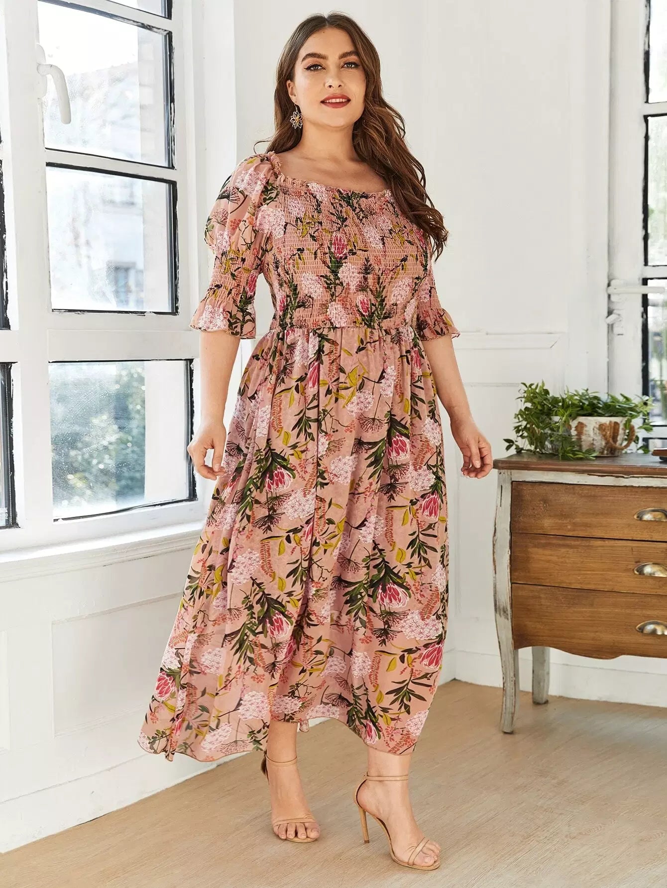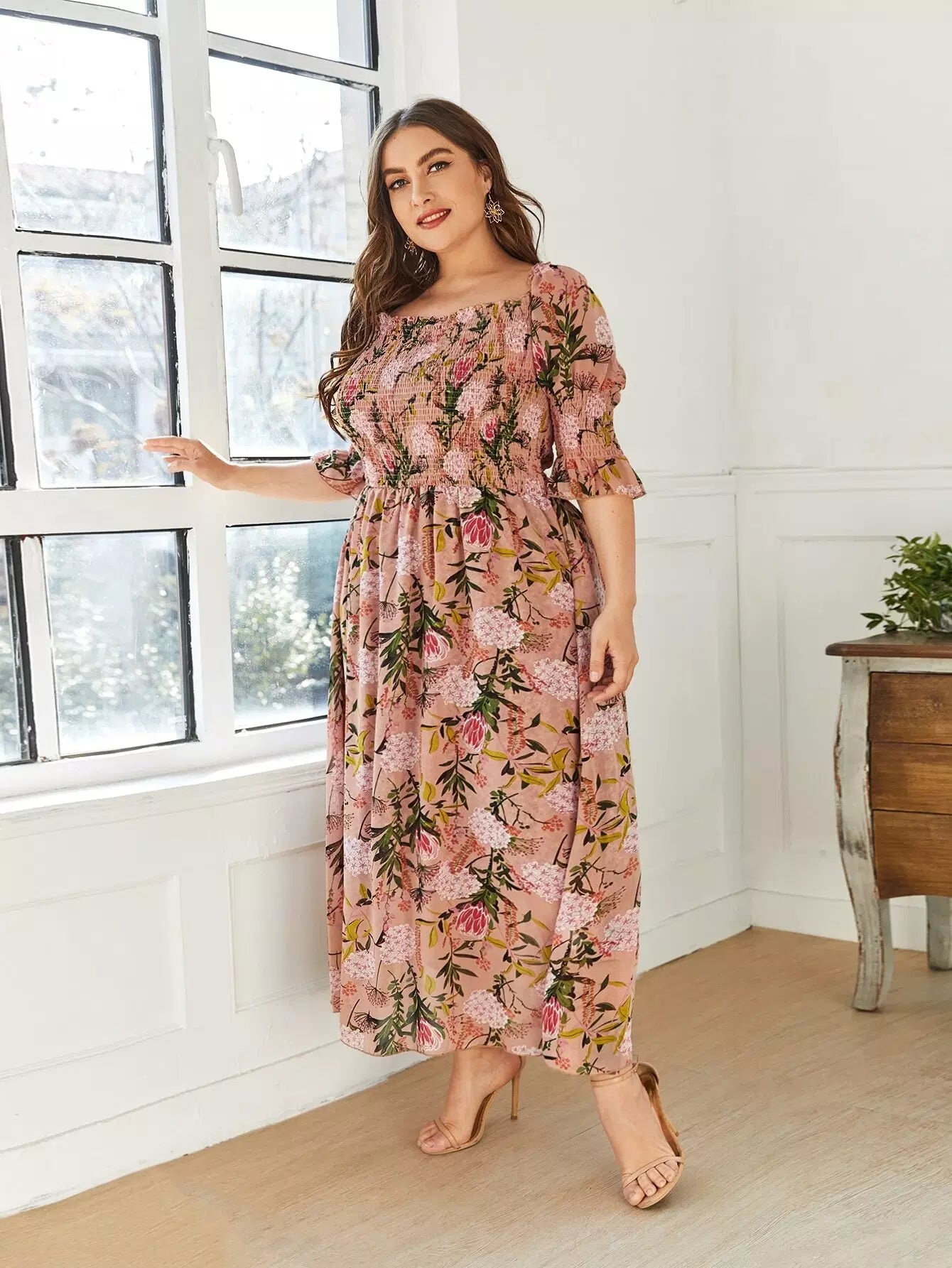 نحيف - مقاس كبير فستان شيفون مزين بطبعات زهور وياقة مربعة