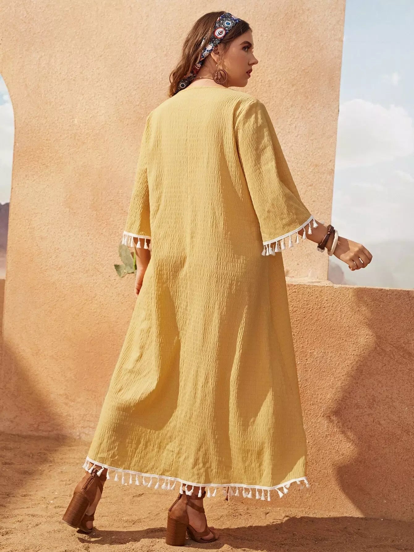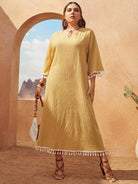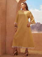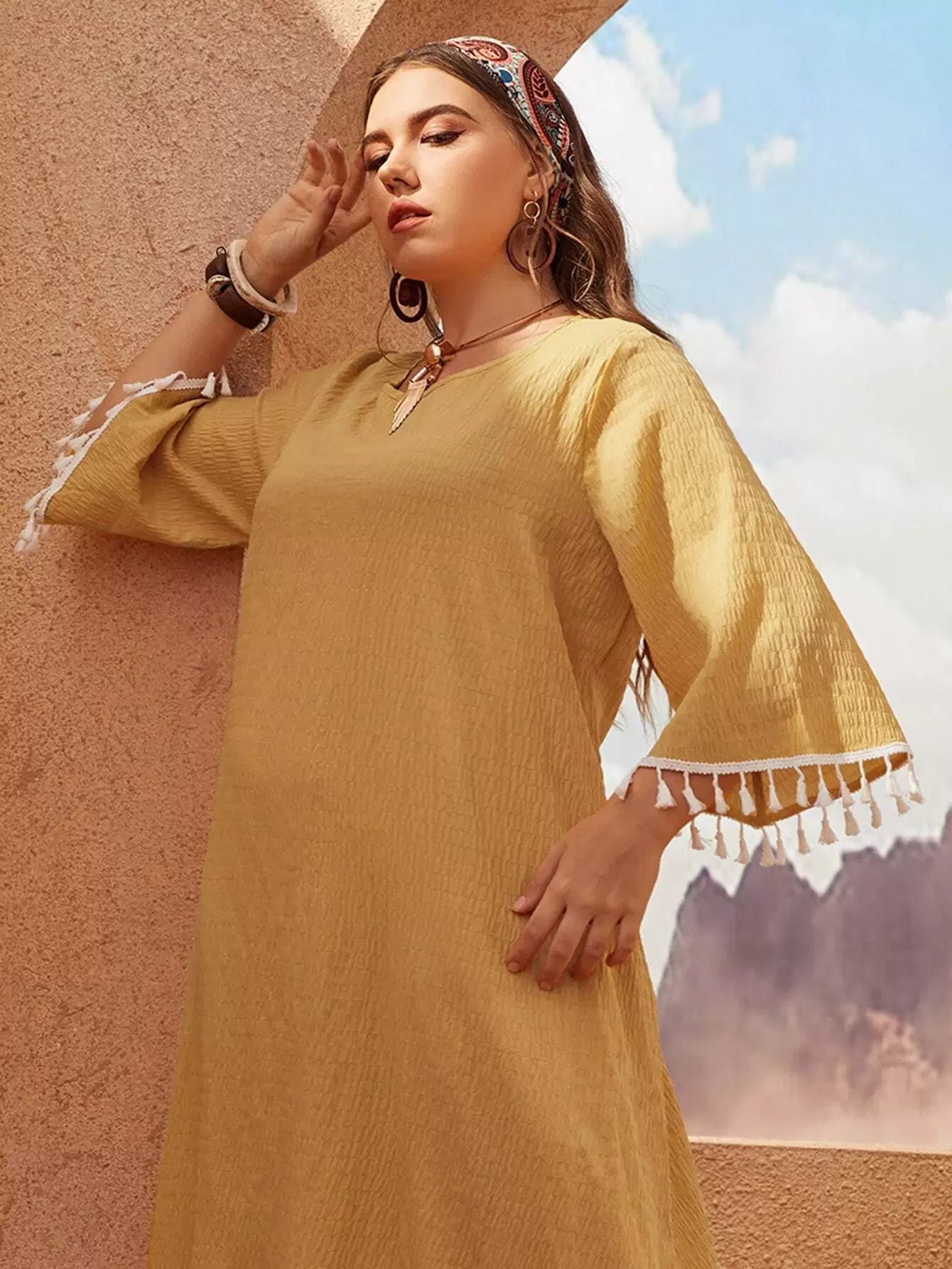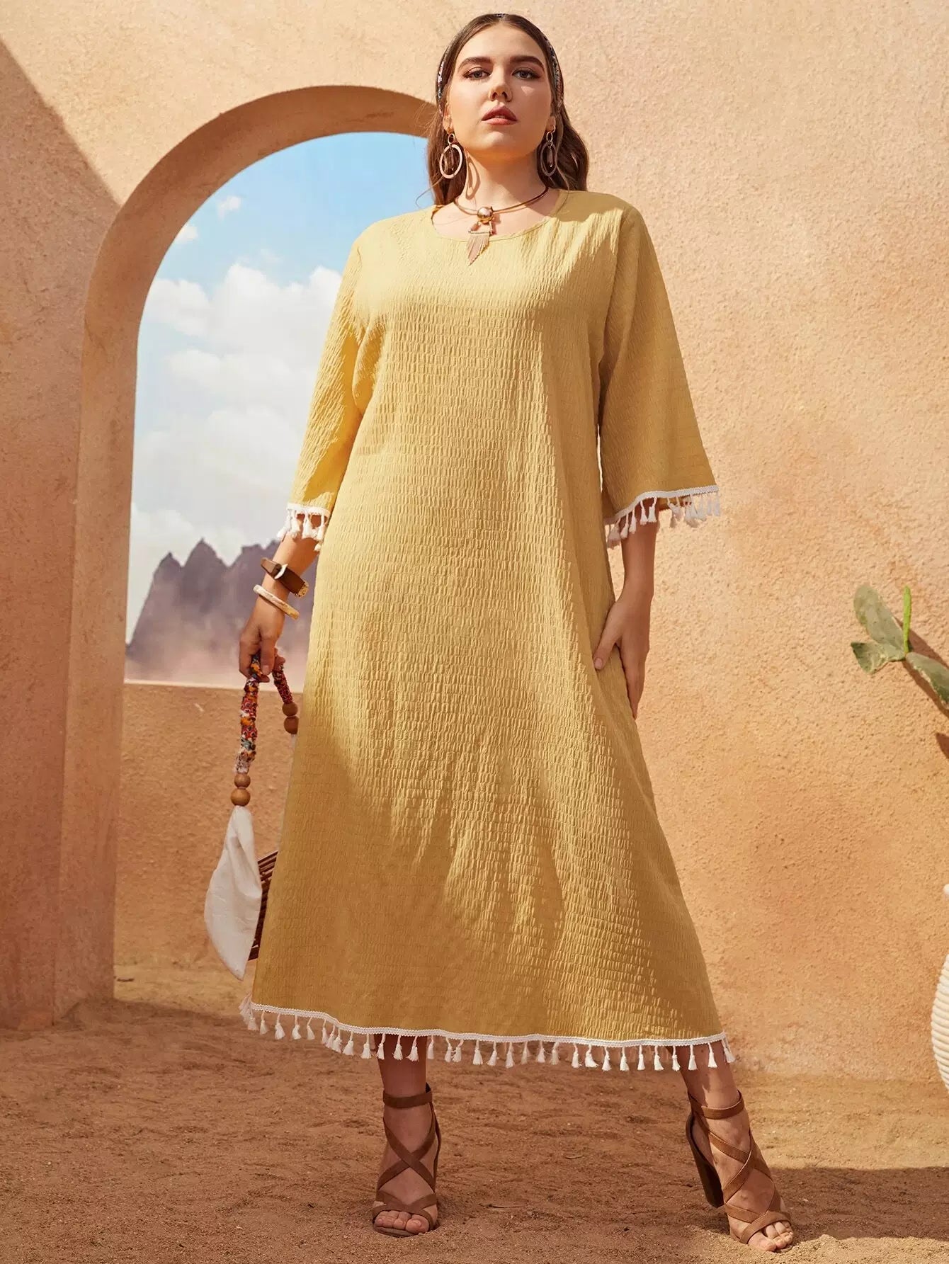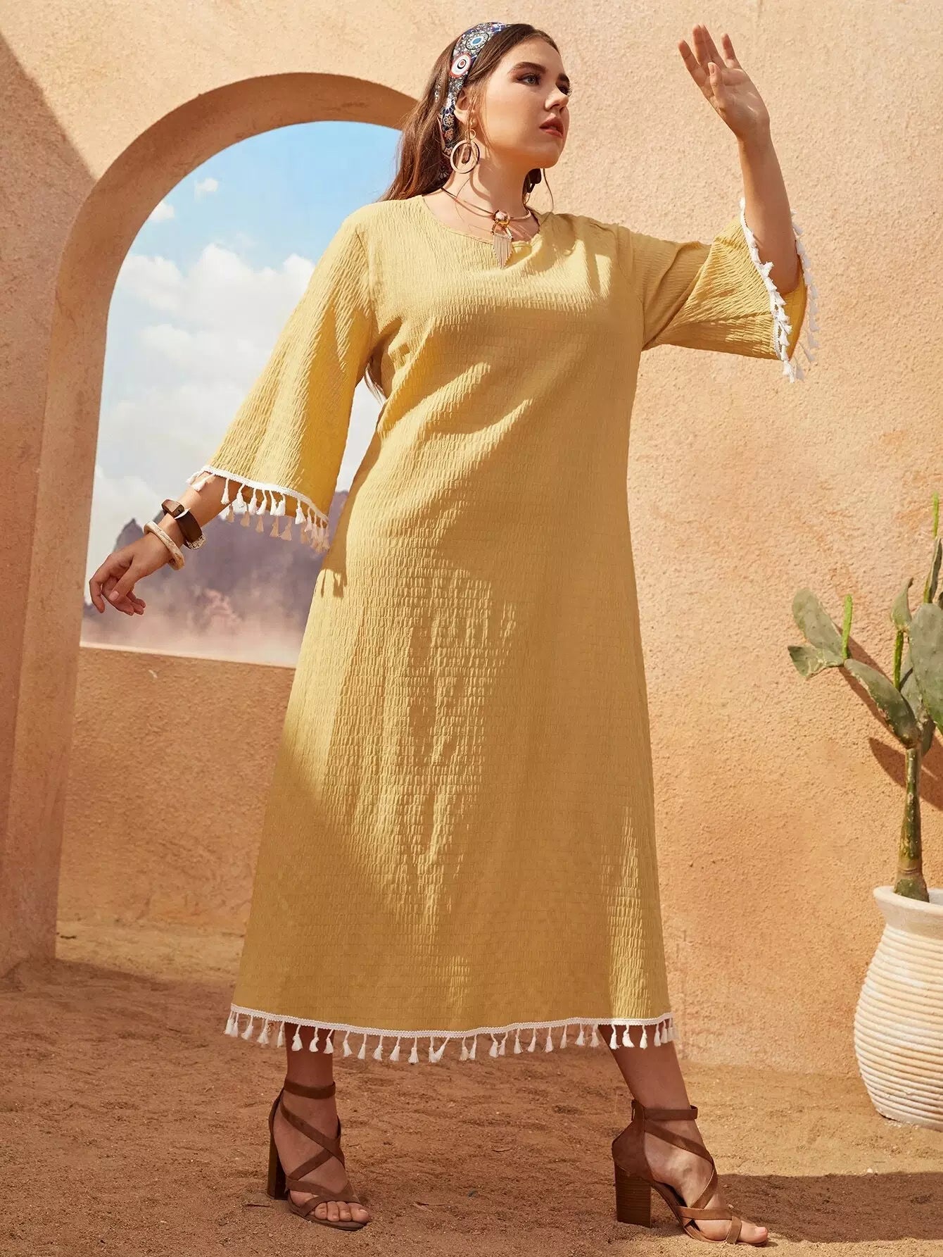فستان بدون أهداب بياقة مستديرة برقبة دائرية مزين بشراشيب زائد