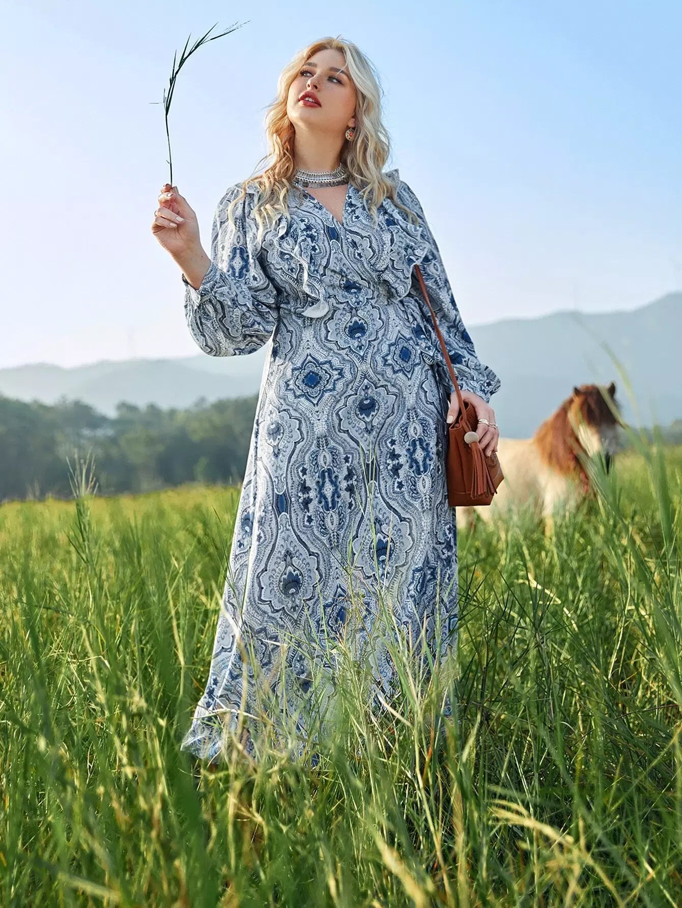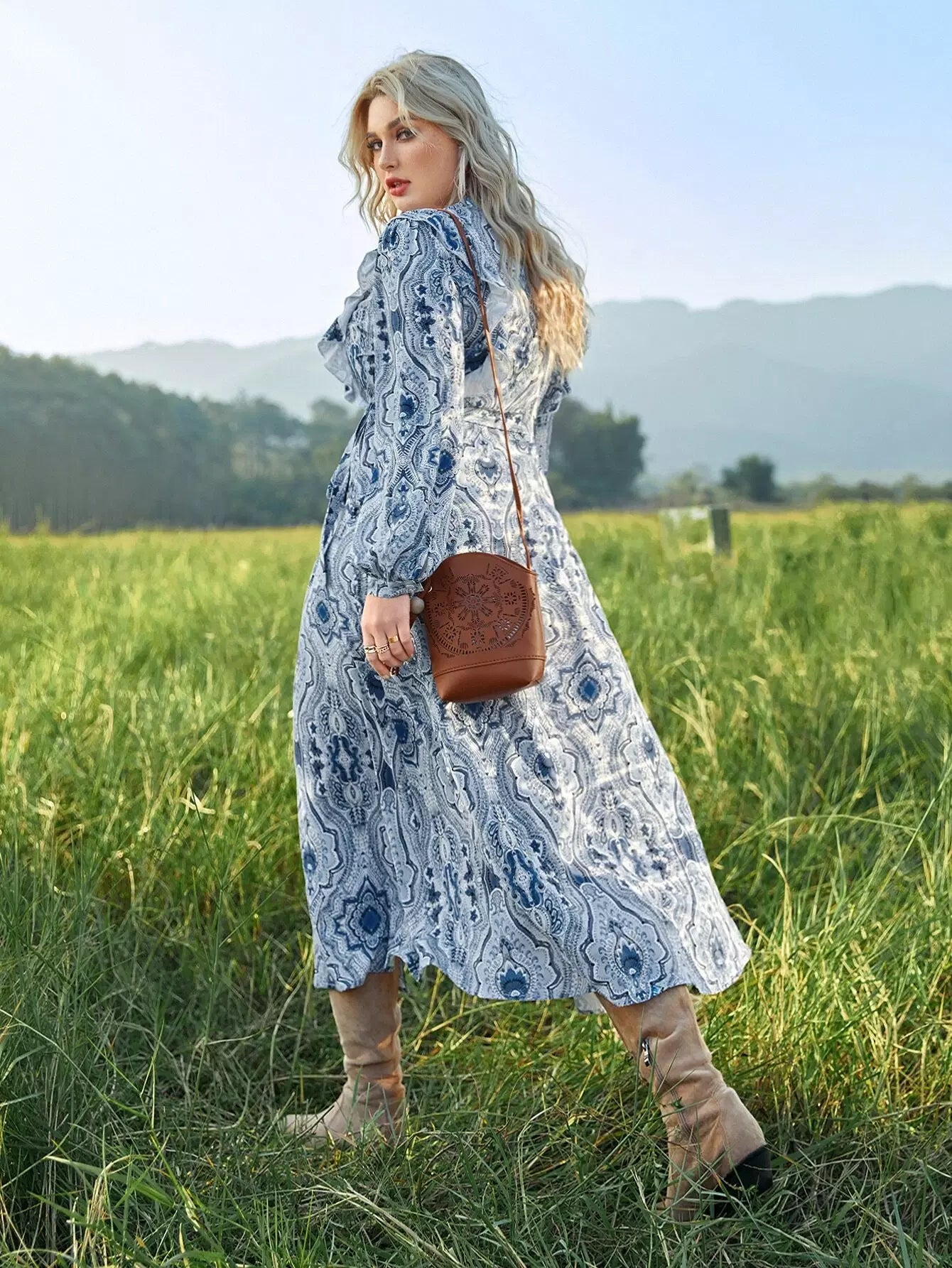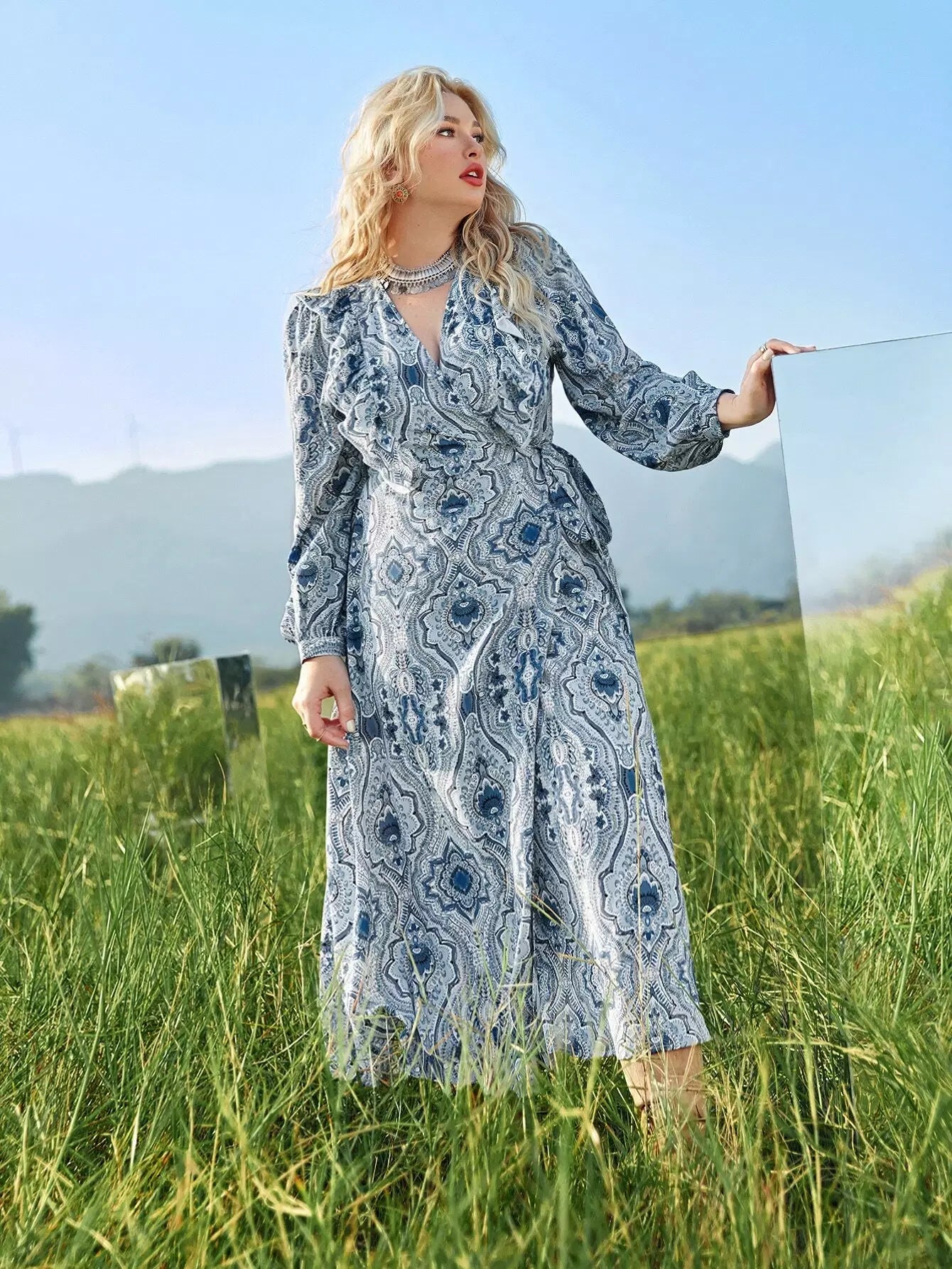 بالإضافة إلى فستان ملفوف بياقة واسعة وأكمام واسعة بدون حزام