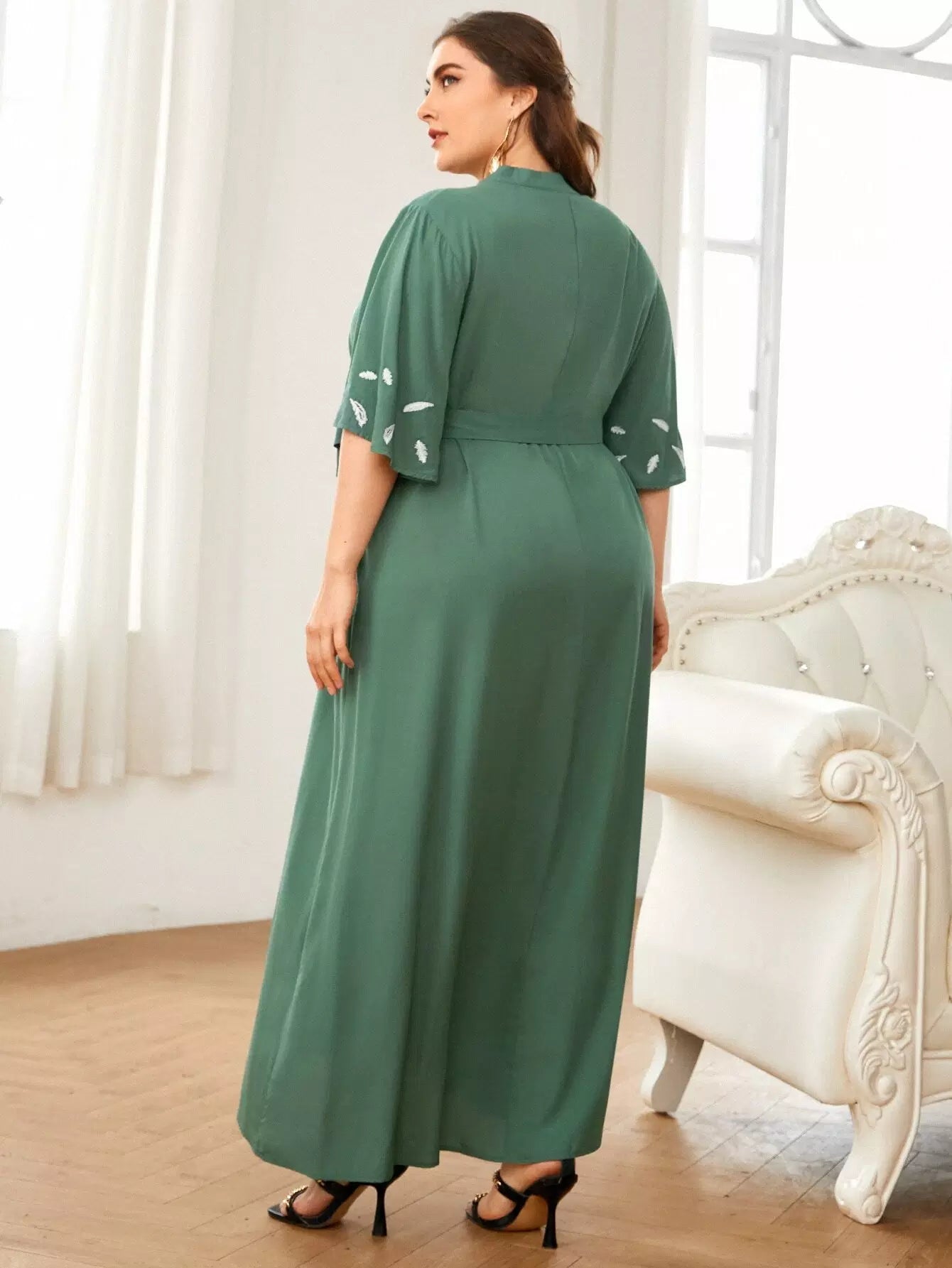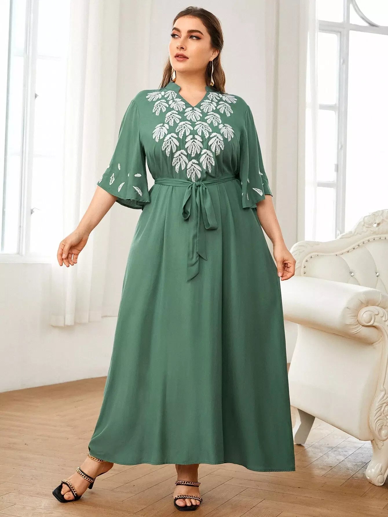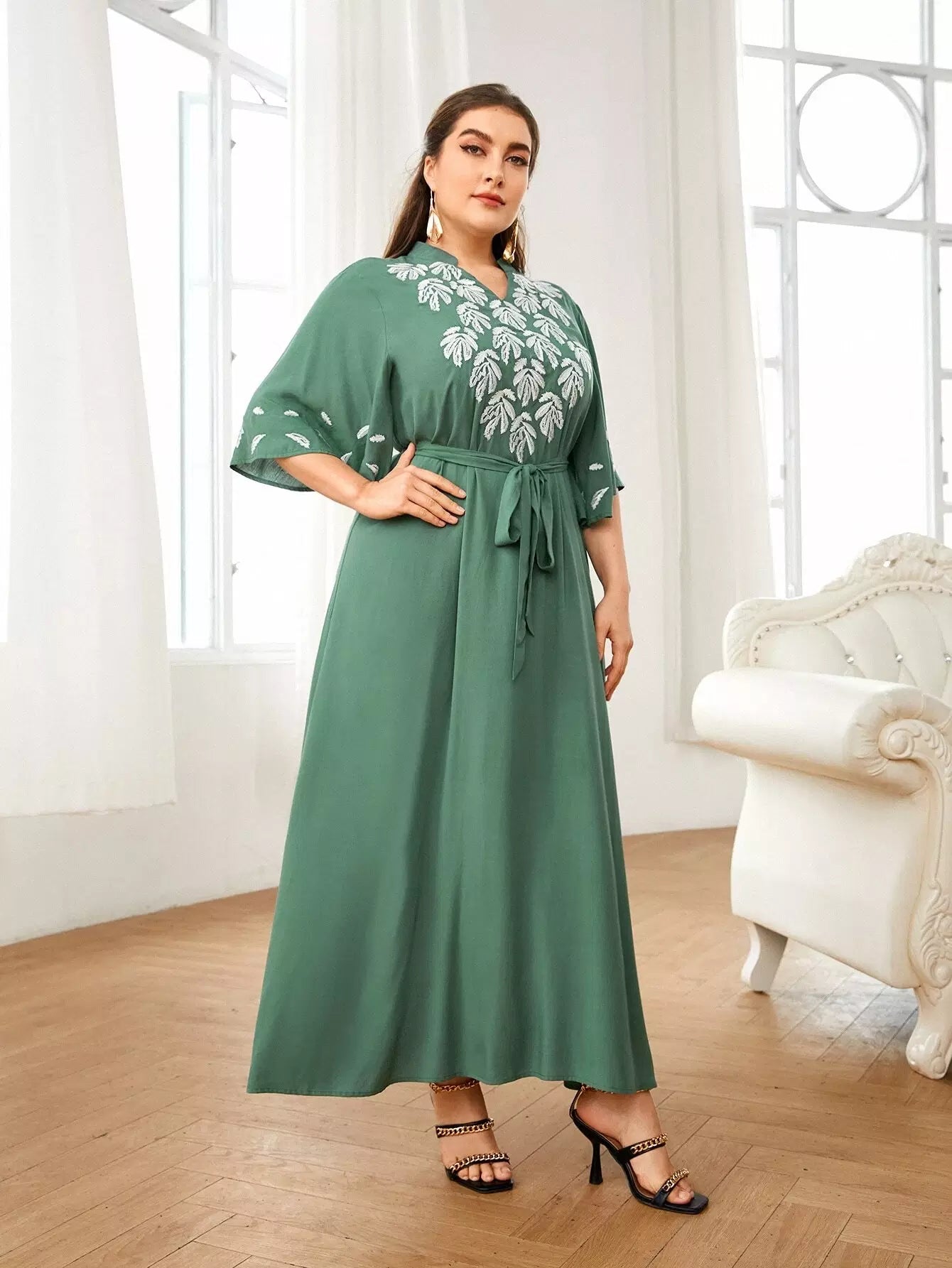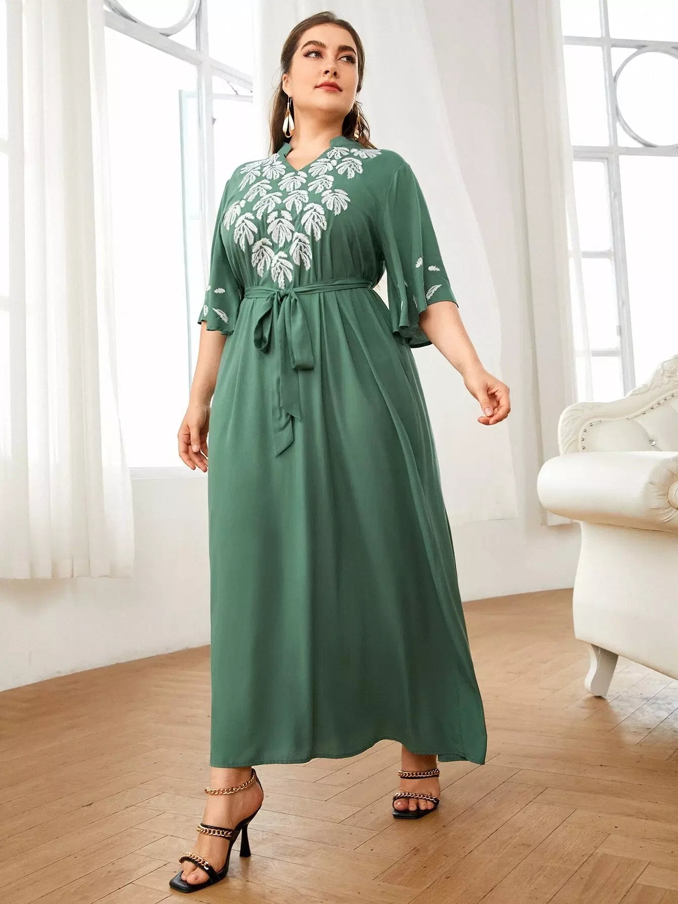بالإضافة إلى فستان مطرز بأوراق الشجر بدون حزام