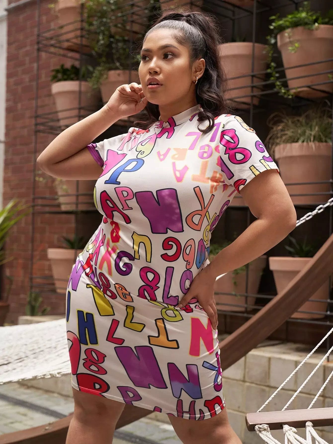 نحيف - مقاس كبير فستان بطبعة حروف وياقة وهمية