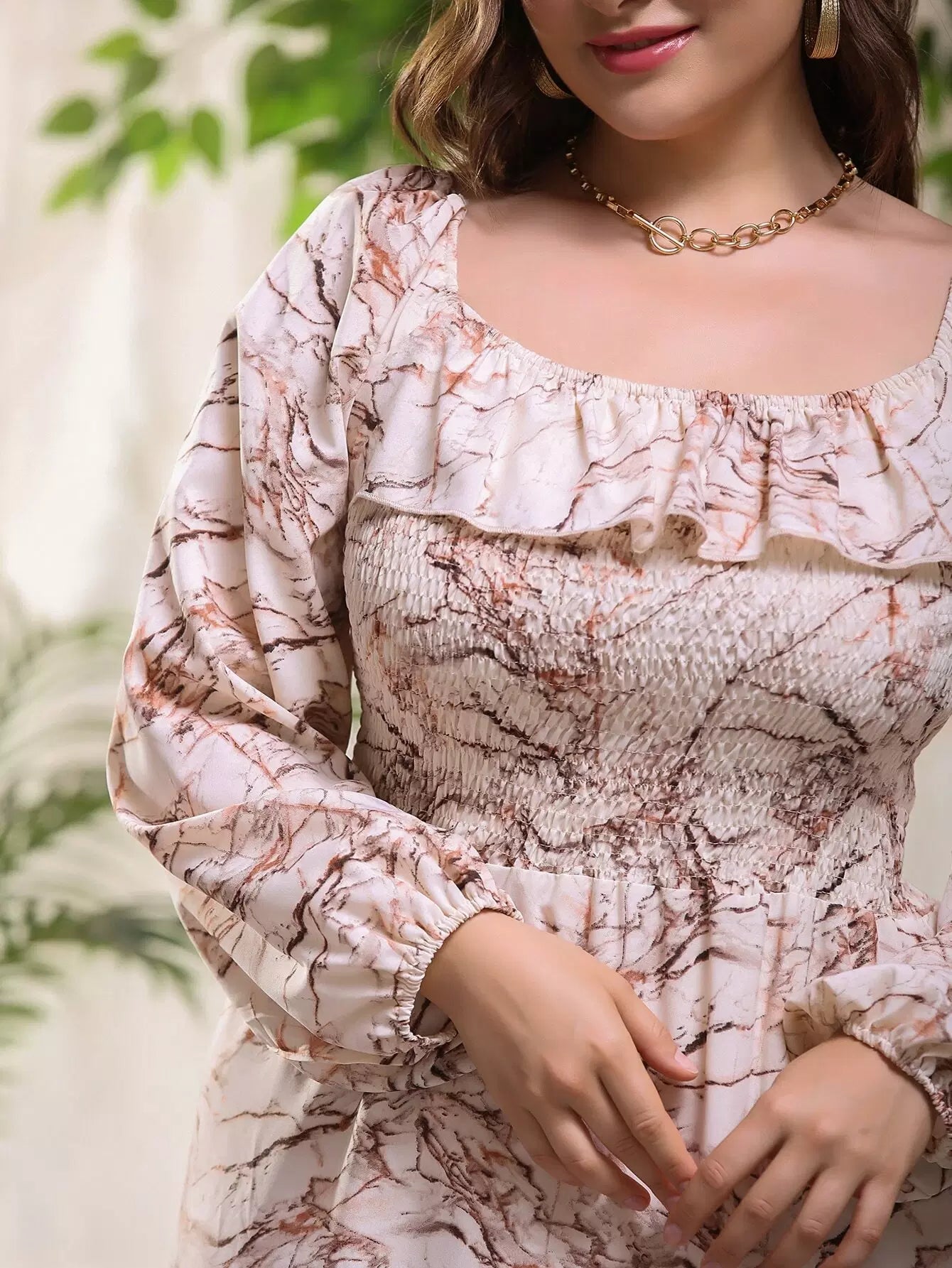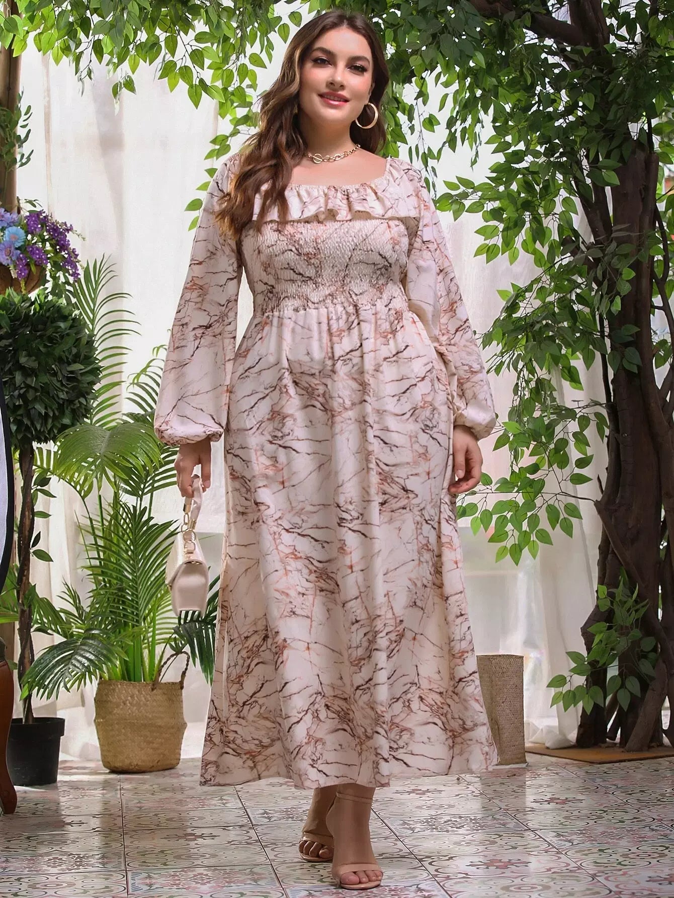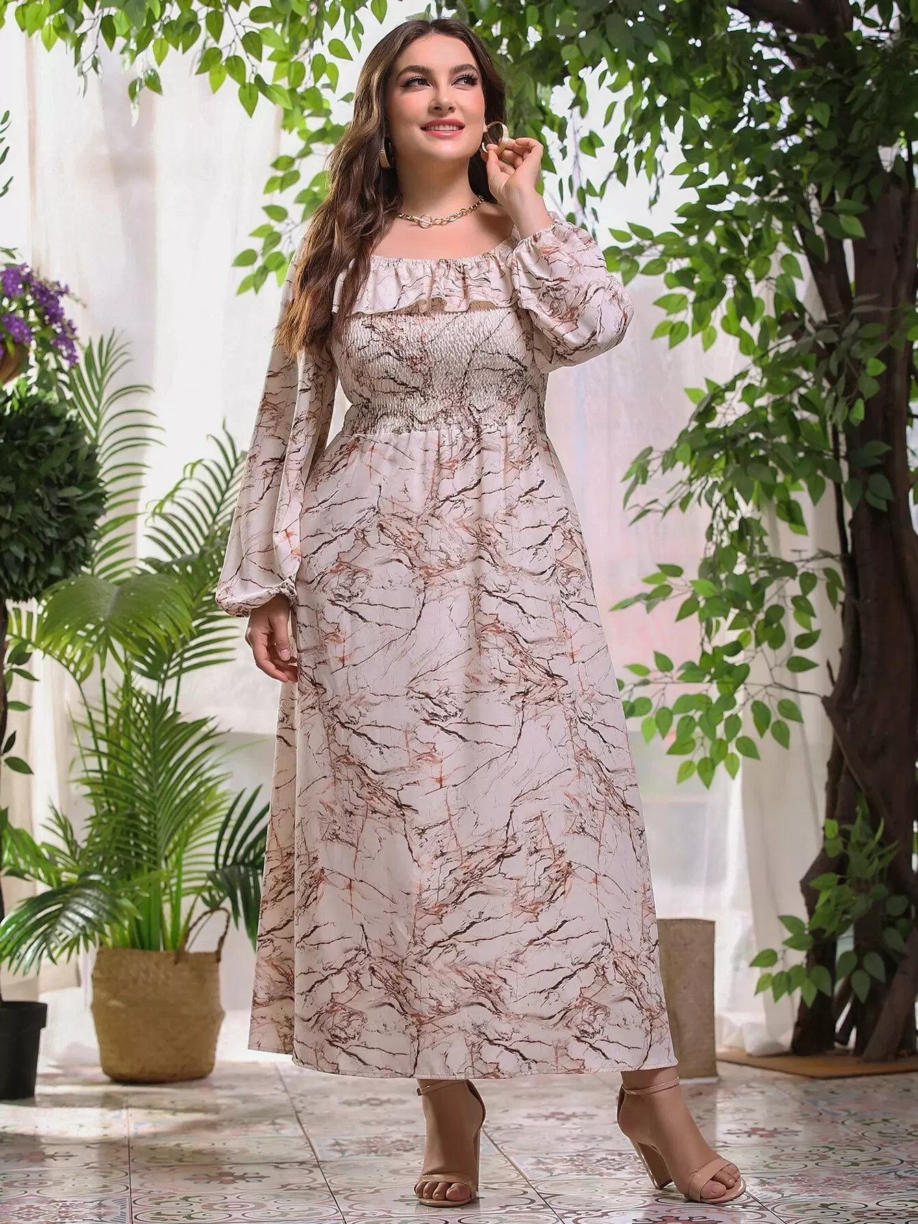 نحيف - مقاس كبير فستان مكشكش بطباعة رخامية
