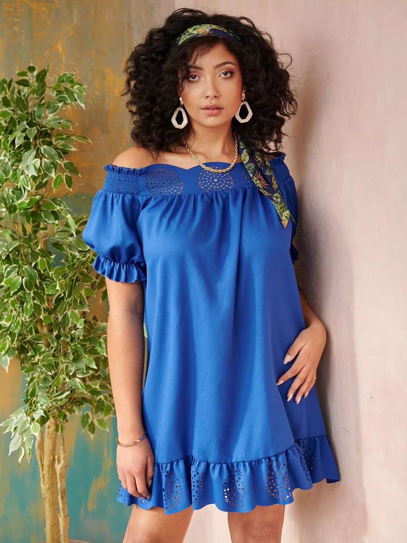 فستان بحواف مكشكشة مكشكشة من دون أكتاف زائد