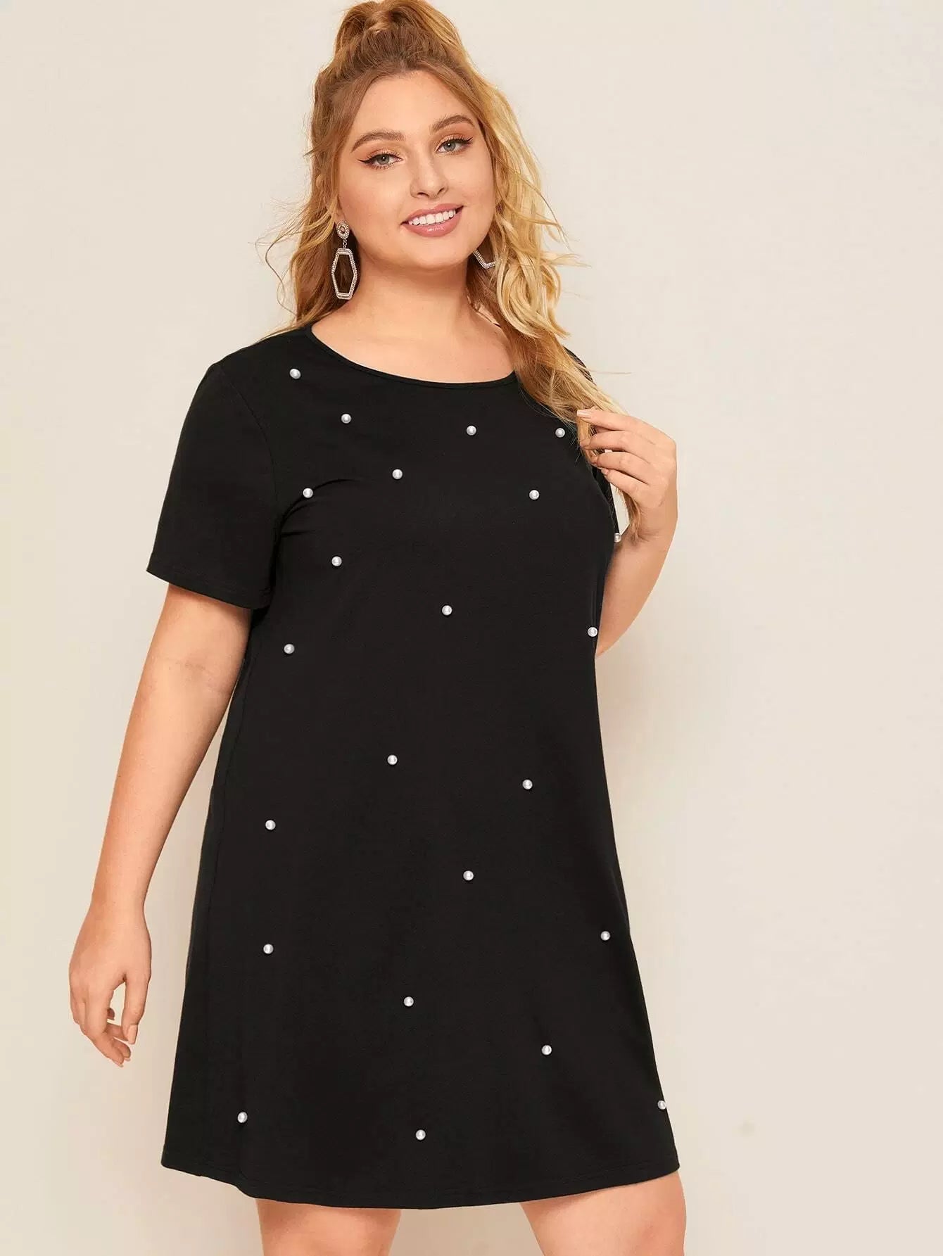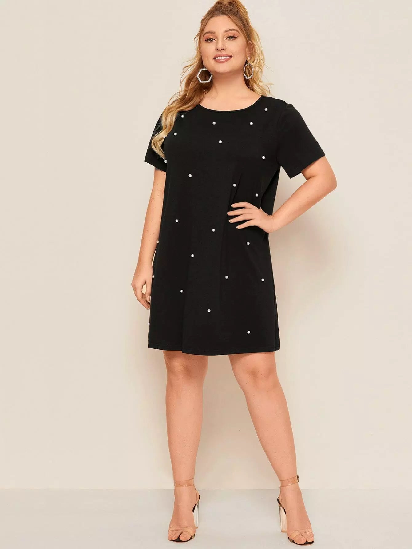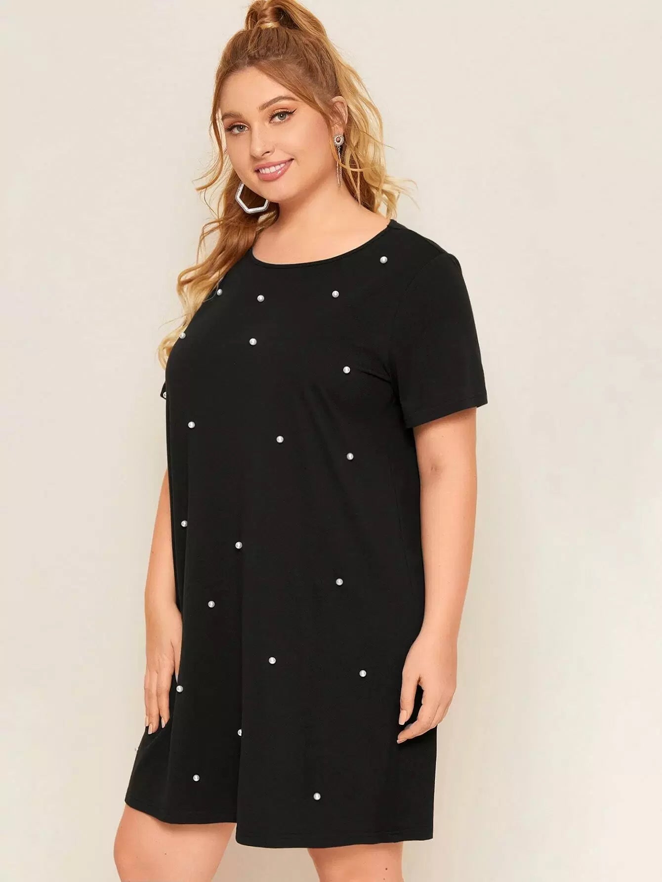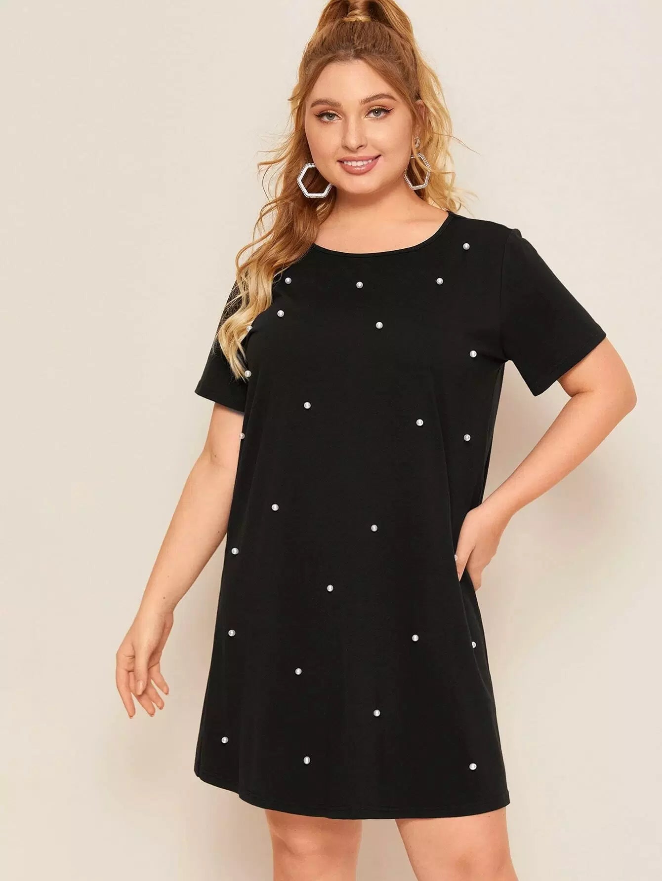 فستان قصير مطرز بالخرز واللؤلؤ زائد