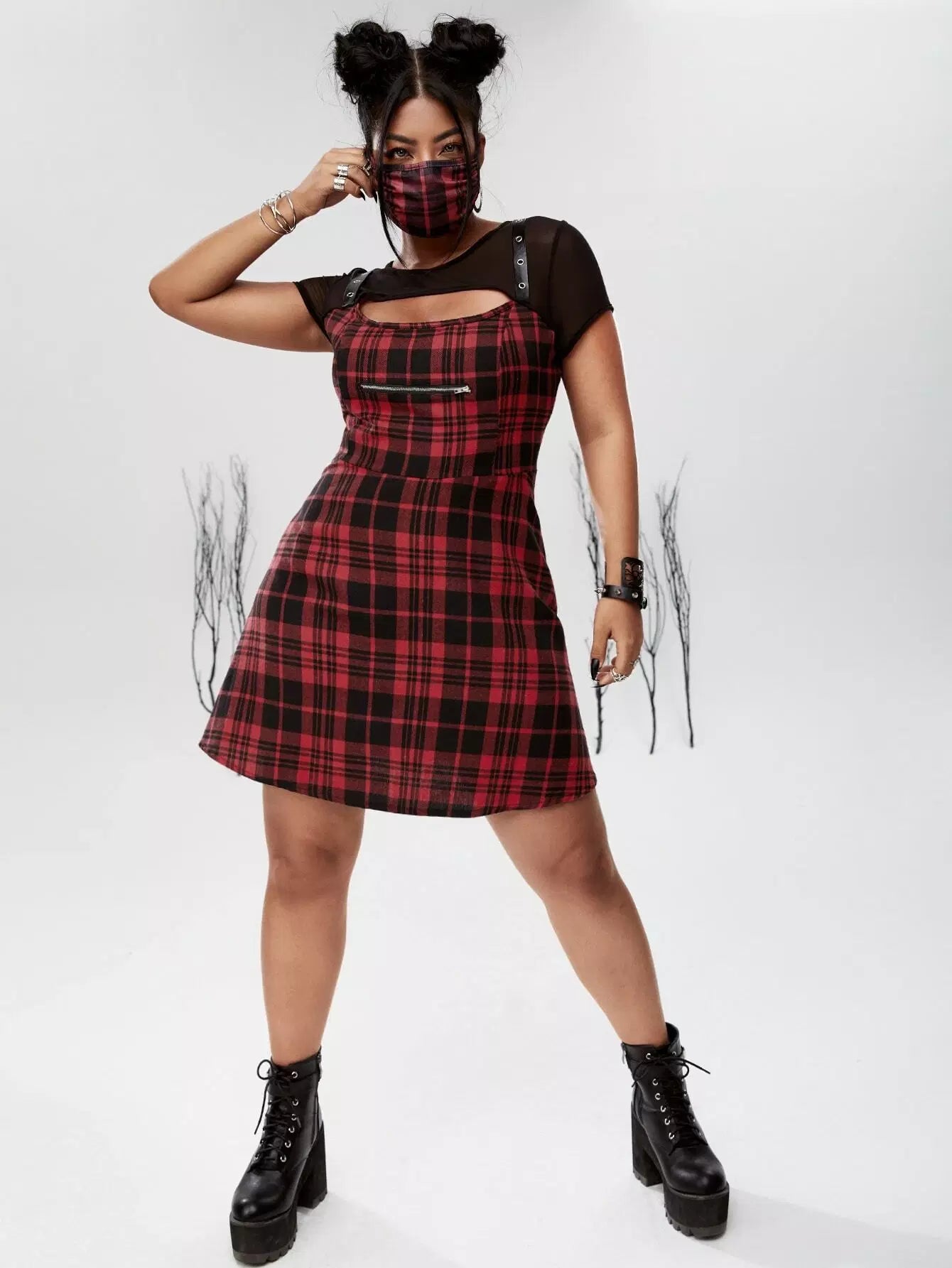 فستان منقوش منقوش بلون مغاير بلون مغاير مع قناع