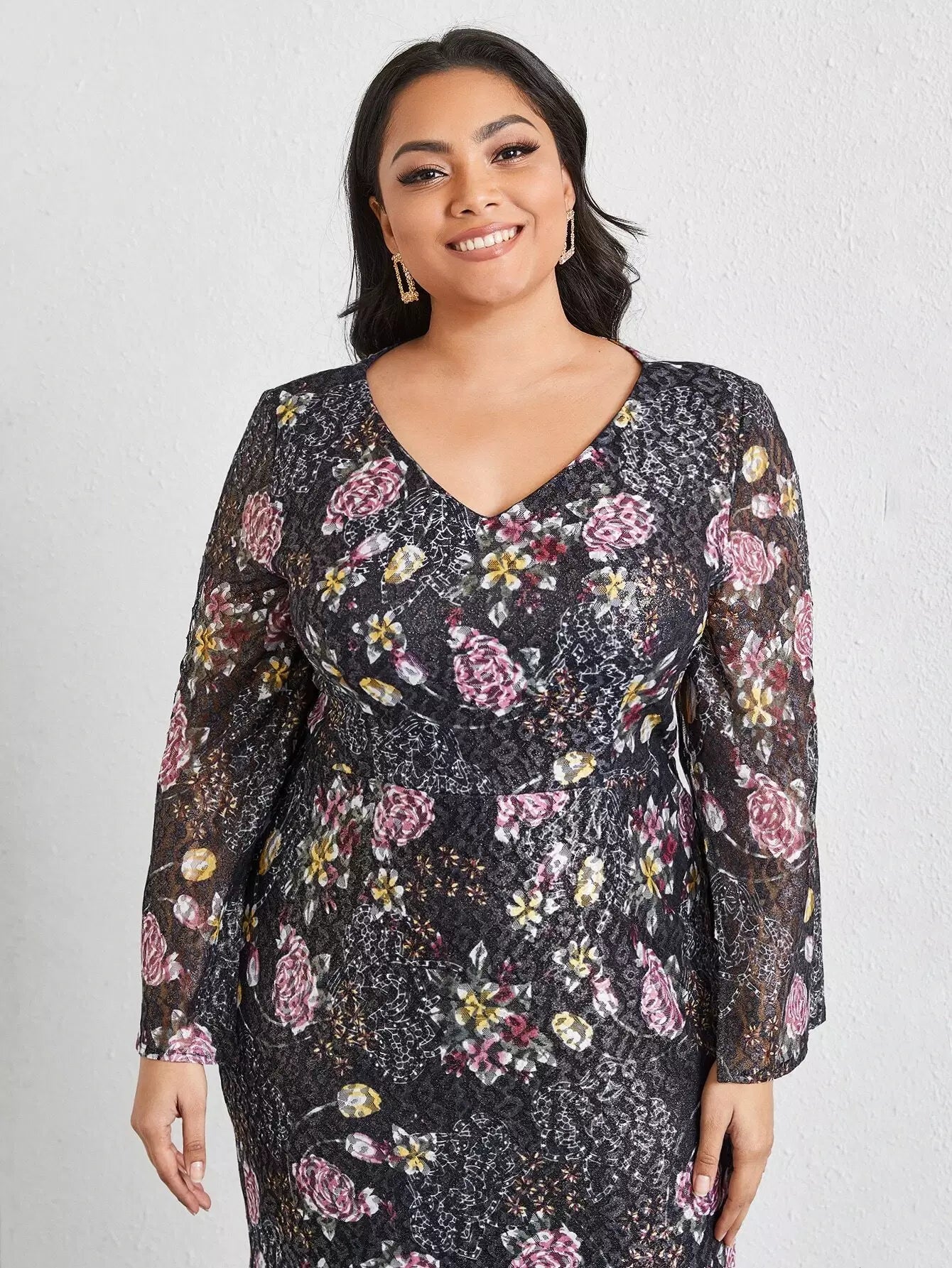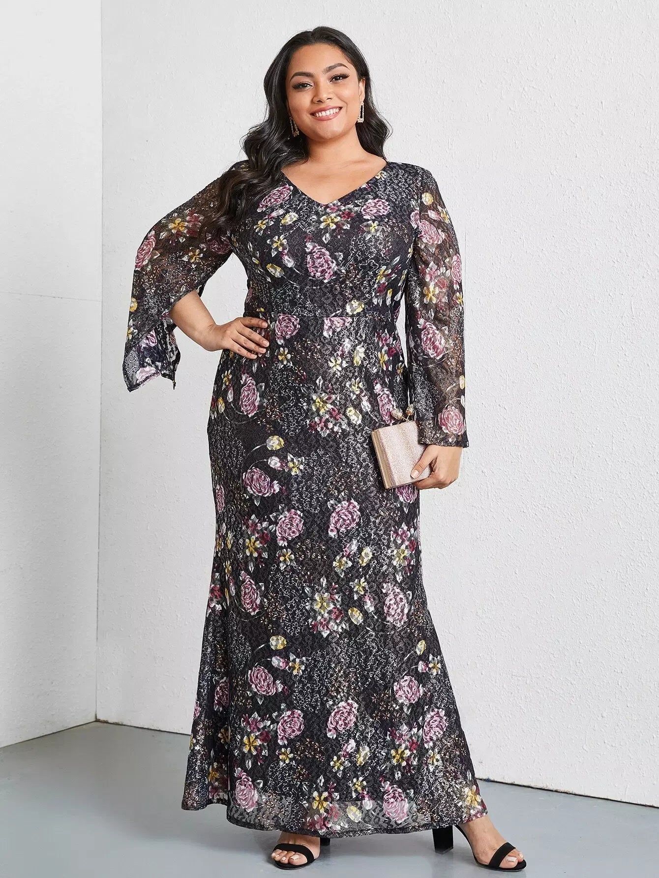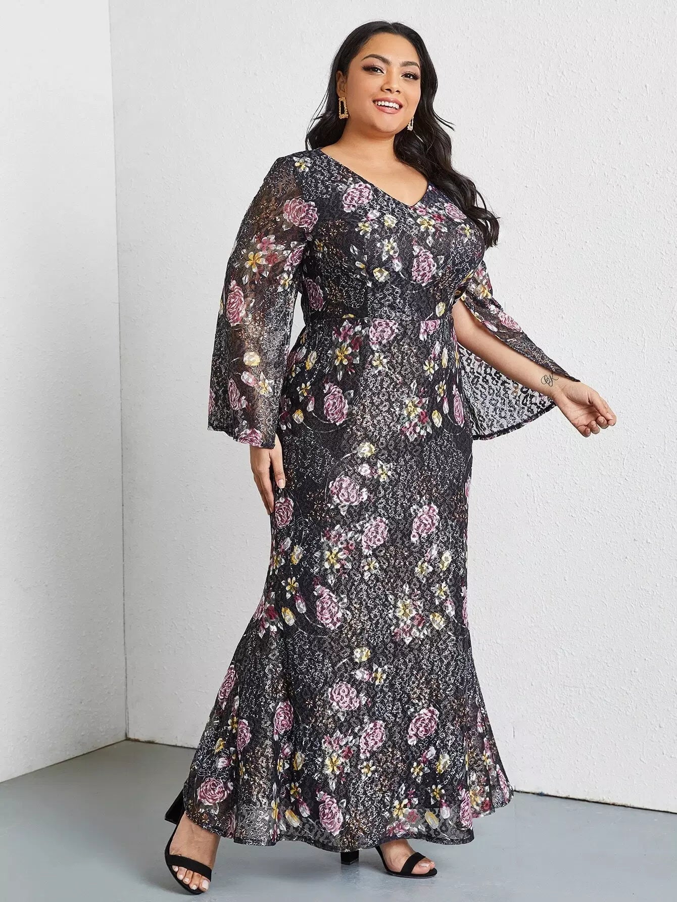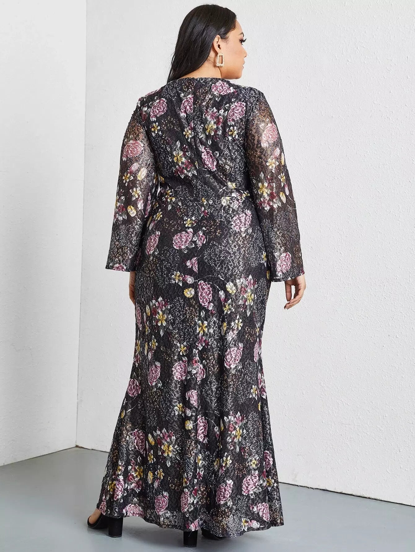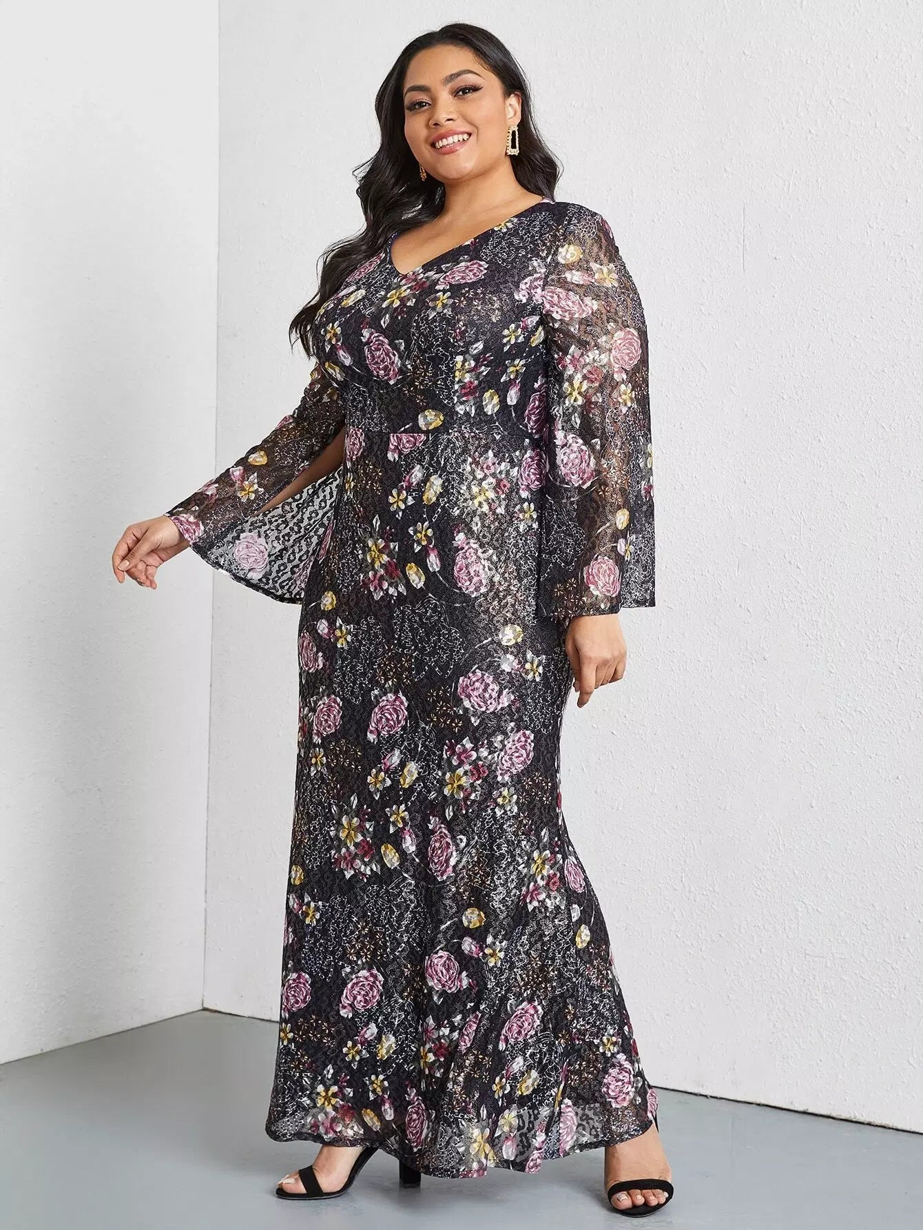 فستان بأكمام منقسمة الأكمام منقوشة بالكامل