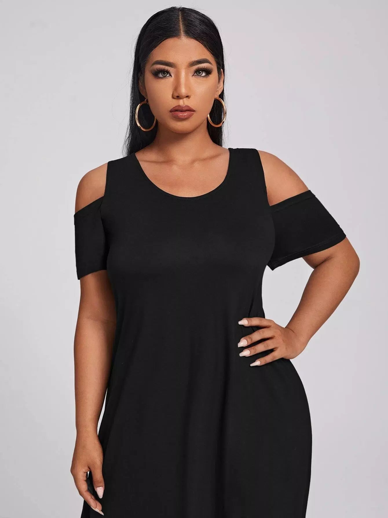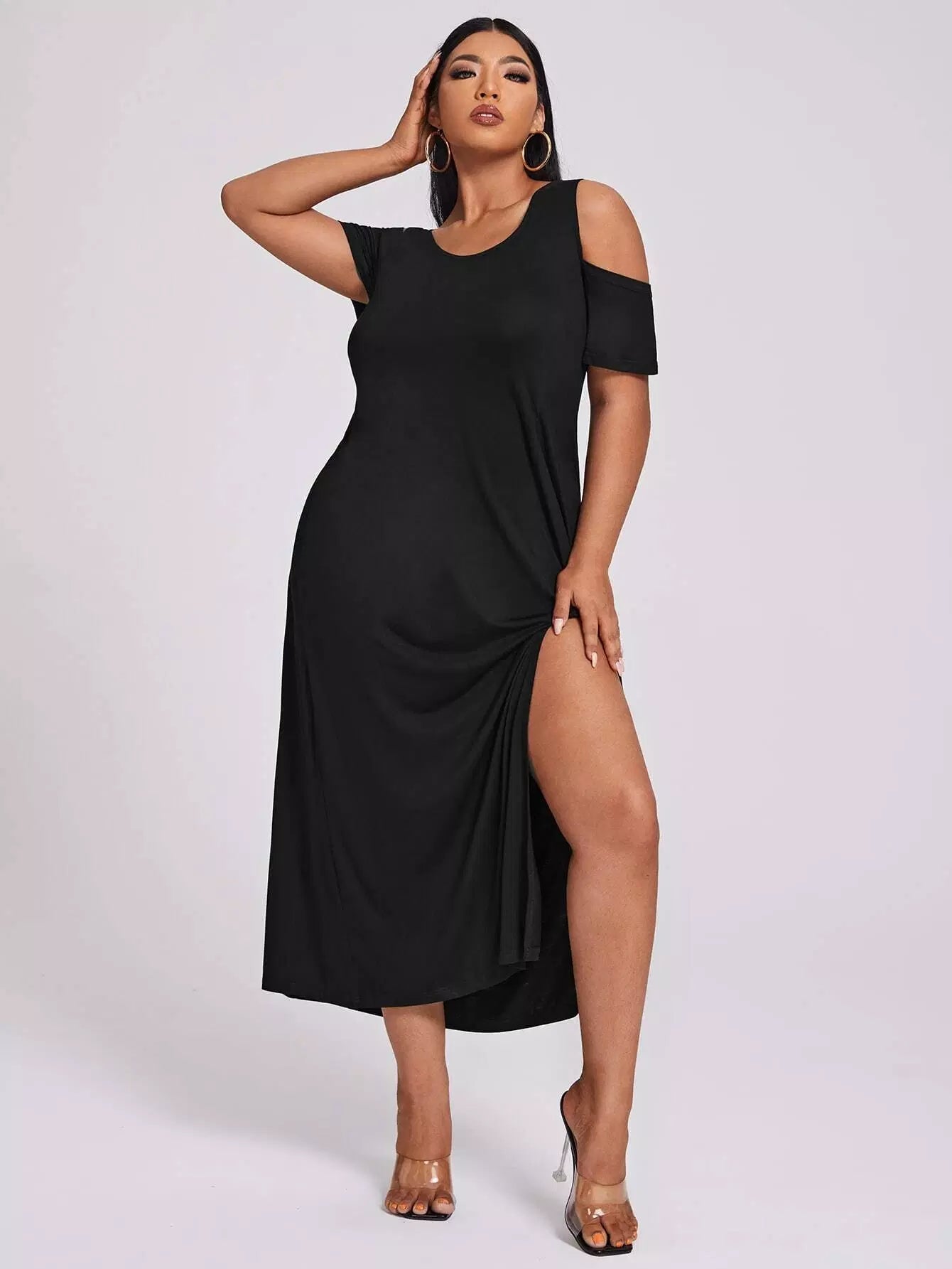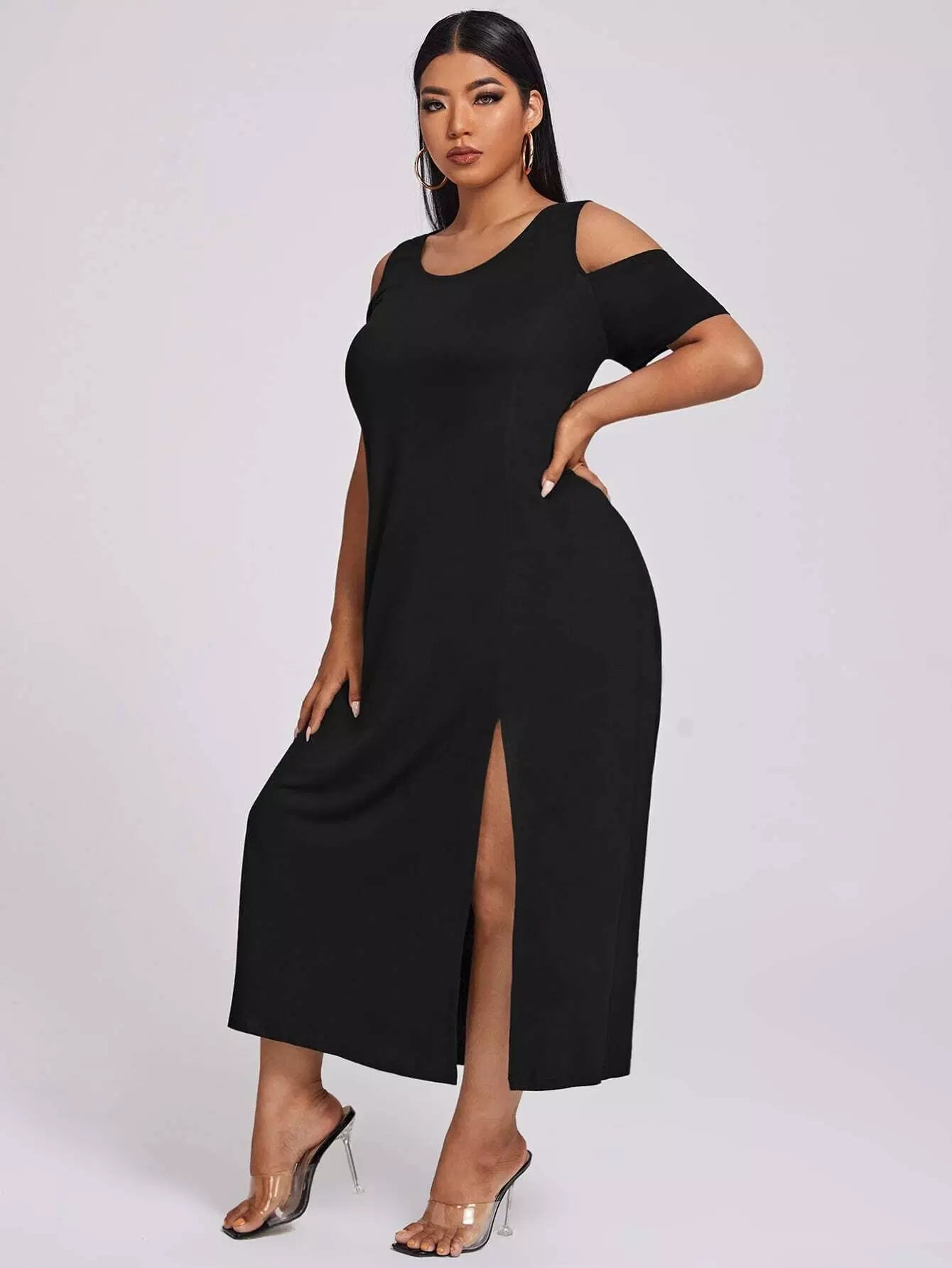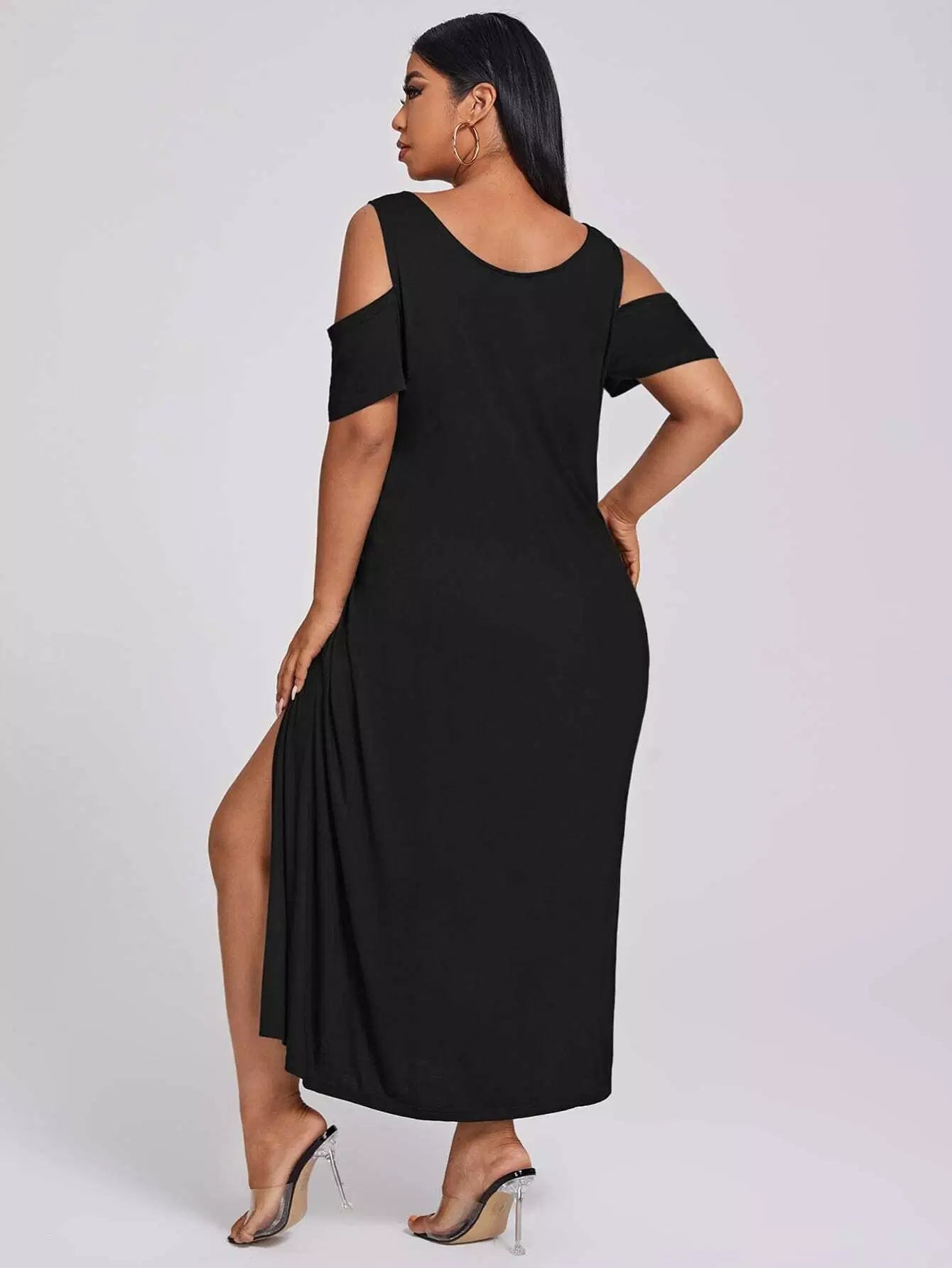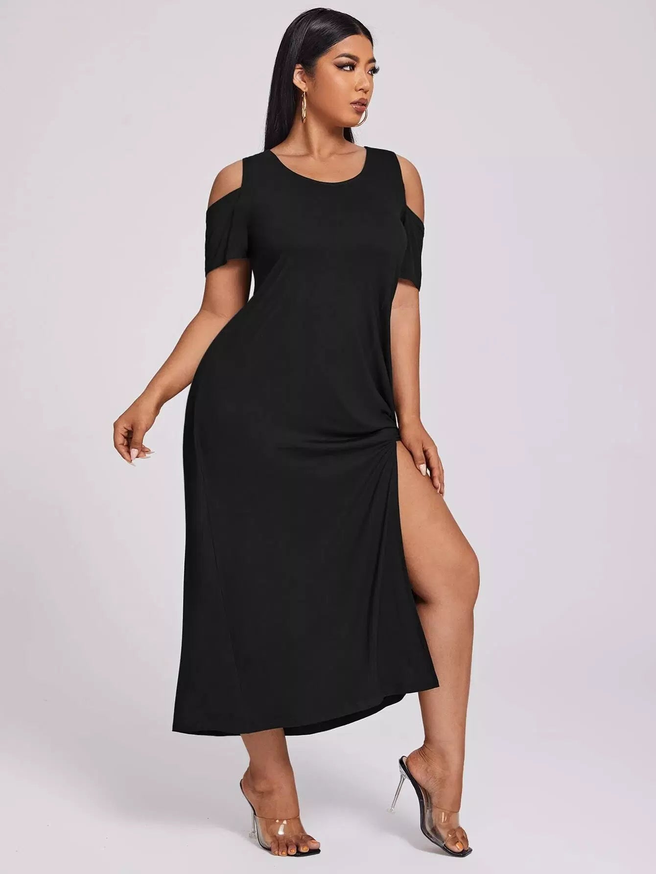 فستان ذو أكتاف باردة منسدل على الفخذين منقسمة على الكتفين