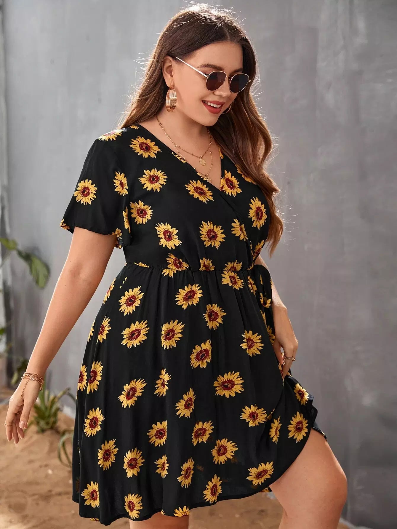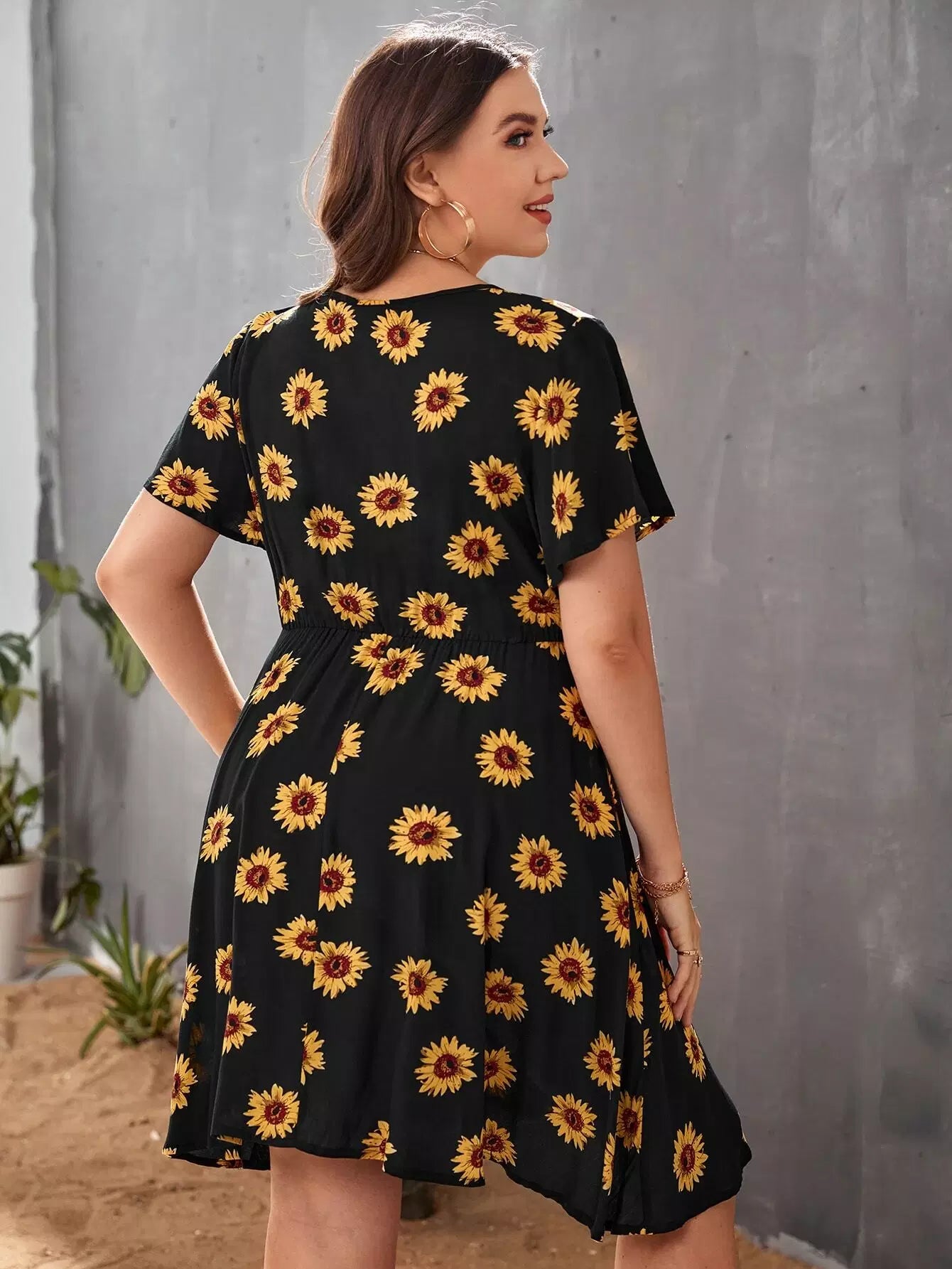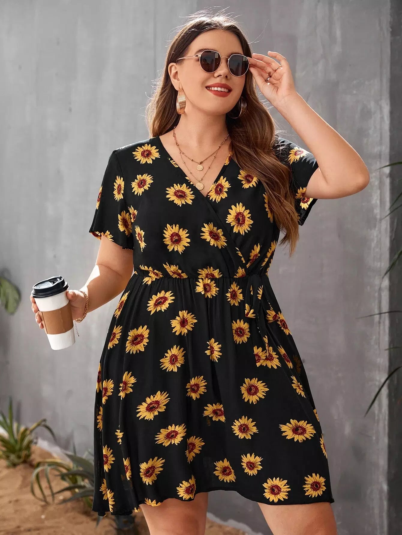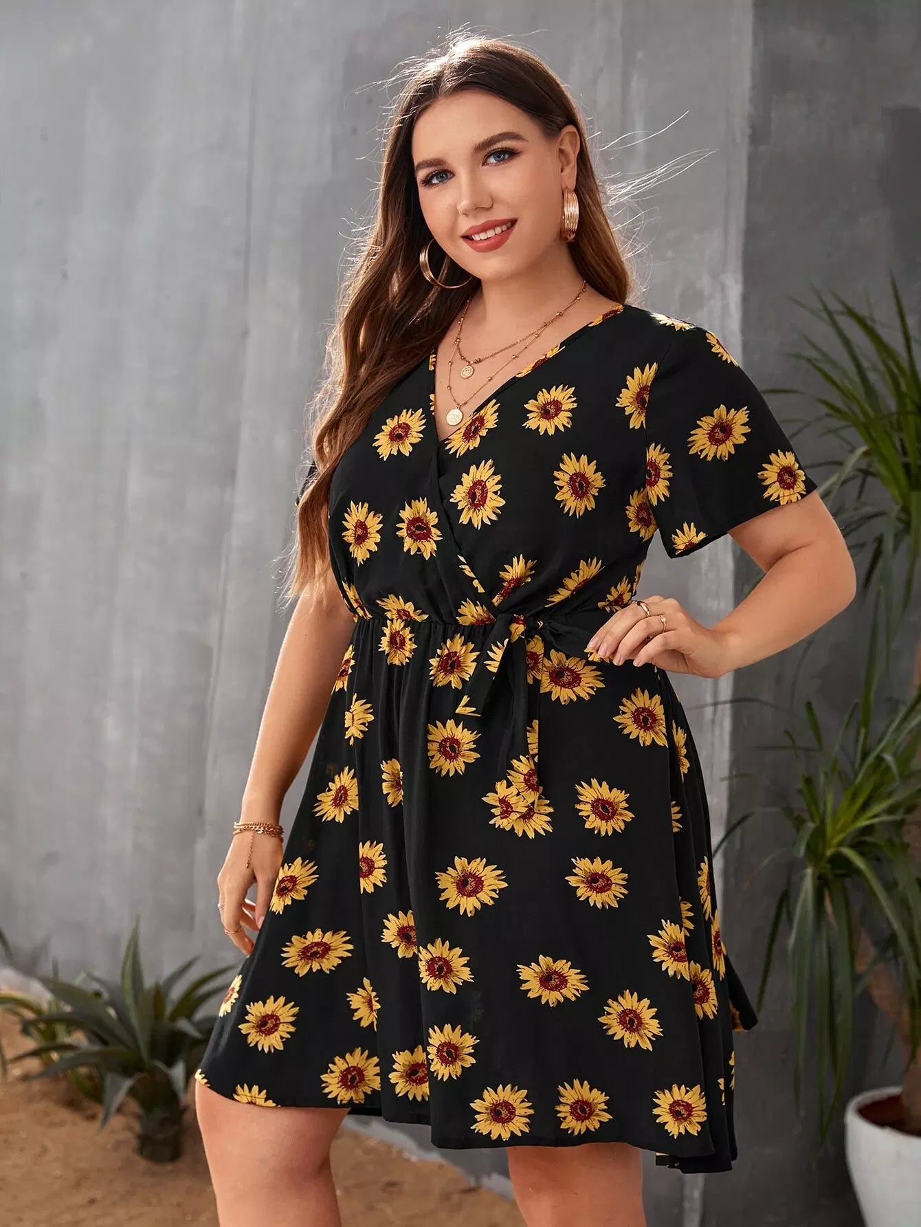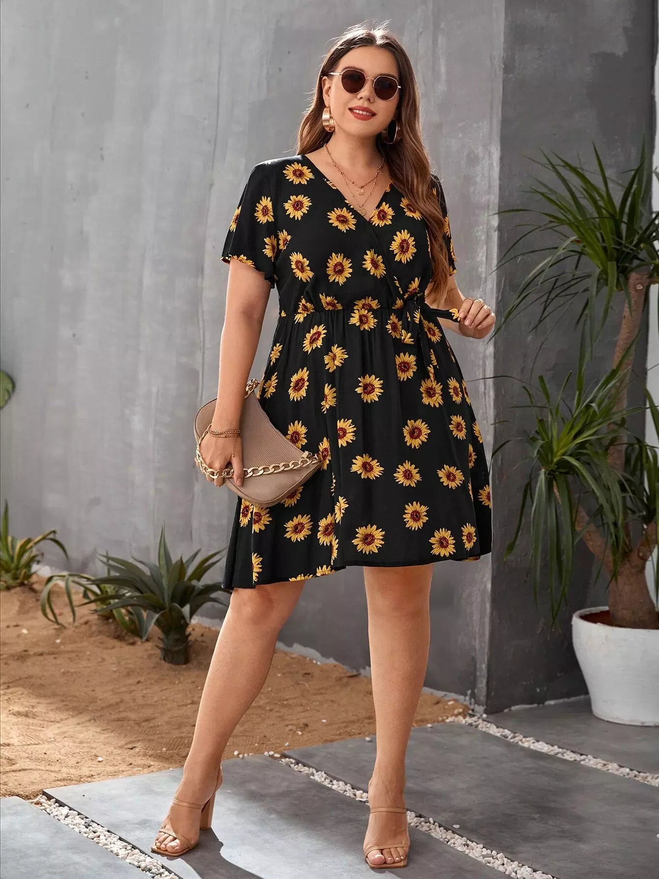 فستان مزين بطبعة دوار الشمس مطبوع عليه عقدة جانبية