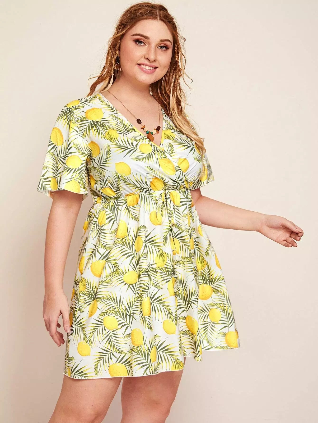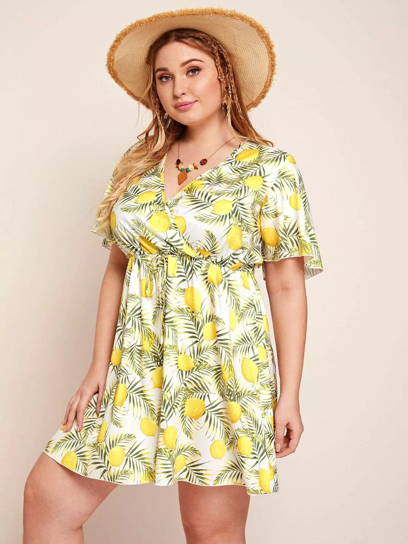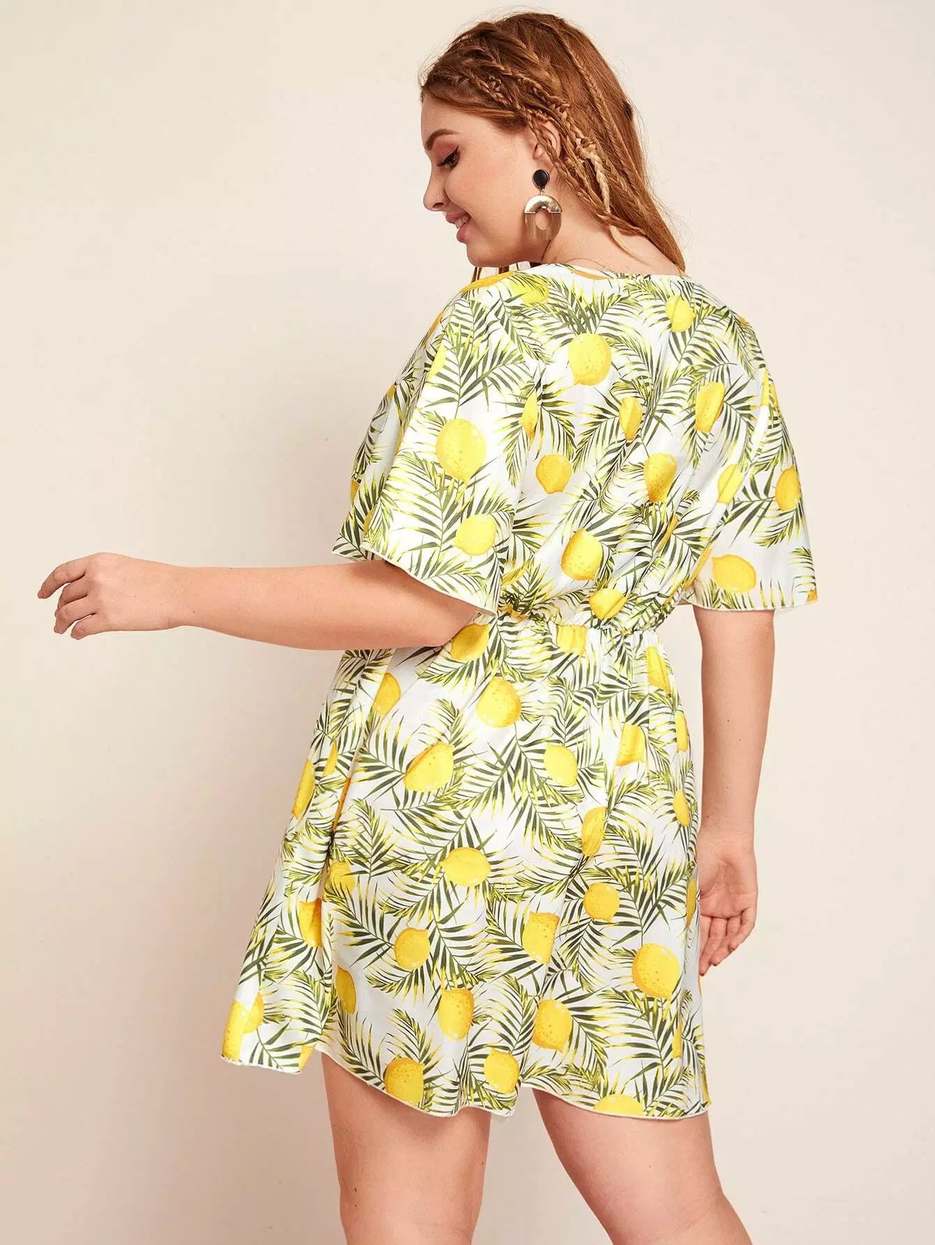 فستان مطبوع بربطة خصر زائد بطبعة فاكهة واستوائية
