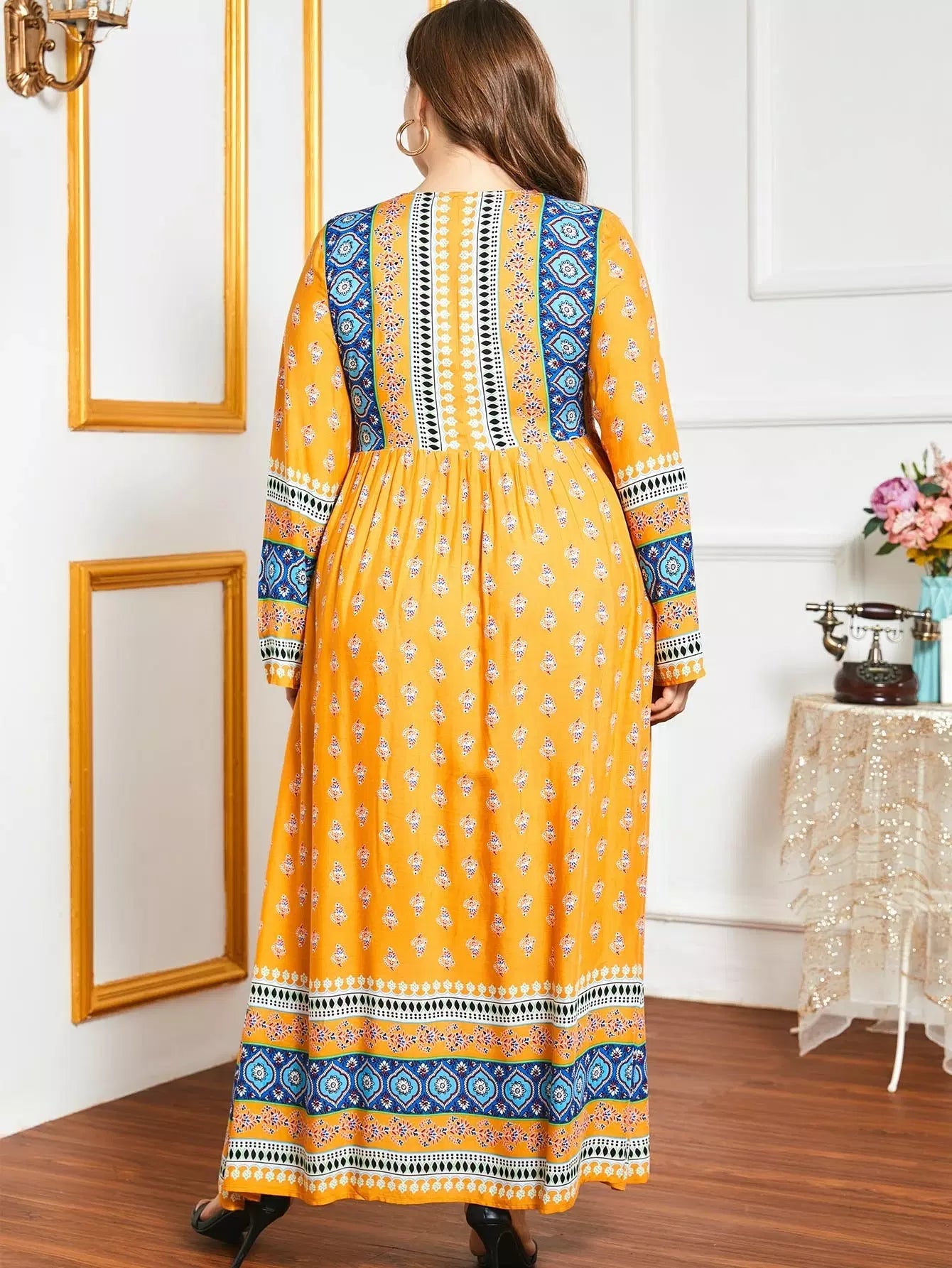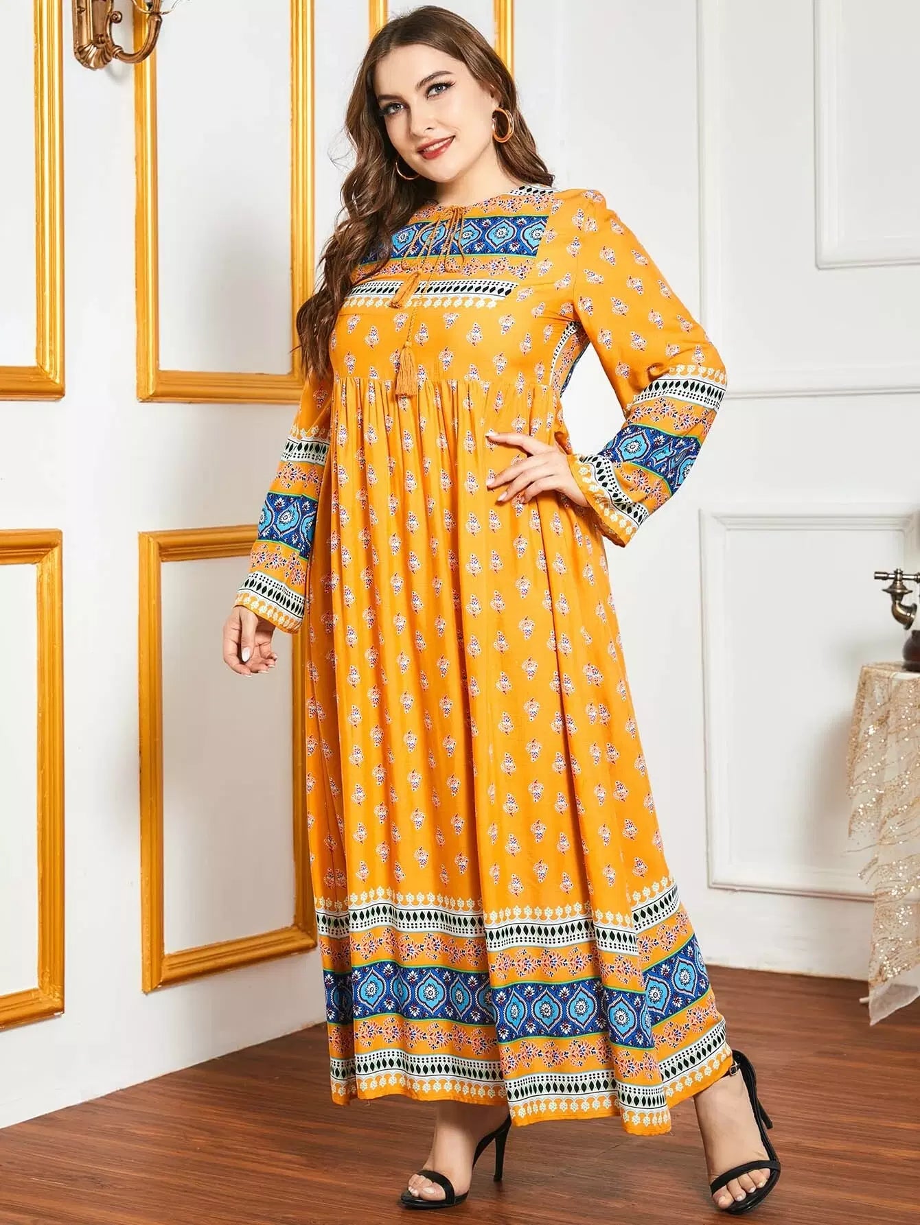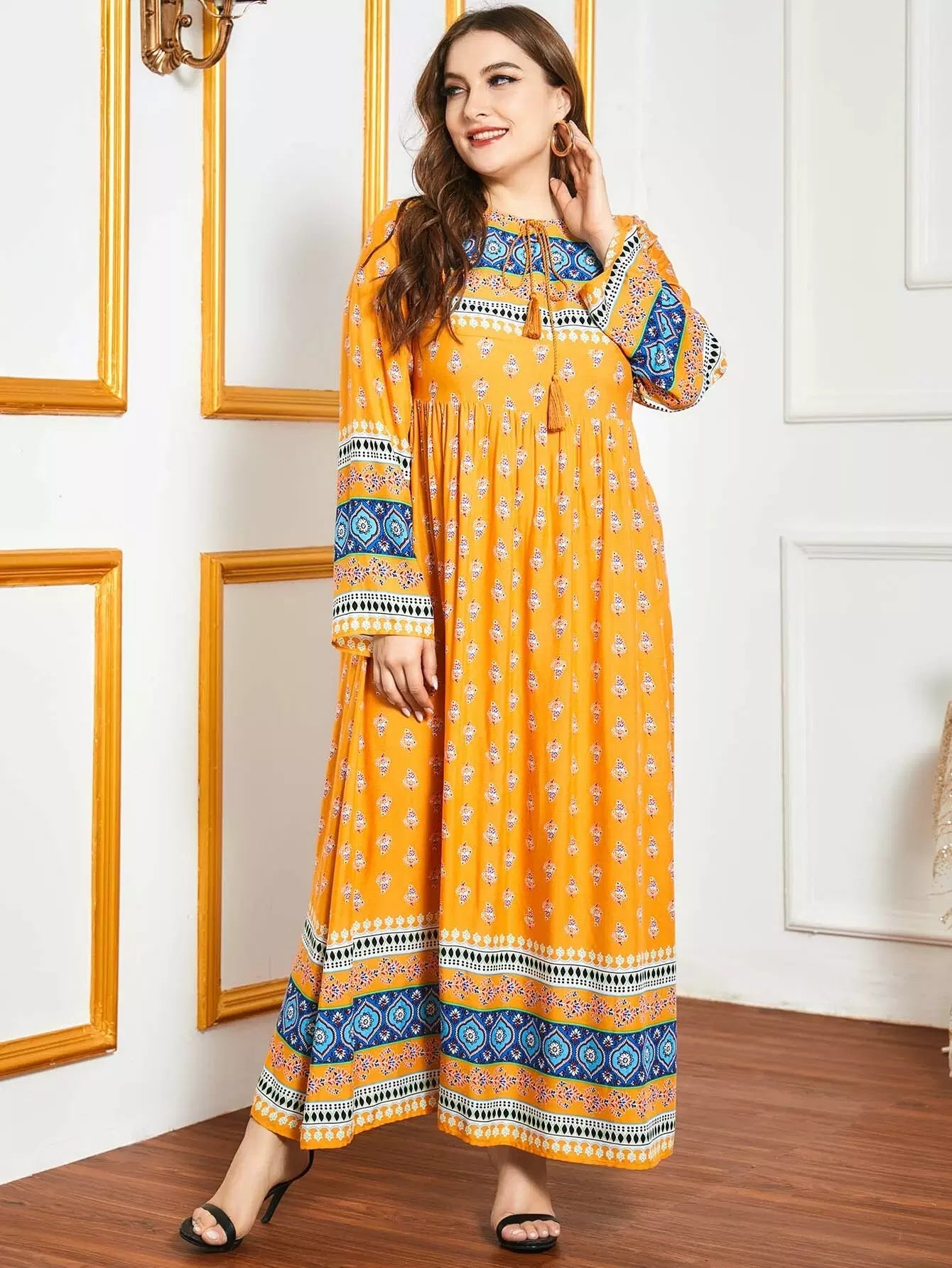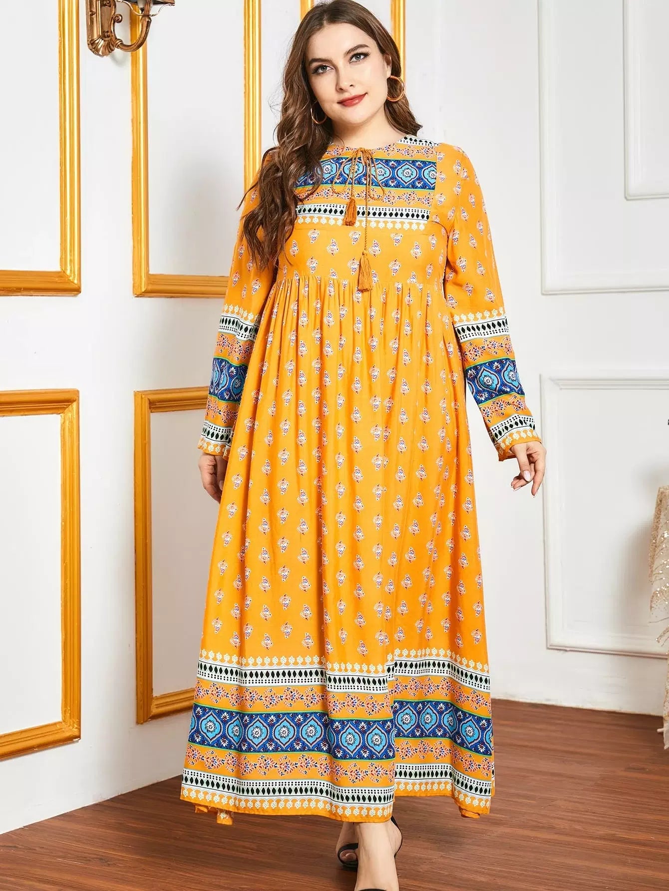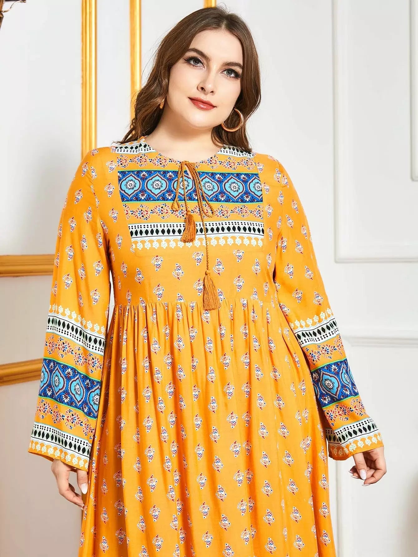 فستان مزين بطبعات قبلية مزين بشرابة على شكل ربطة عنق على شكل حرف A