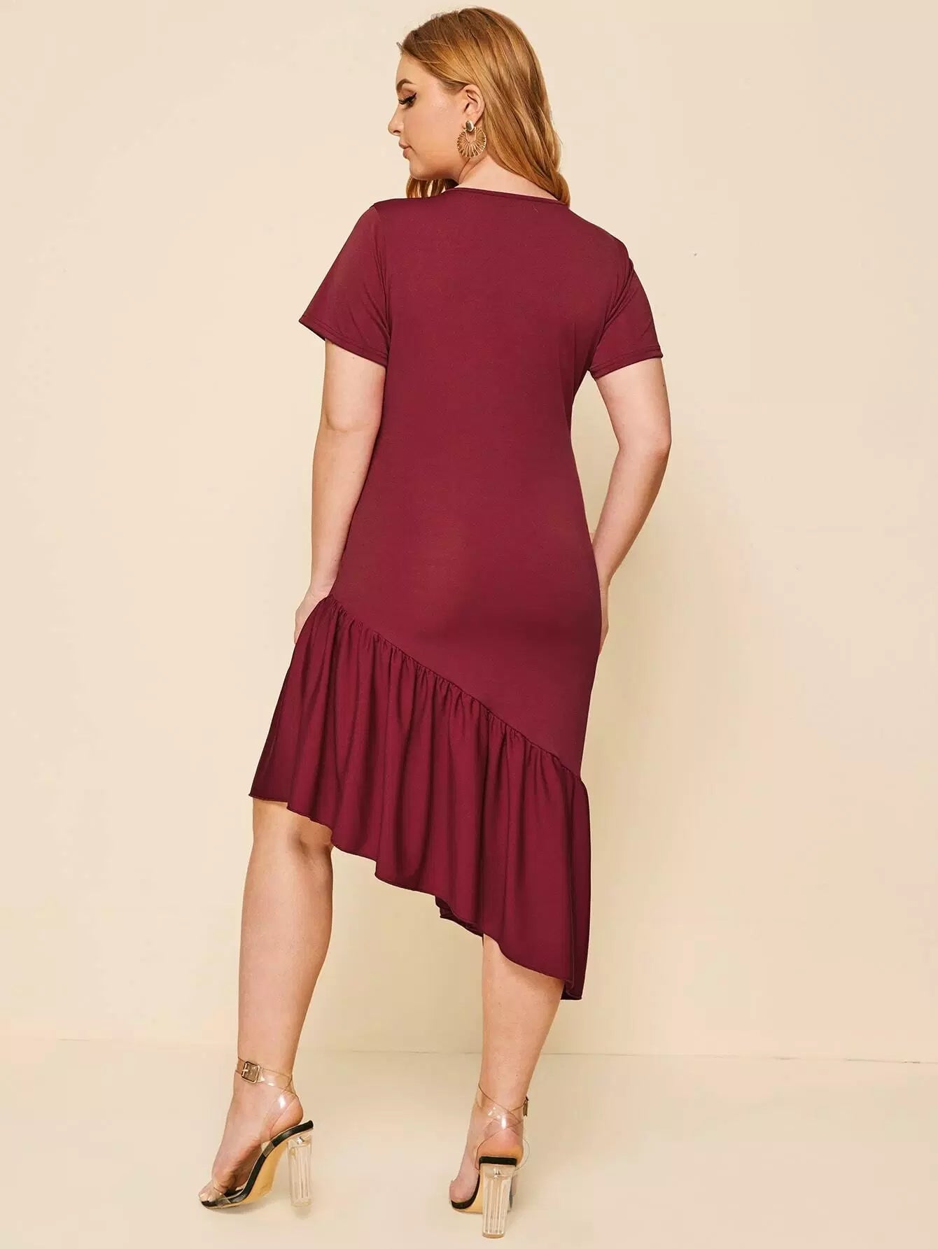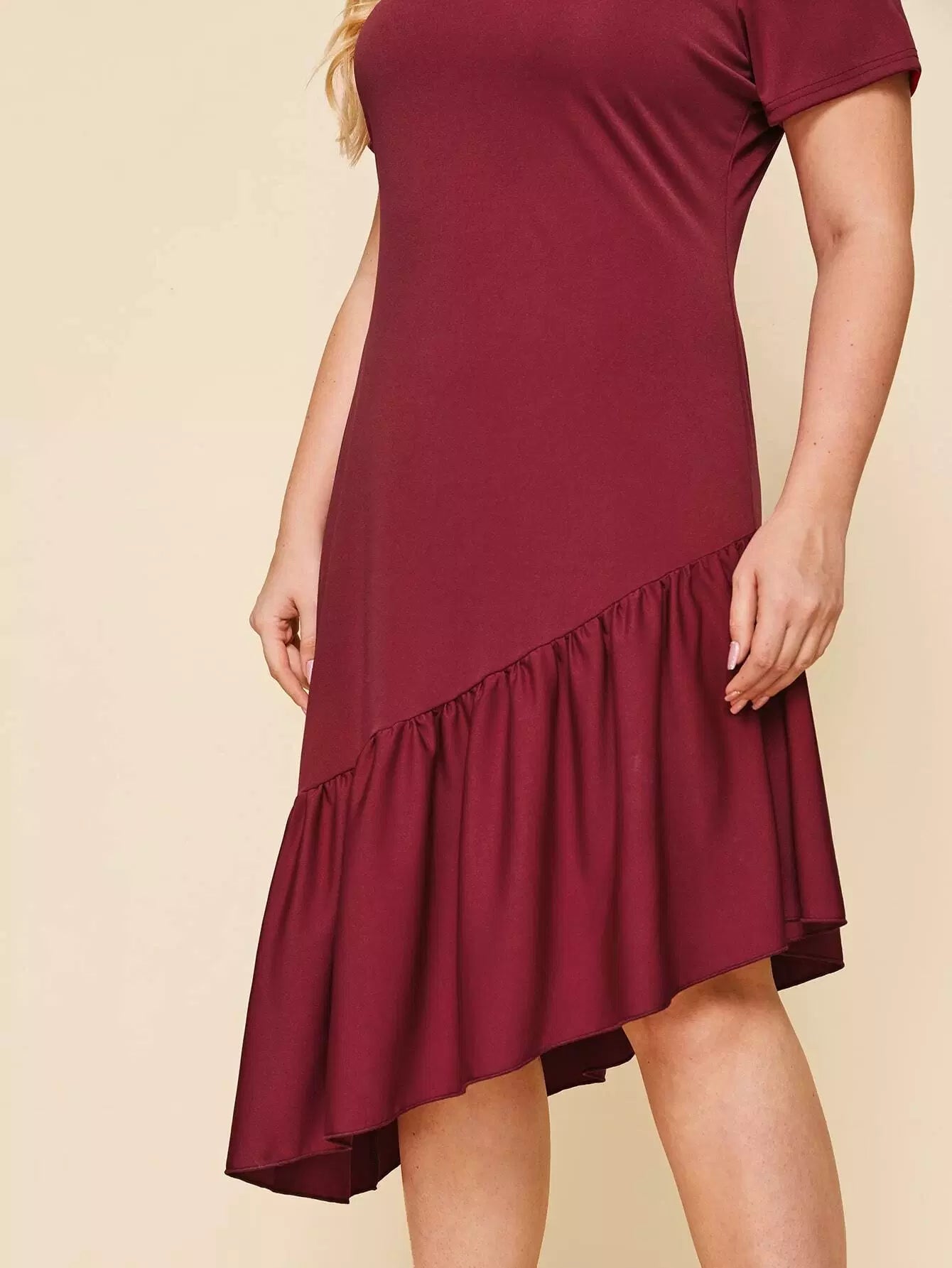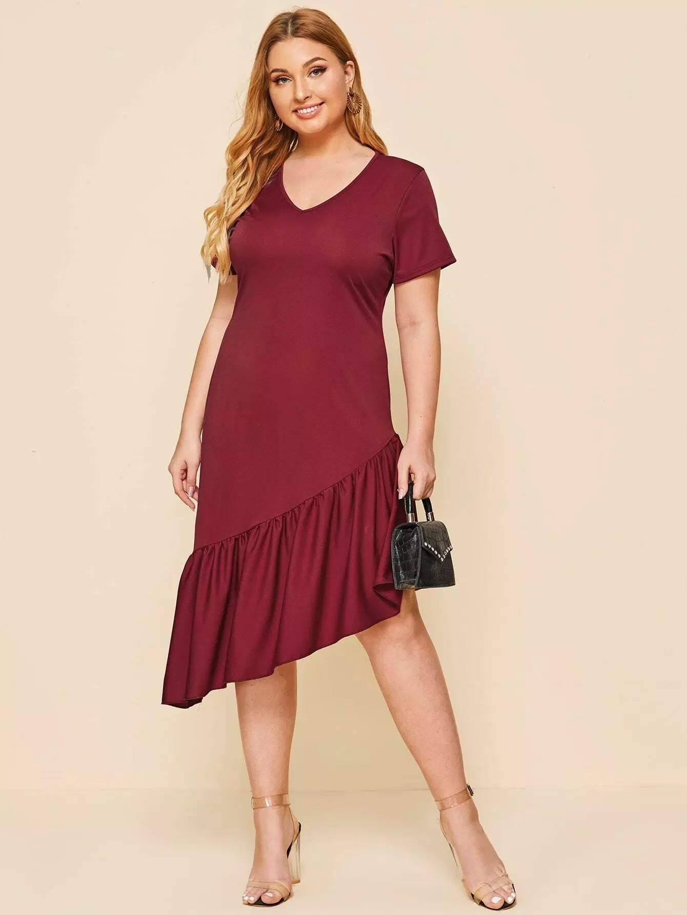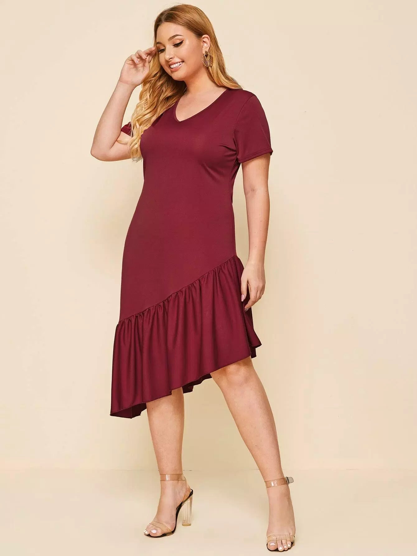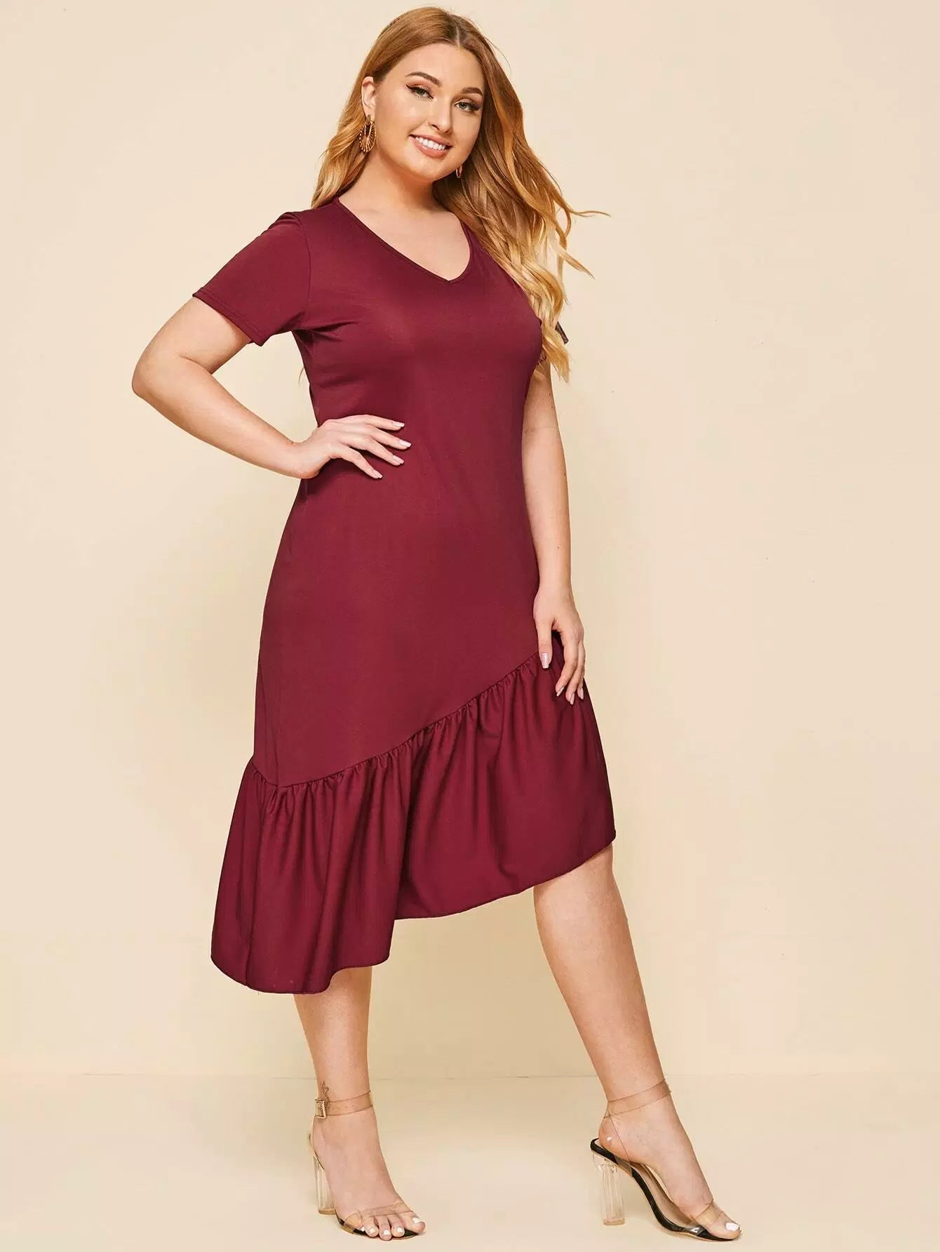 فستان بياقة على شكل حرف V غير متناسق بحافة كشكش زائد