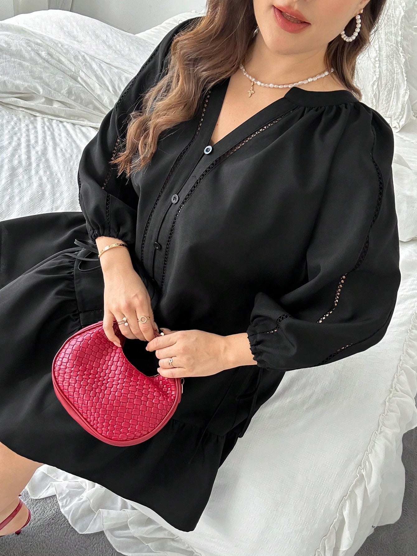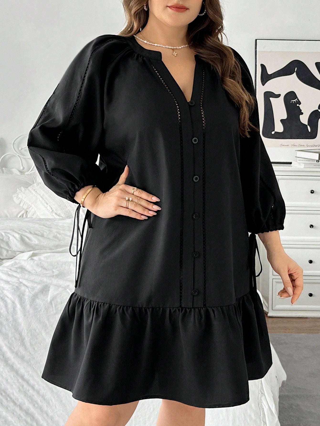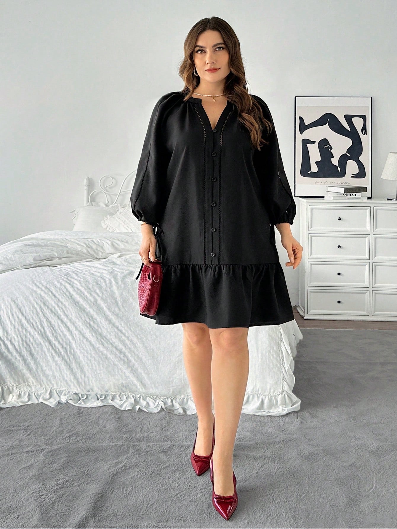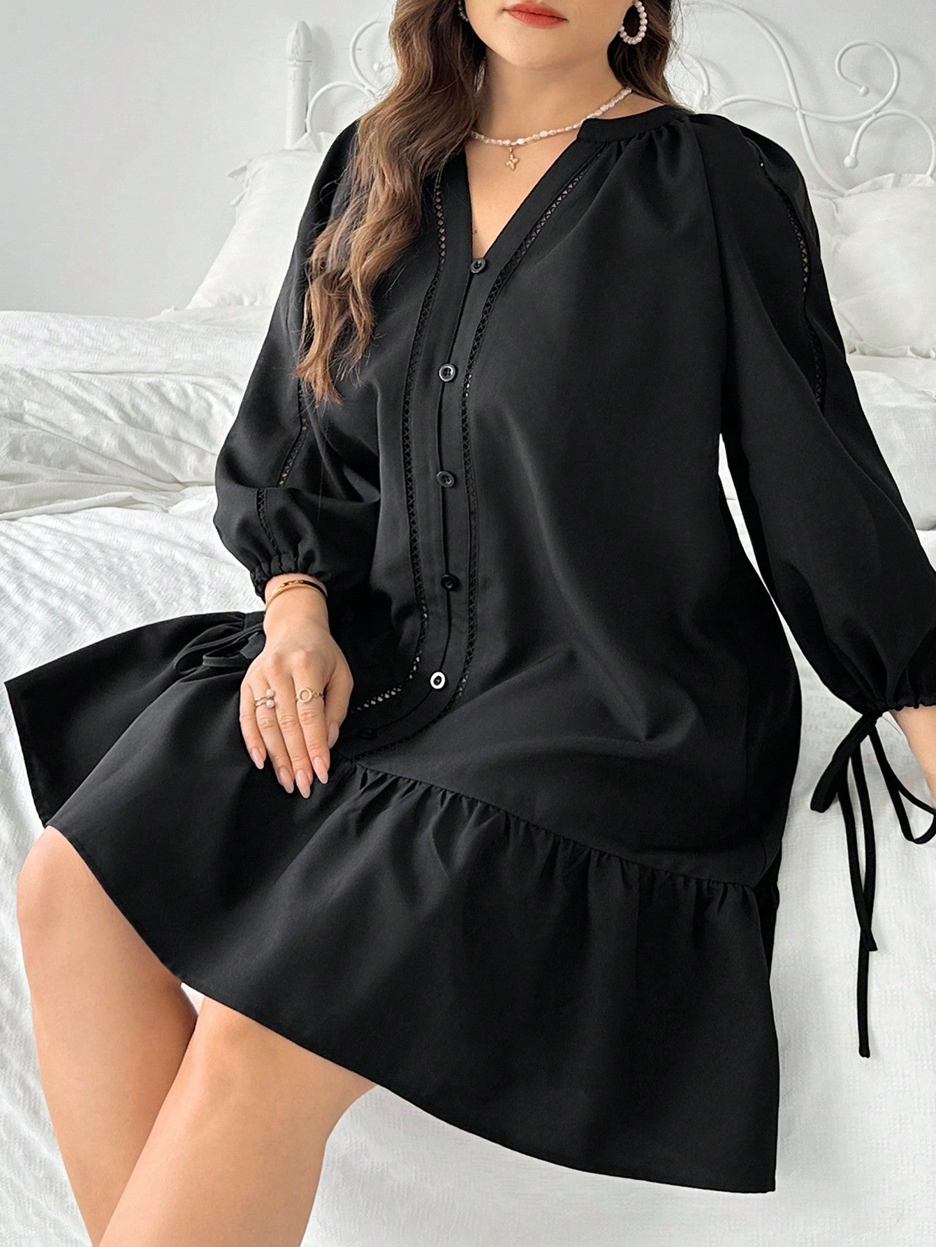 women SHEIN Privï؟½ Plus Size V-Neck Shirt Style Short Loose A-Line Ruffle Hem Long Sleeve Casual Spring Autumn Dress