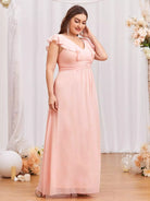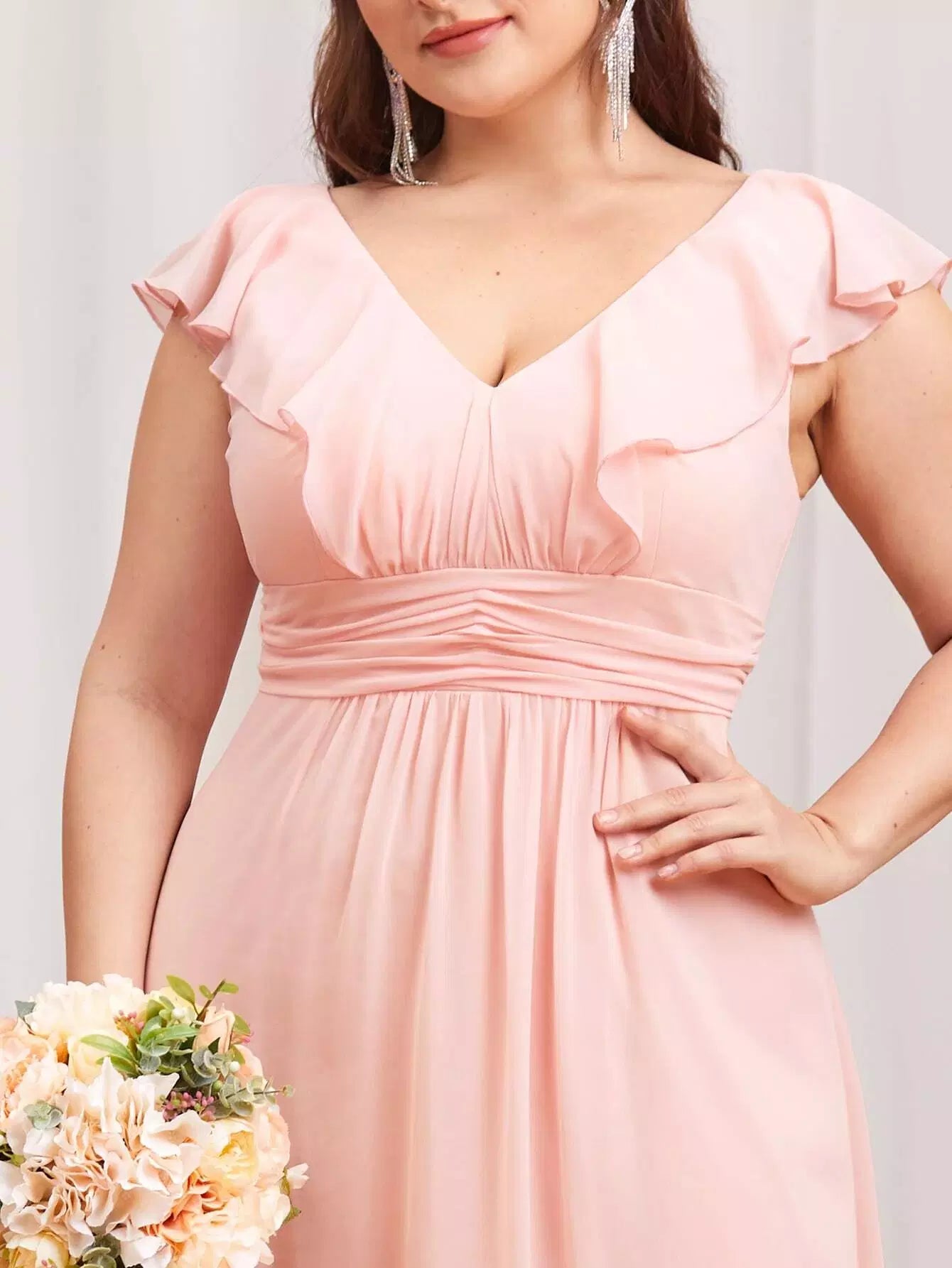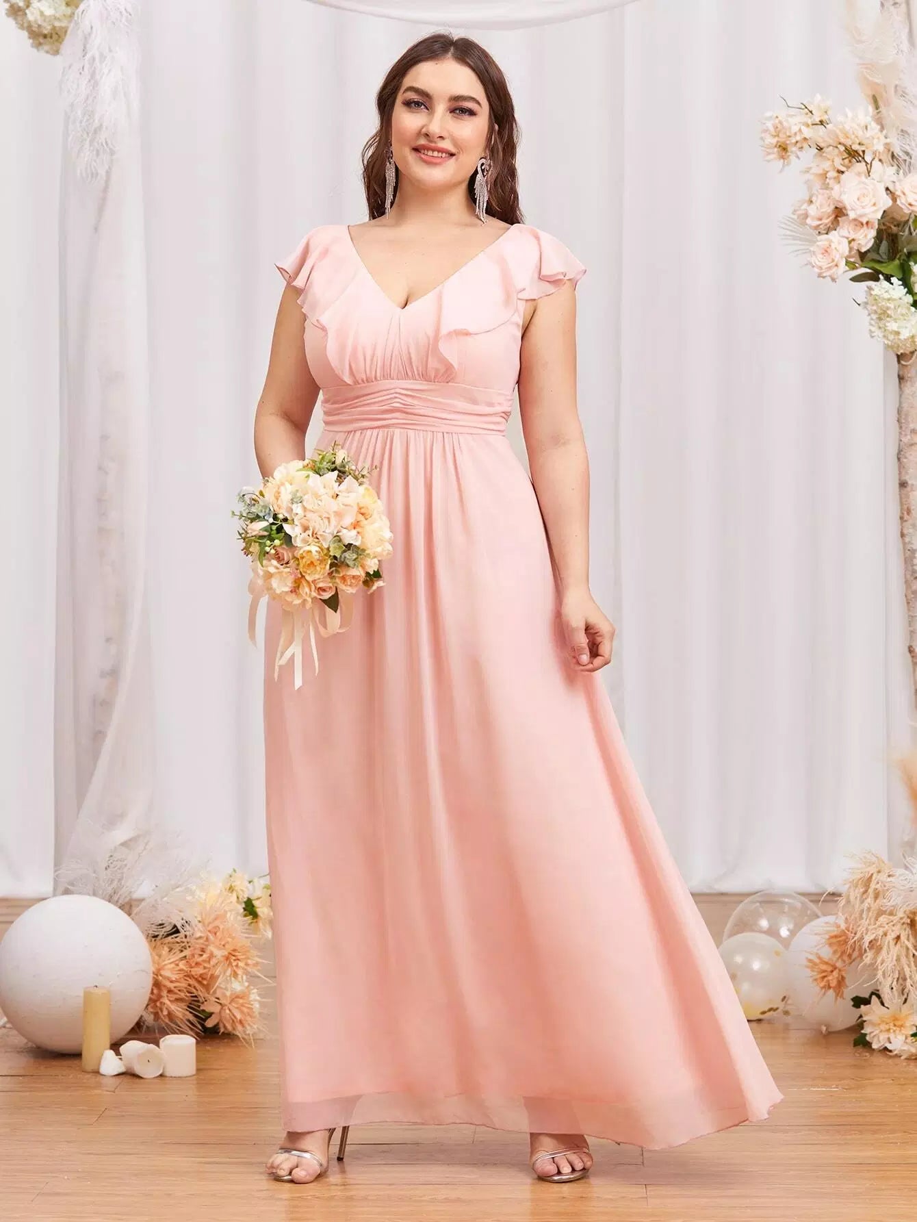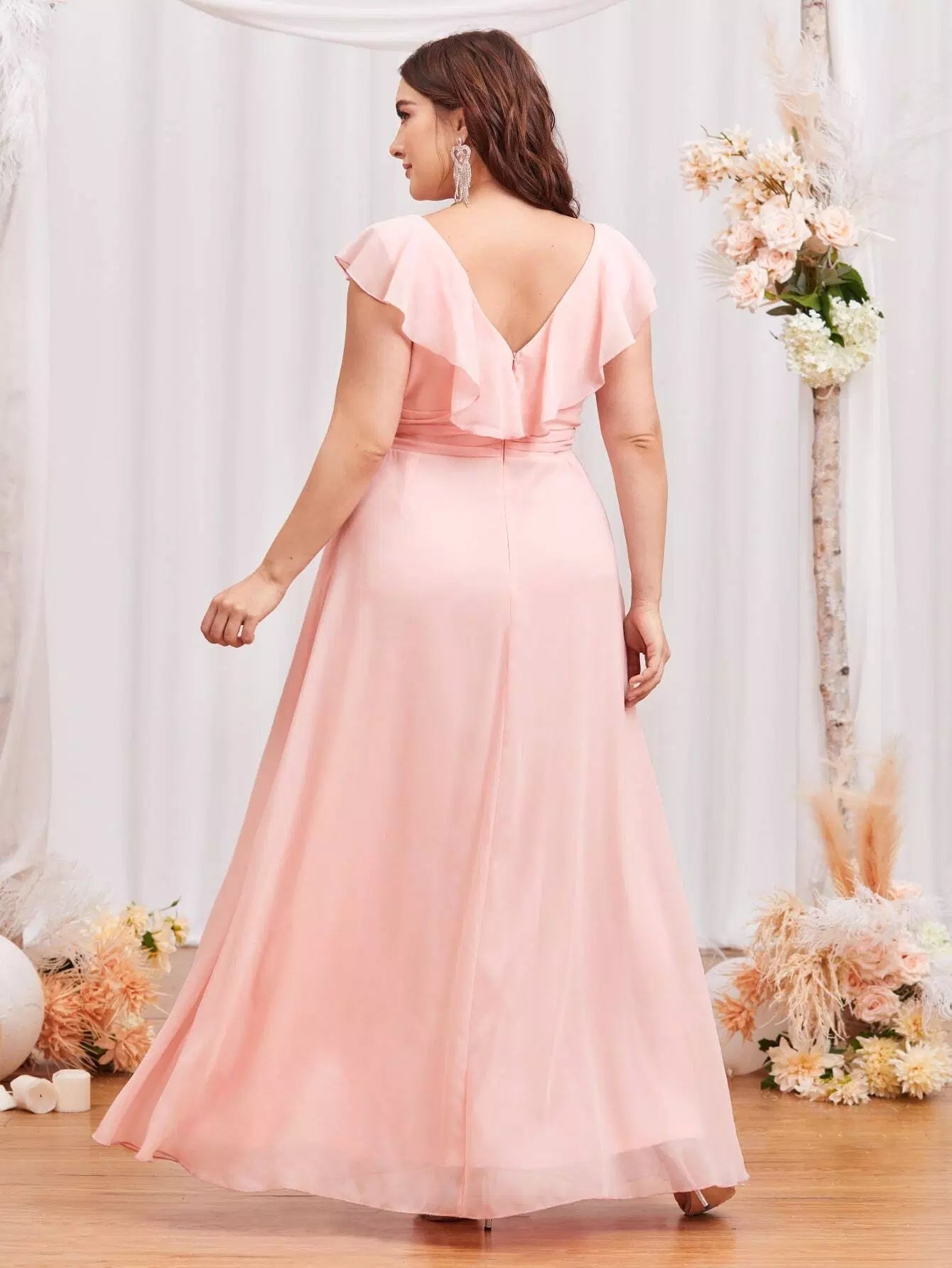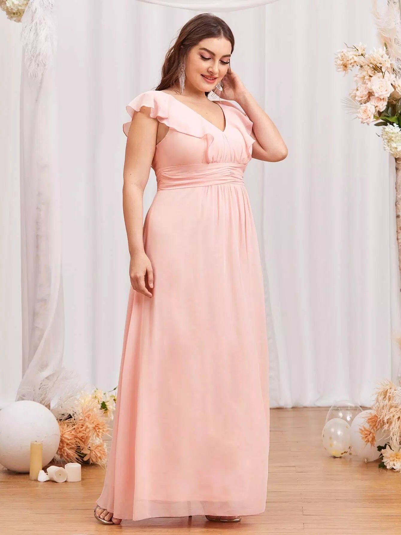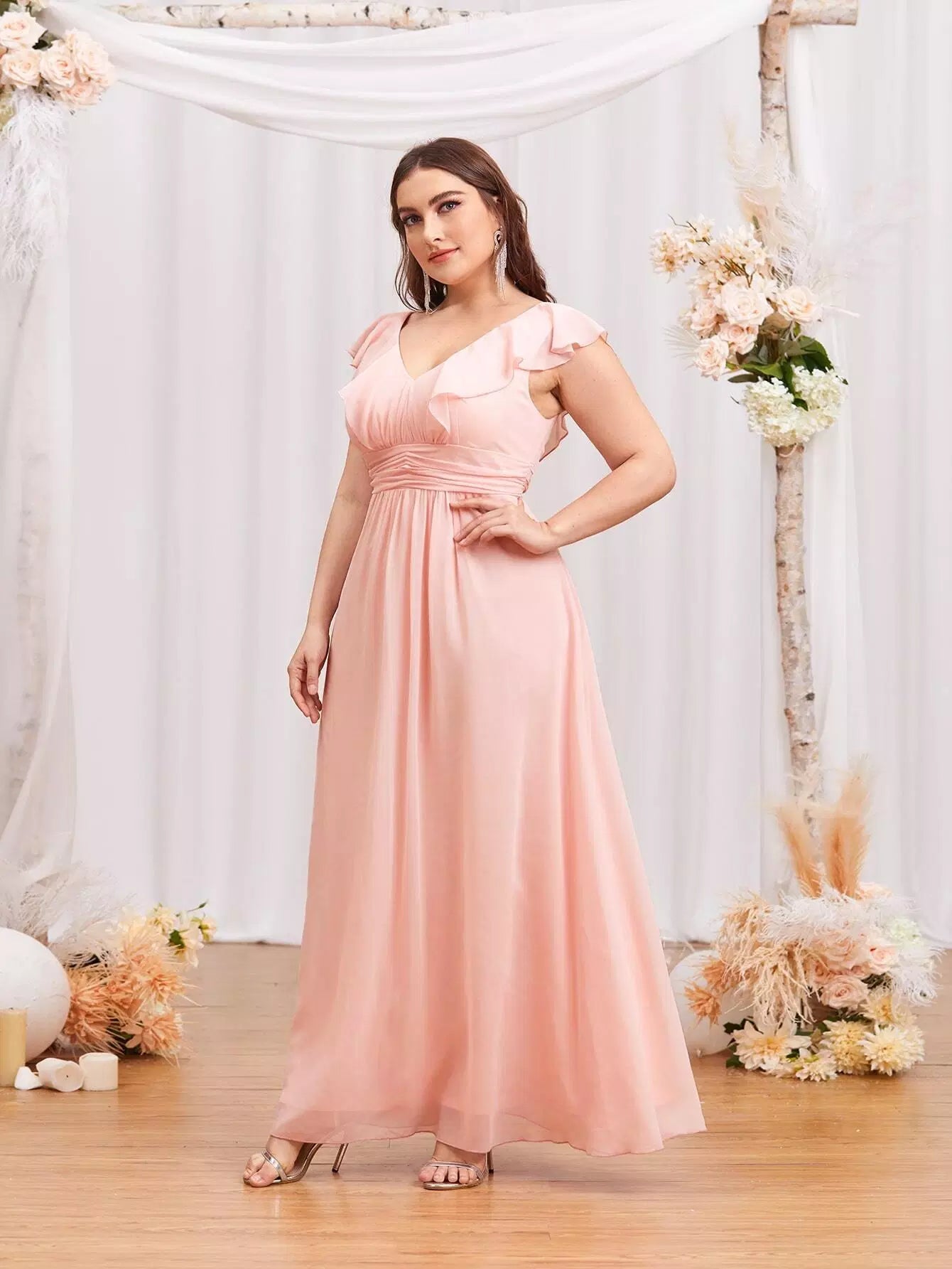فستان طويل مكشكش بياقة مزدوجة على شكل حرف V مزدوج من الشيفون